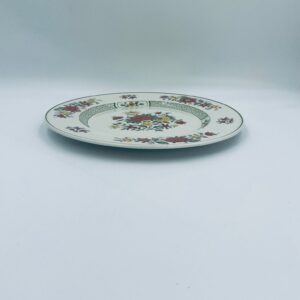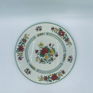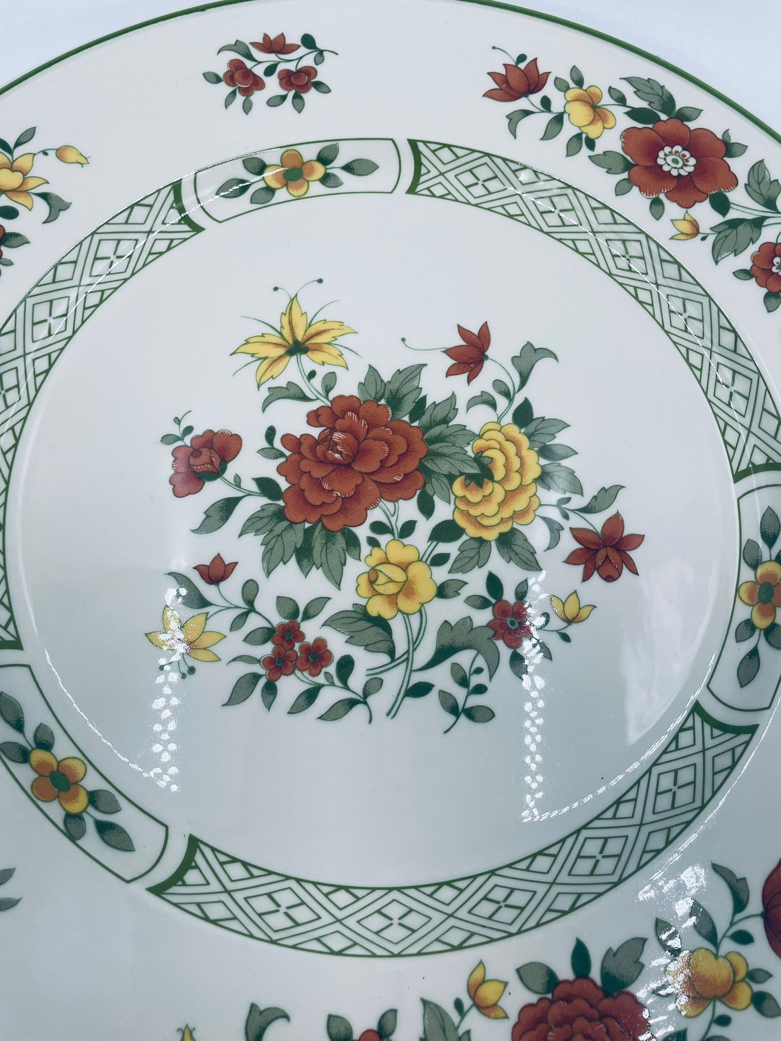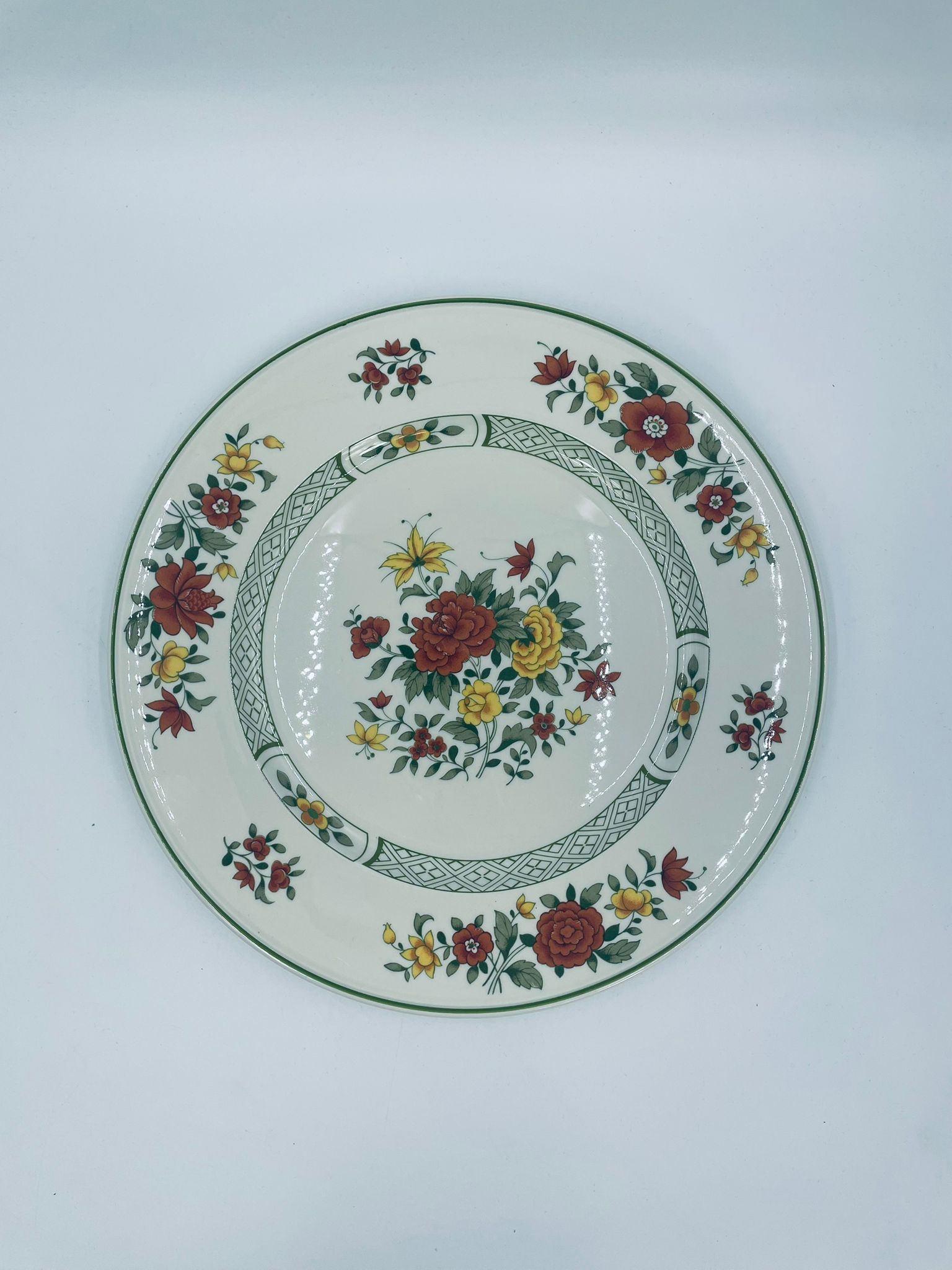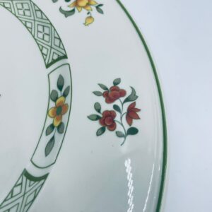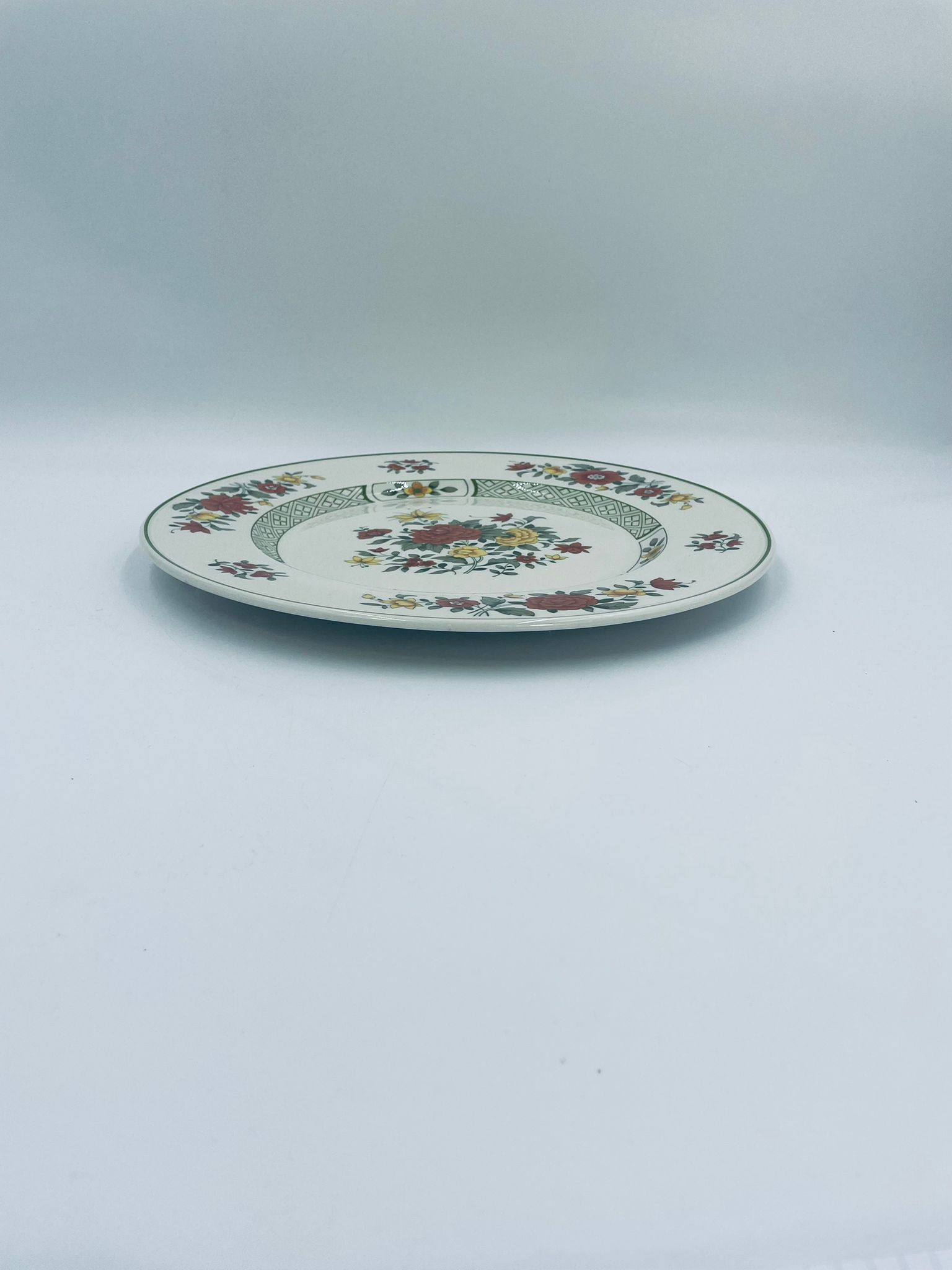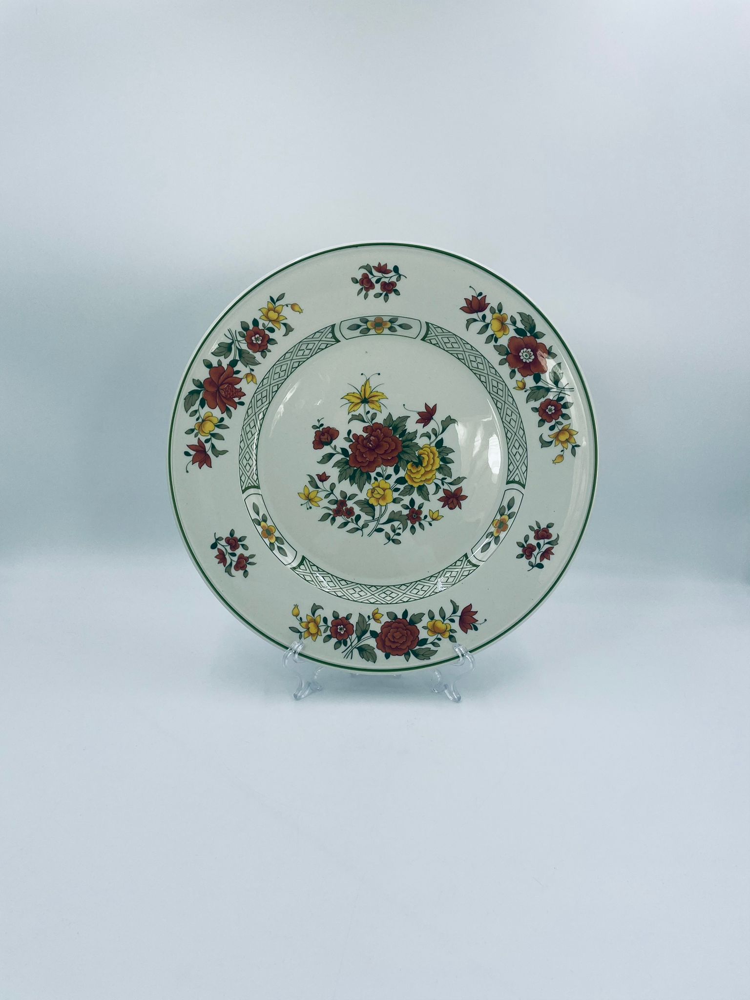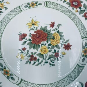 Duży talerz, patera renomowanej wytwórni Villeroy&Boch z kolekcji Summerday produkowanej od 1748r, wykonana z wysokiej jakości porcelany. Talerz charakteryzuje się kwiatowym motywem w odcieniach czerwieni i żółci oraz zielonym wzorem geometrycznym, wykończony zieloną obwódką dookoła rantu.