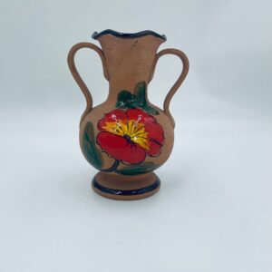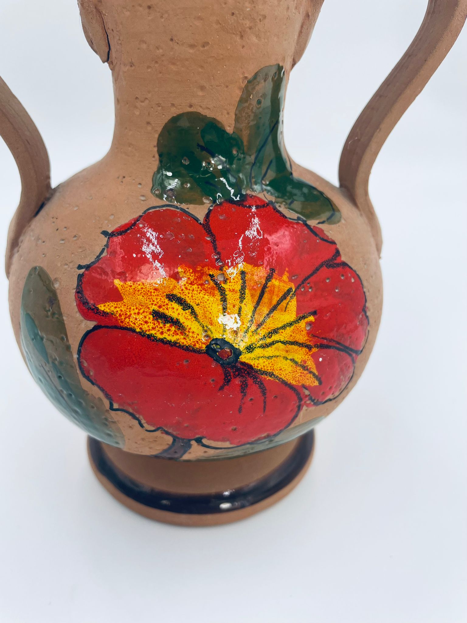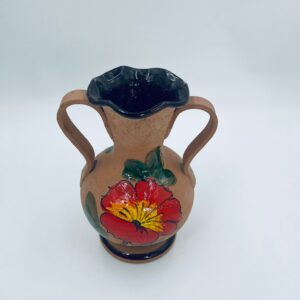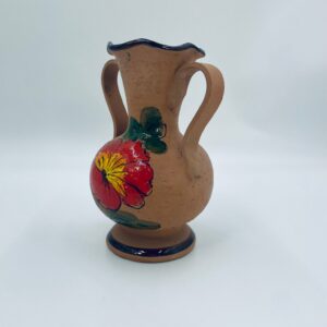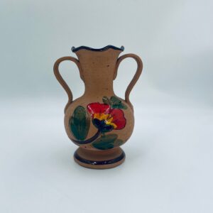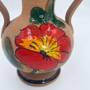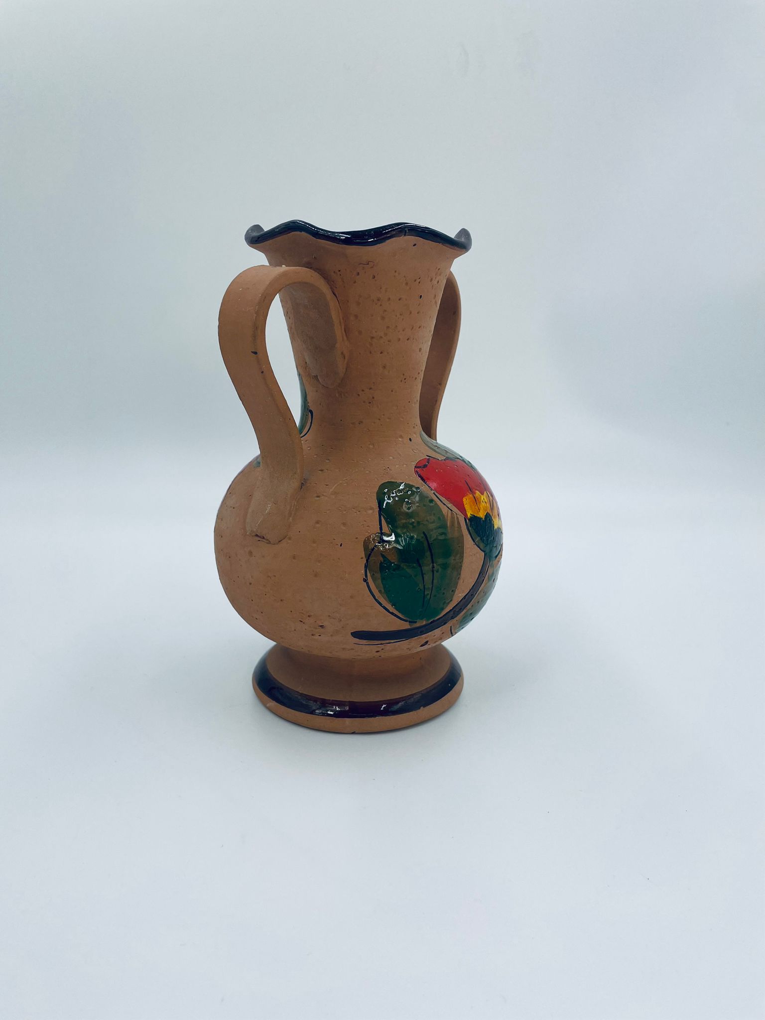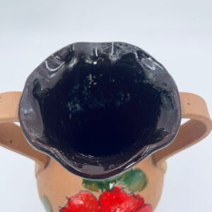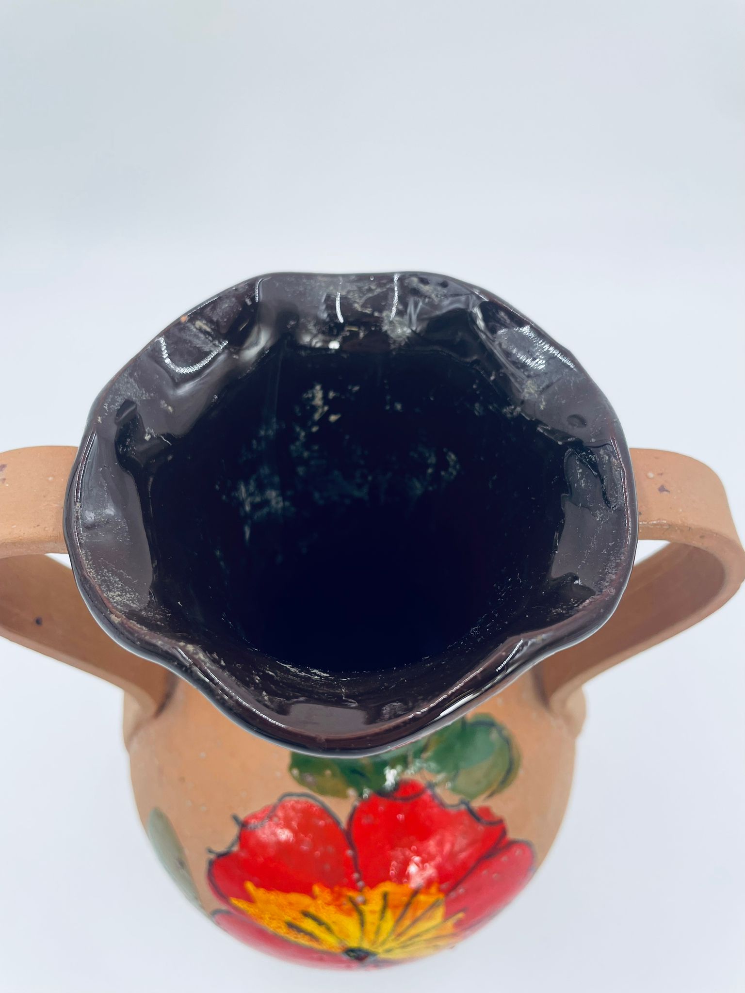 Dzban, wazon dekoracyjny w stylu Rustykalnym, wykonany z gliny. Wazon posiada dwa uchwyty, falisty, brązowy i szkliwiony górny brzeg oraz podstawę z brązowym paskiem, ozdobiony jest ręcznie malowanym wzorem kwiatowym.