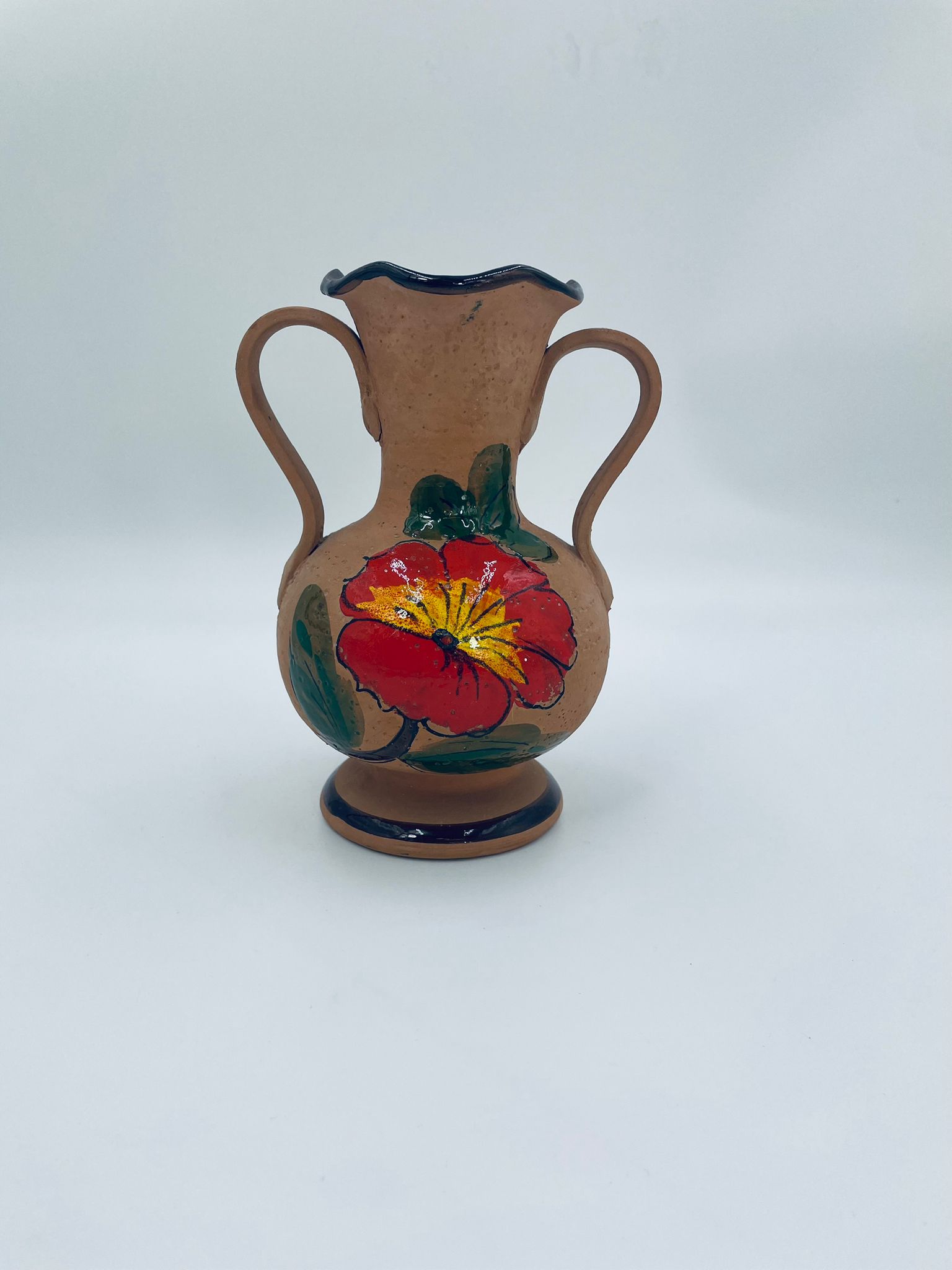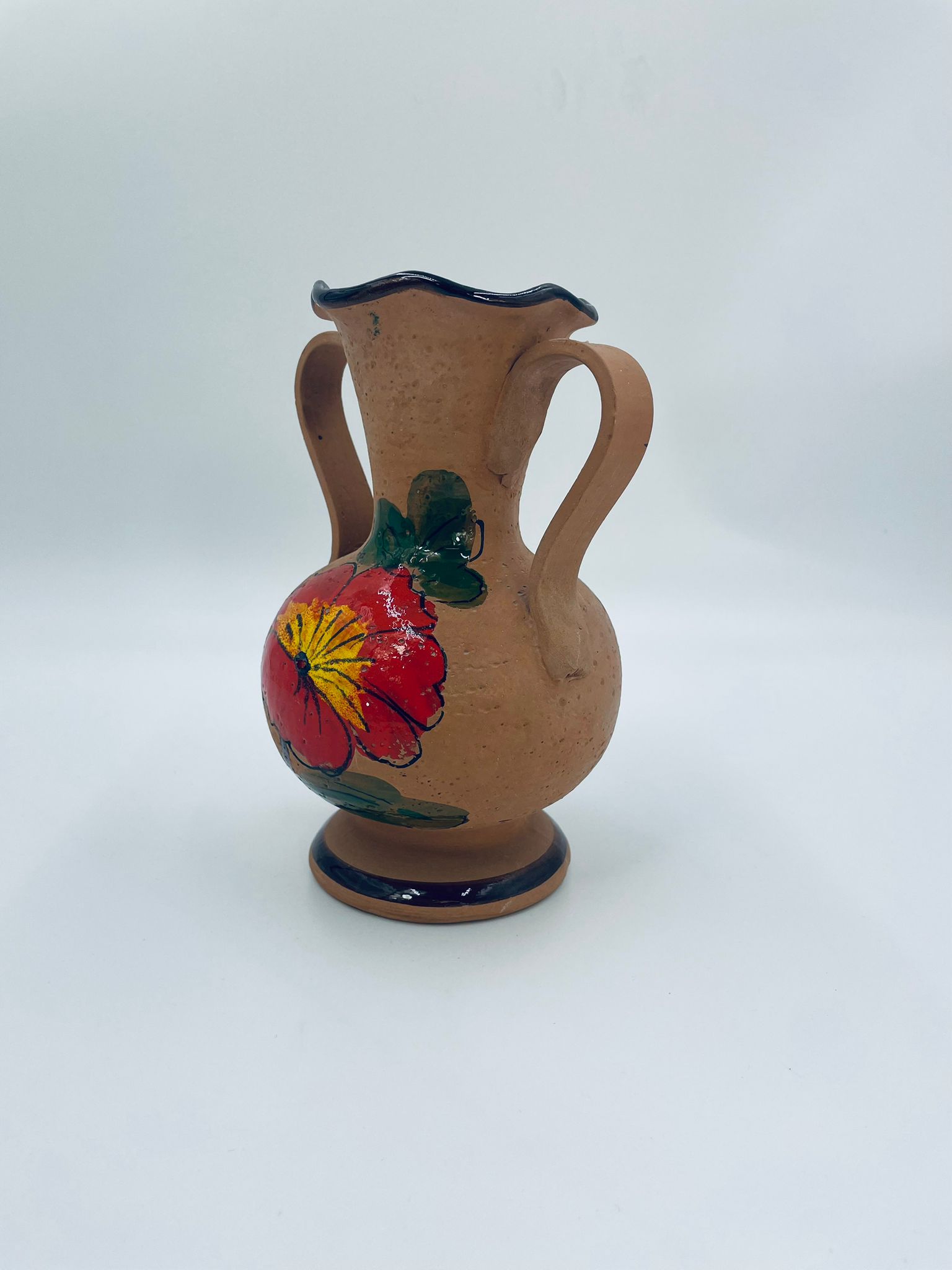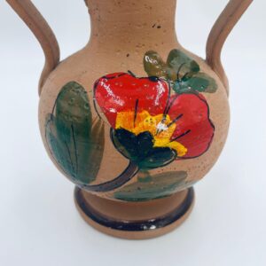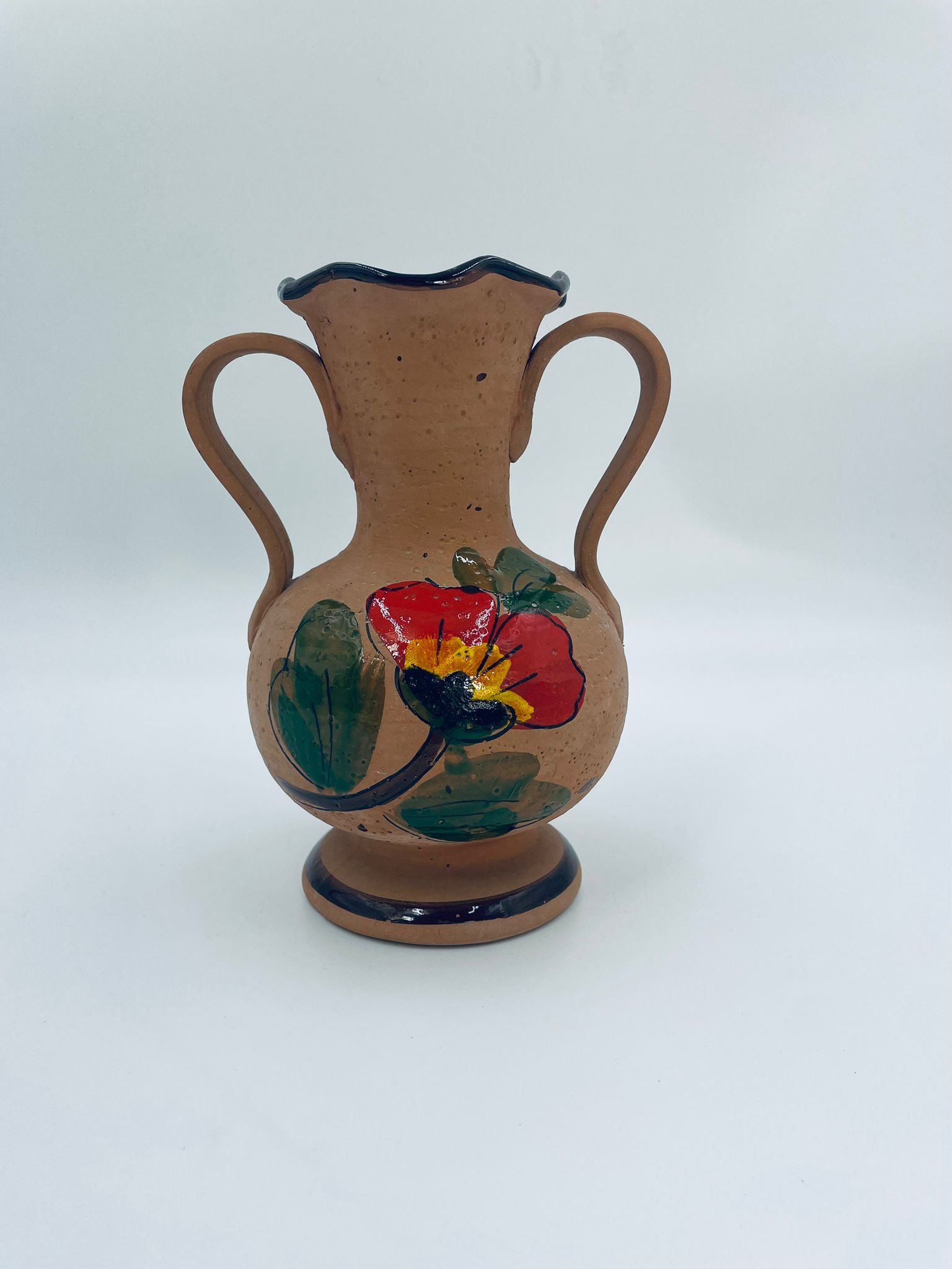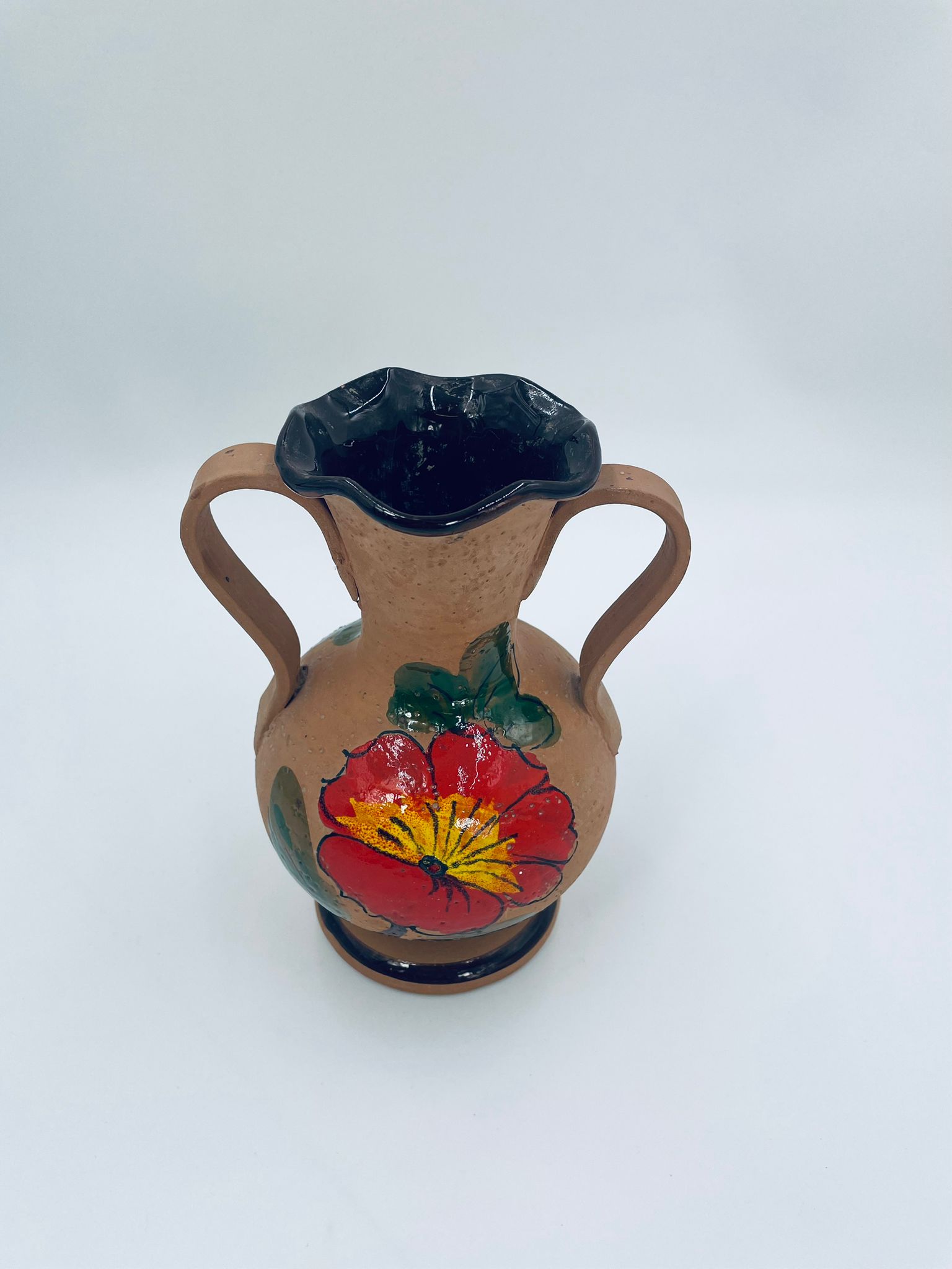 Dzban, wazon dekoracyjny w stylu Rustykalnym, wykonany z gliny. Wazon posiada dwa uchwyty, falisty, brązowy i szkliwiony górny brzeg oraz podstawę z brązowym paskiem, ozdobiony jest ręcznie malowanym wzorem kwiatowym.