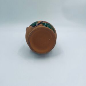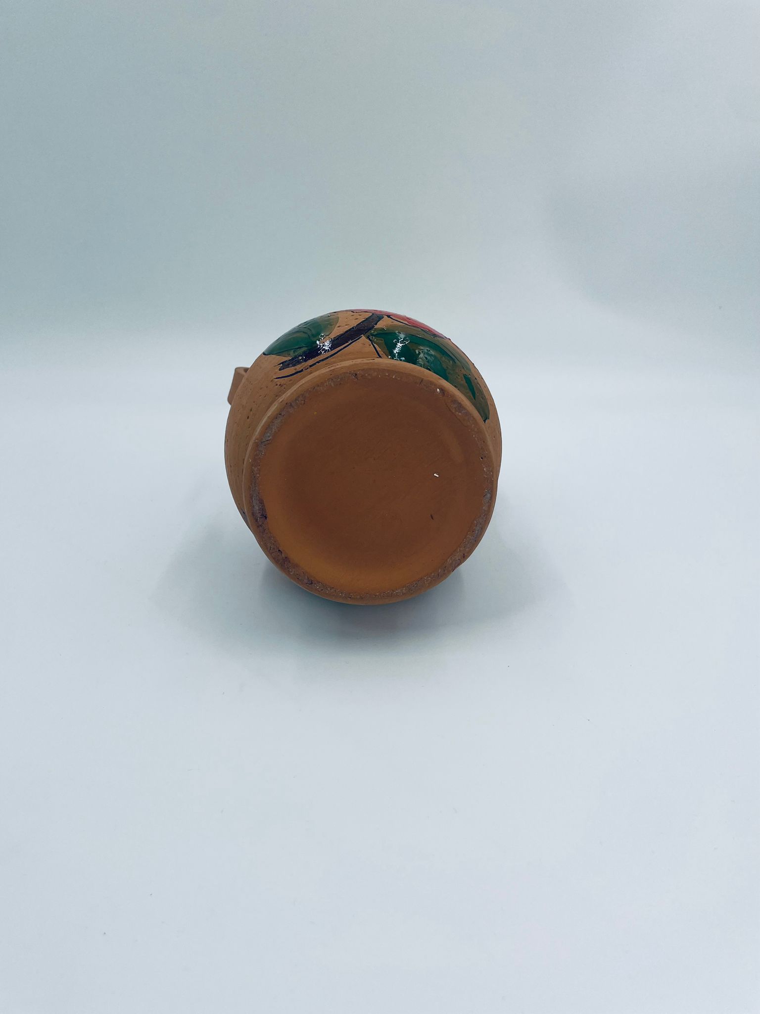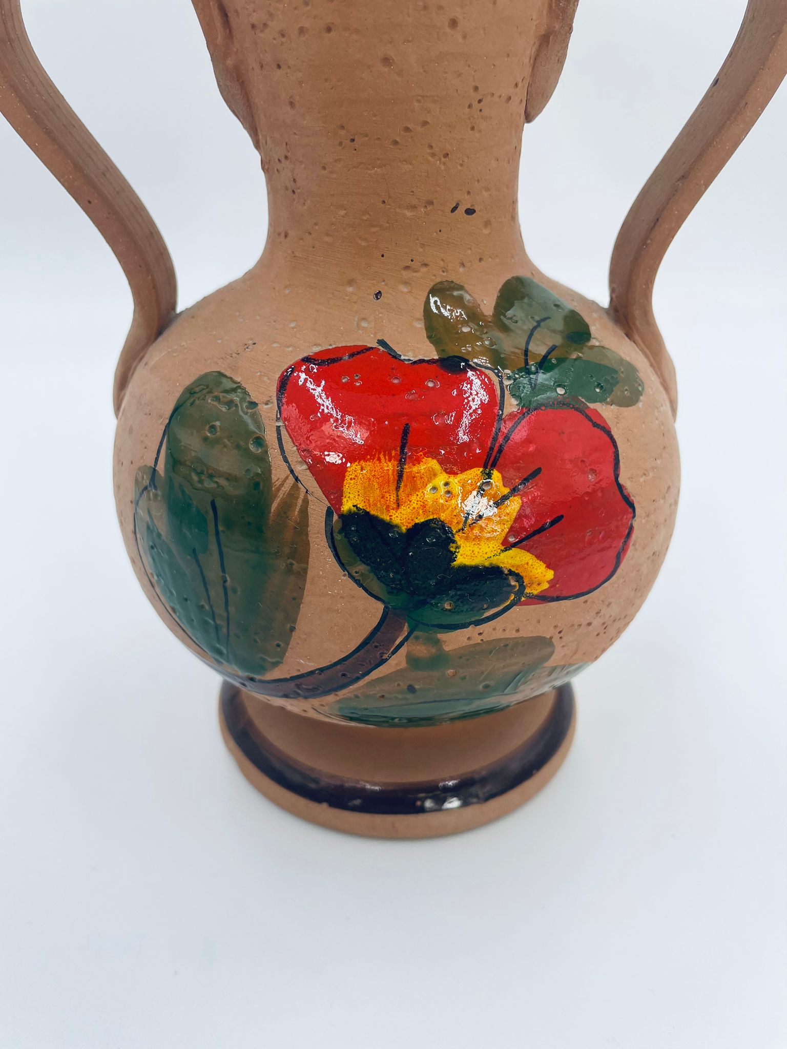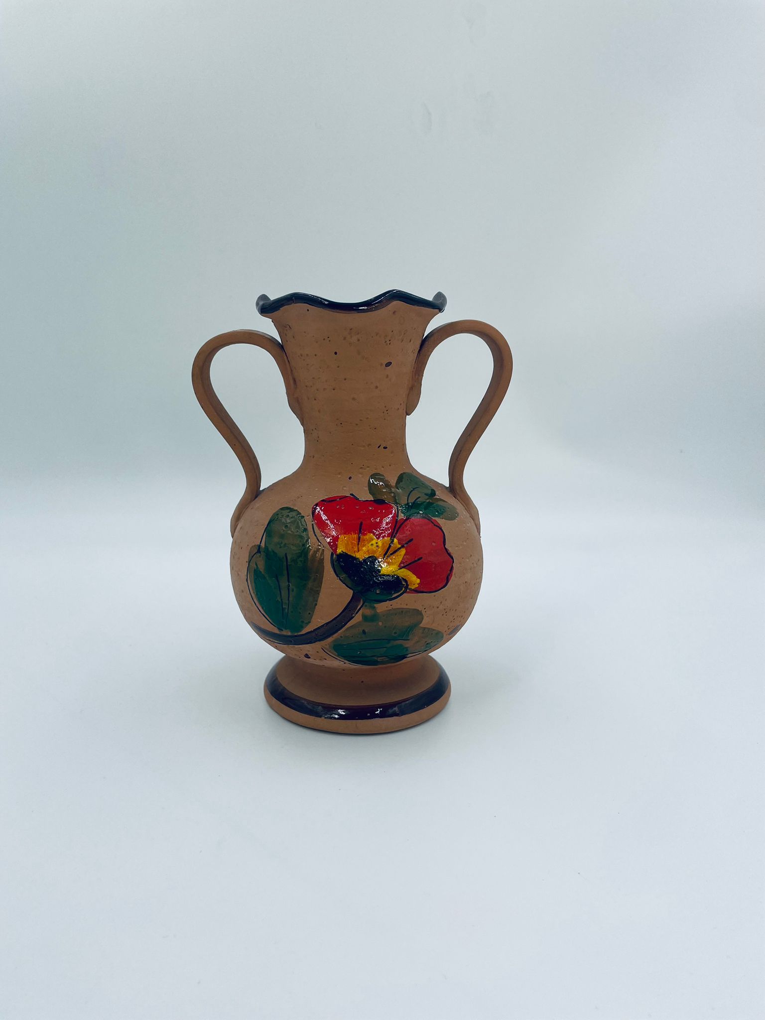 Dzban, wazon dekoracyjny w stylu Rustykalnym, wykonany z gliny. Wazon posiada dwa uchwyty, falisty, brązowy i szkliwiony górny brzeg oraz podstawę z brązowym paskiem, ozdobiony jest ręcznie malowanym wzorem kwiatowym.