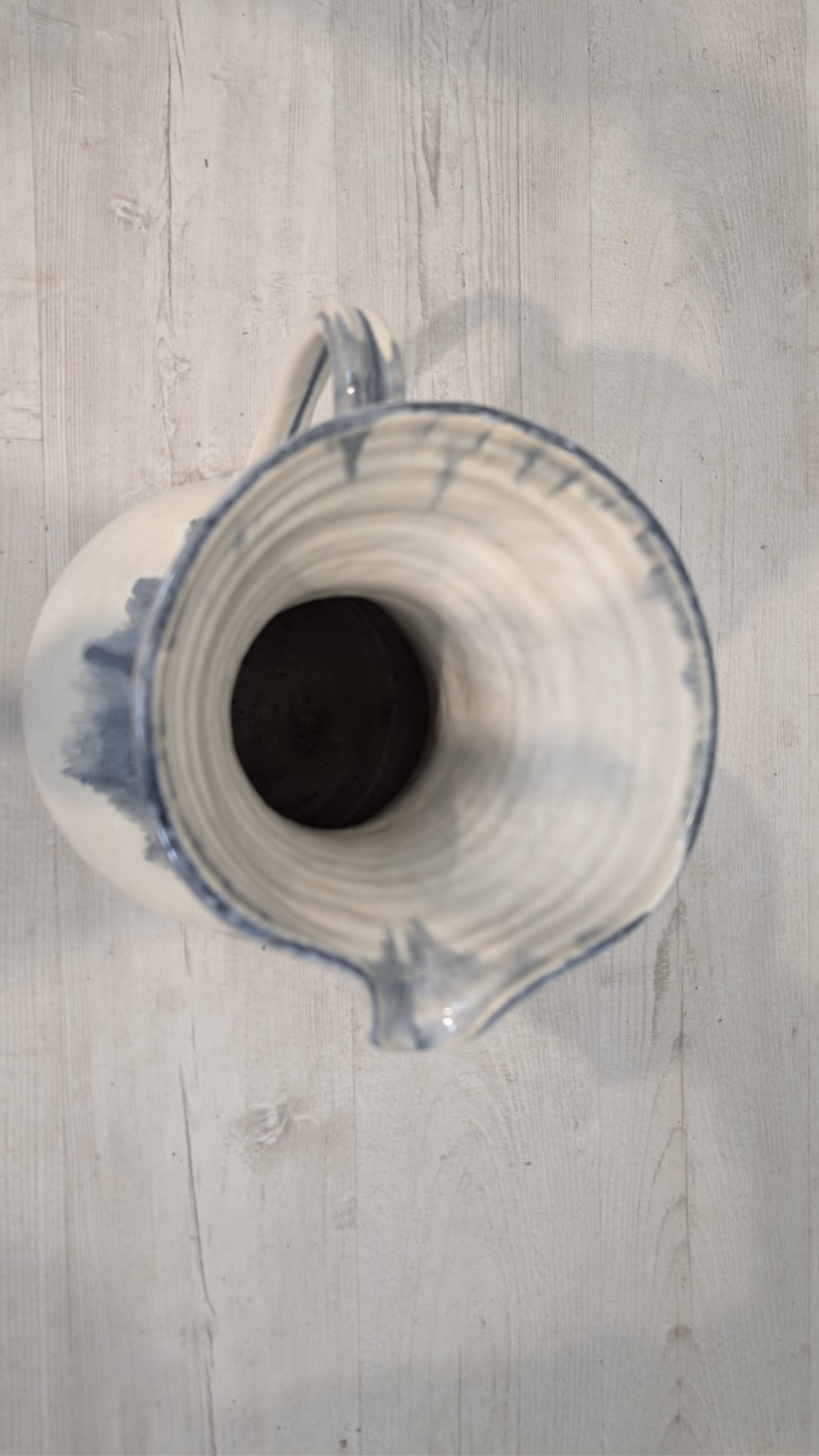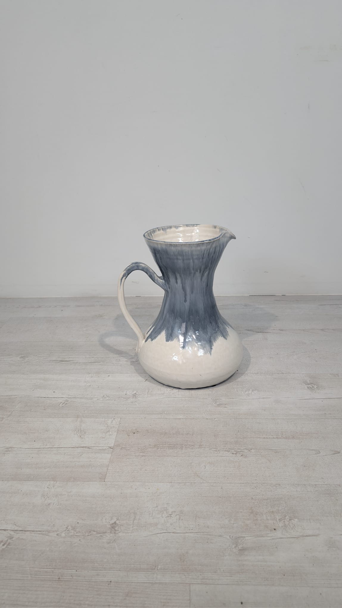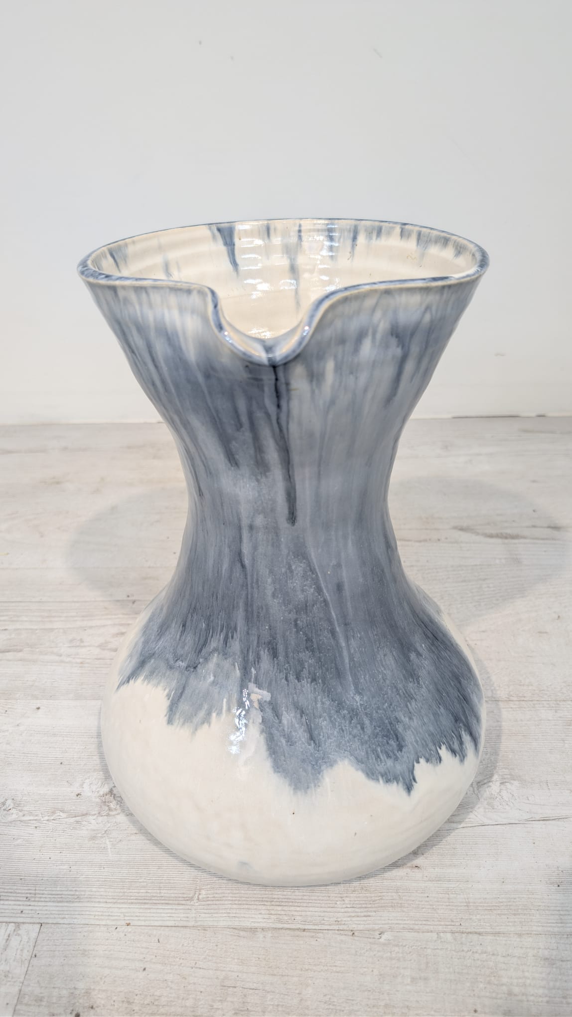 Elegancki, ceramiczny dzbanek lub wazon w stylu vintage. Posiada piękne, szaro-białe wykończenie z efektem drippingu. Idealny jako dekoracja wnętrza lub do przechowywania kwiatów.