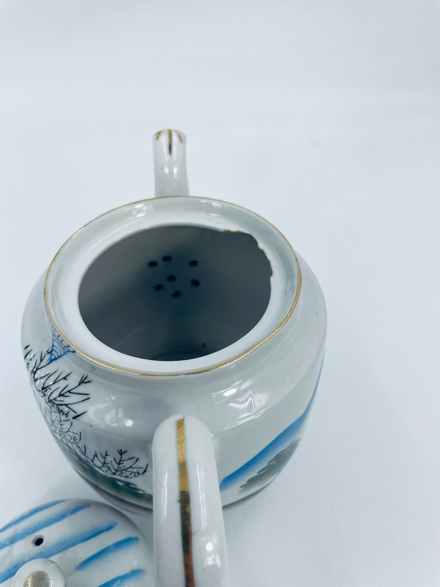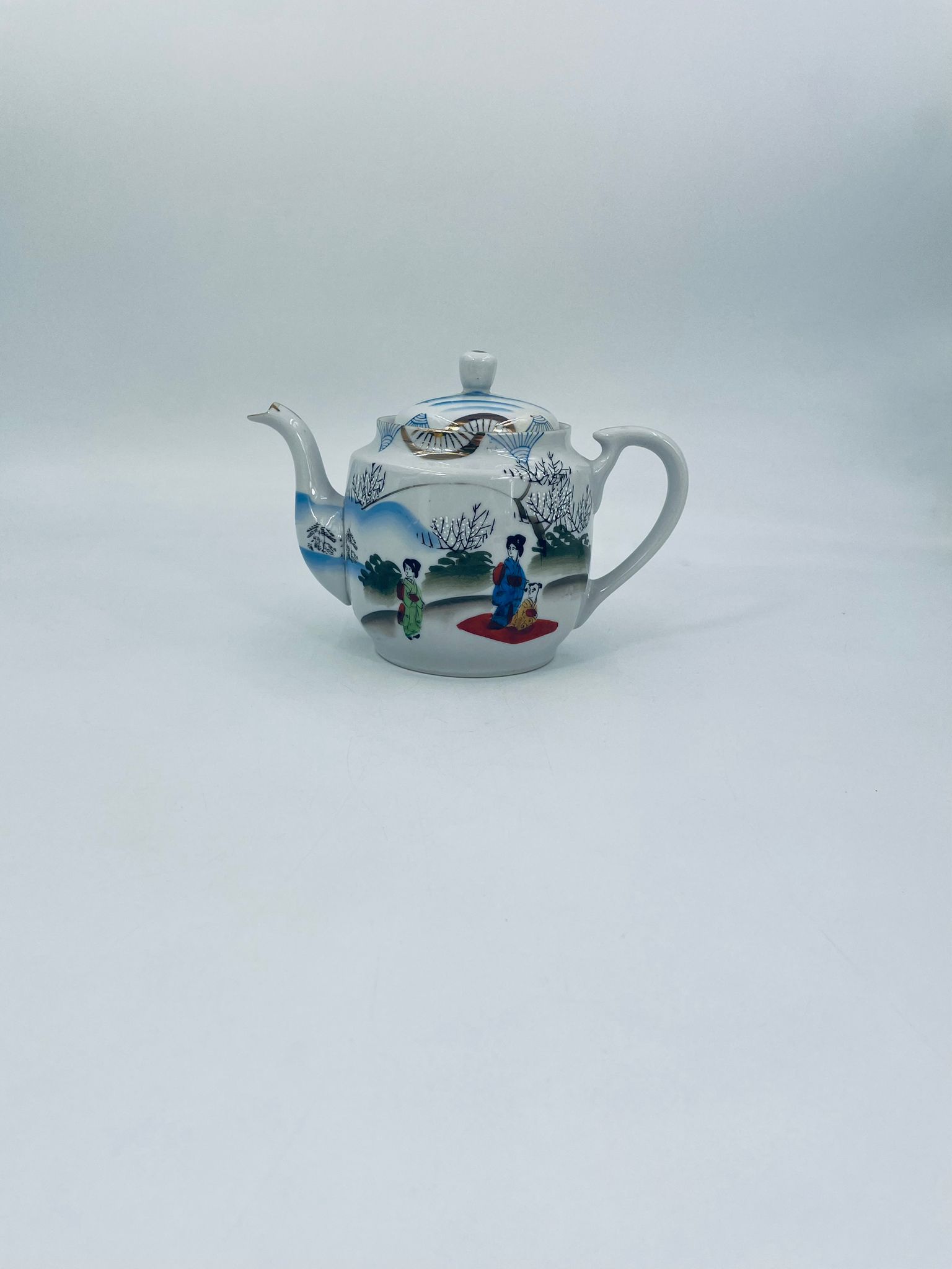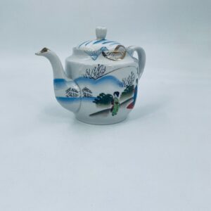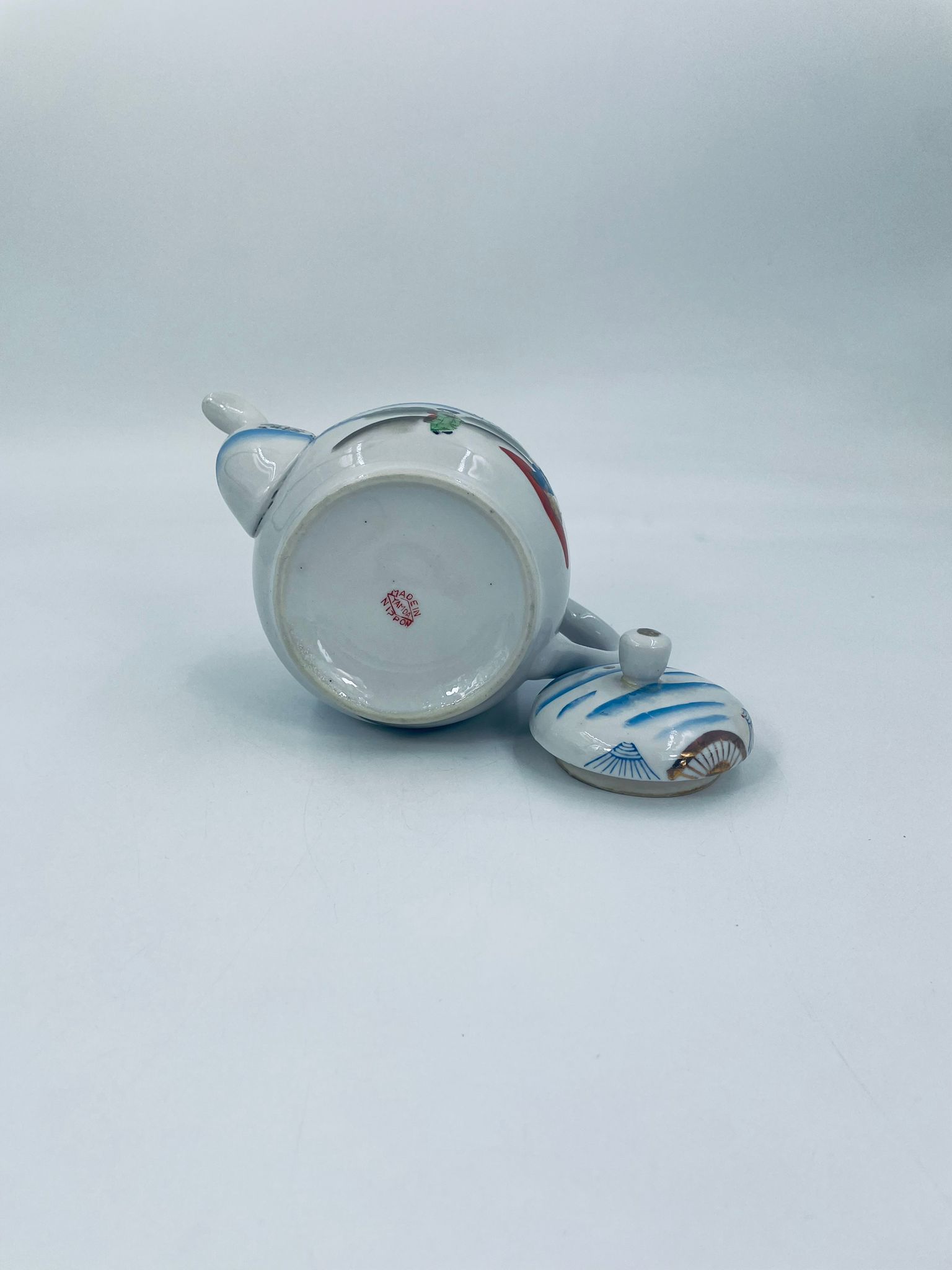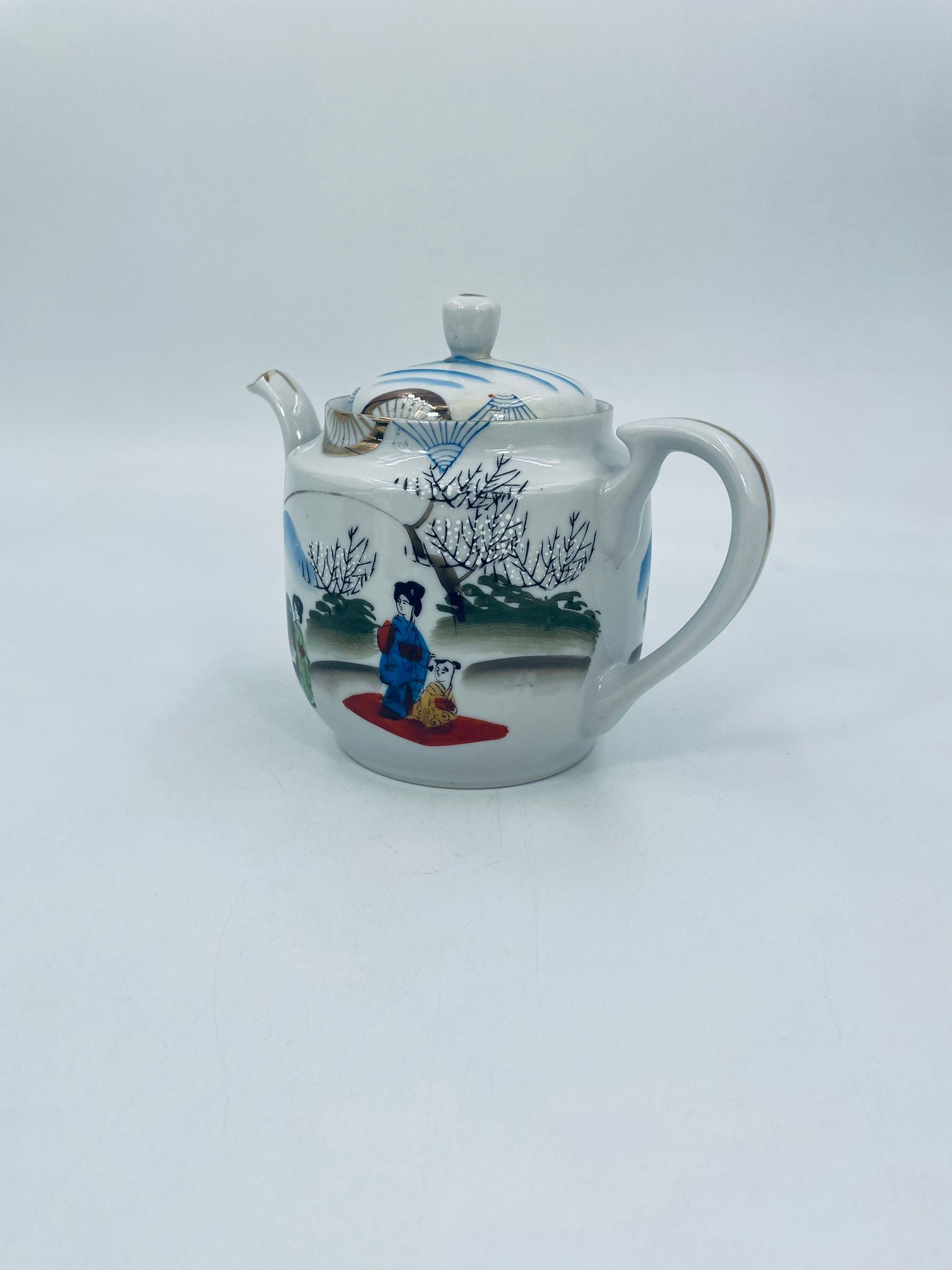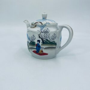 Czajniczek Yamda Nippon Japonia, wyprodukowany z białej, cienkiej porcelany. Imbryczek ręcznie malowany na wzór w stylu Geisha. Czajniczek ma uszczerbek na górnej części i pęknięty, sklejony dzióbek na pokrywie.