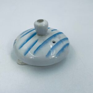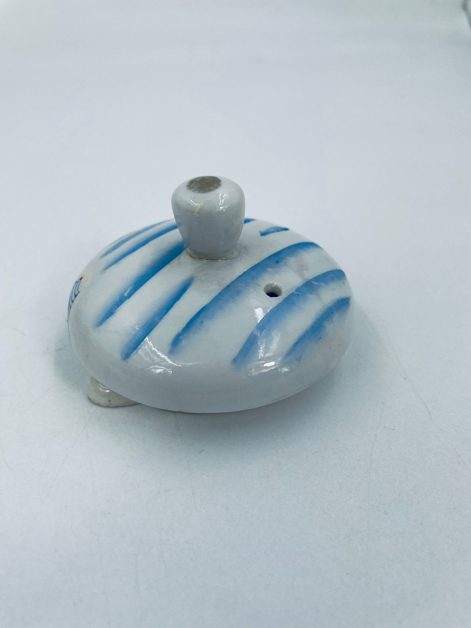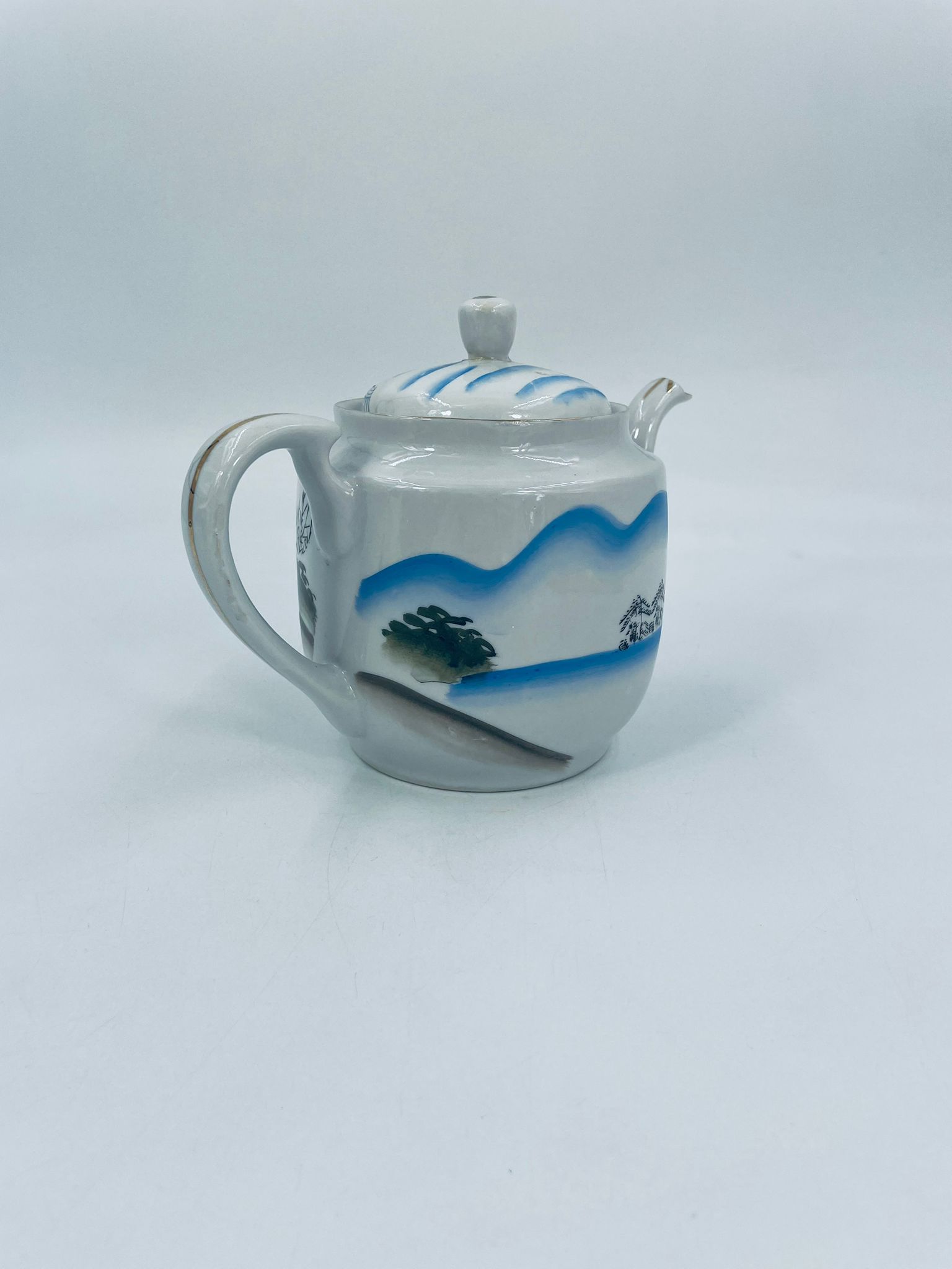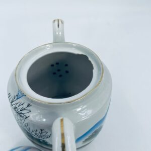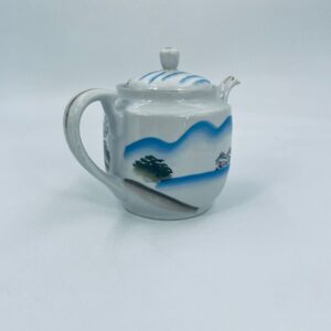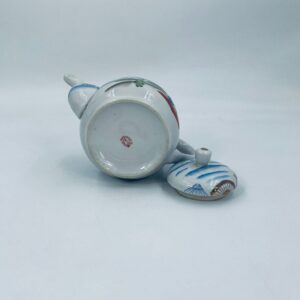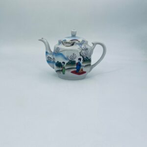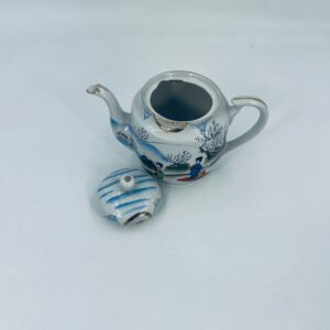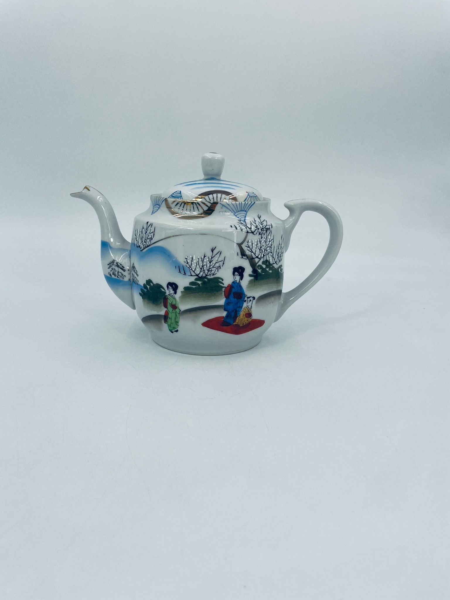 Czajniczek Yamda Nippon Japonia, wyprodukowany z białej, cienkiej porcelany. Imbryczek ręcznie malowany na wzór w stylu Geisha. Czajniczek ma uszczerbek na górnej części i pęknięty, sklejony dzióbek na pokrywie.
