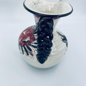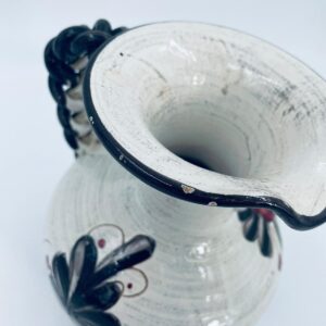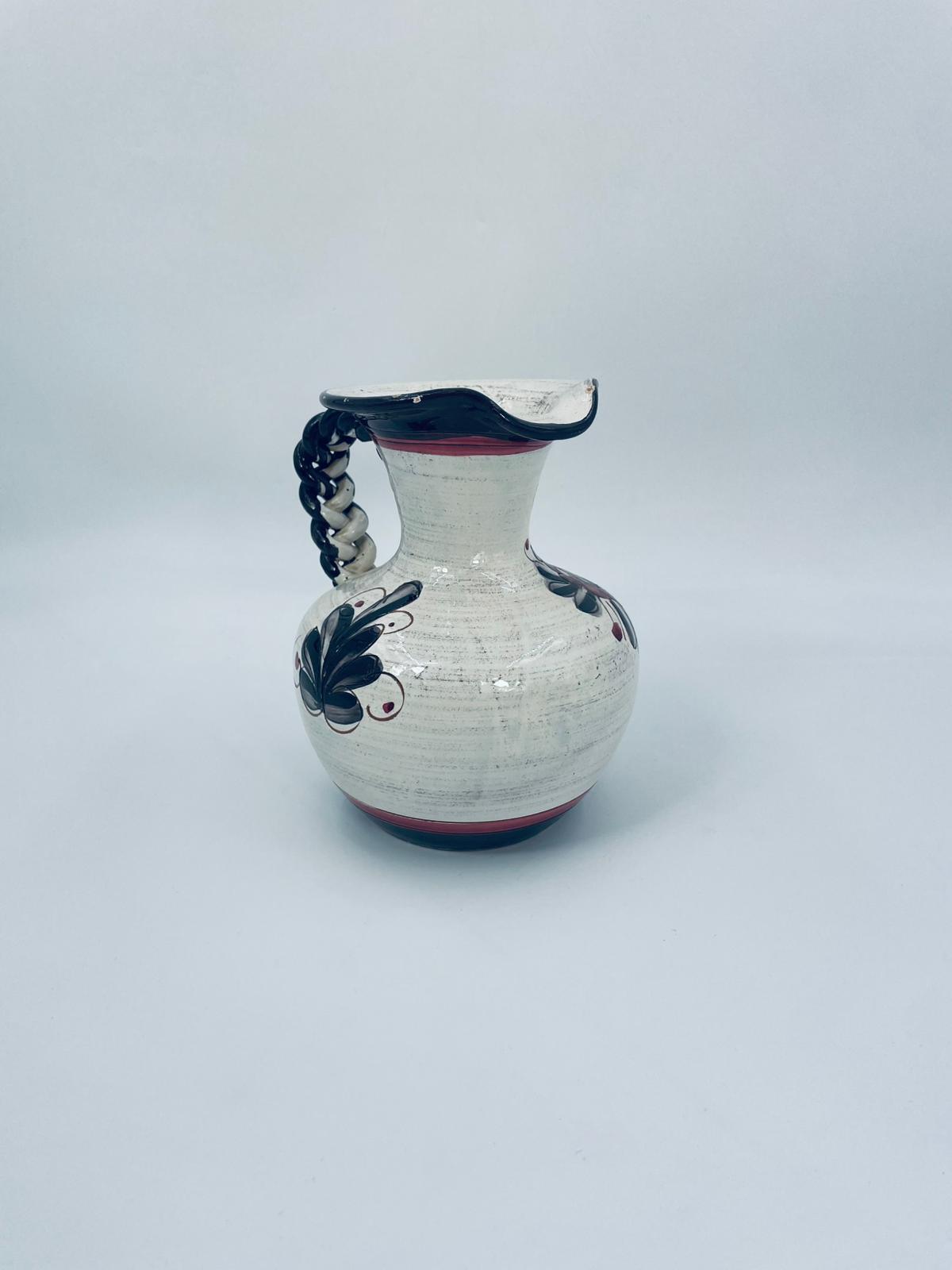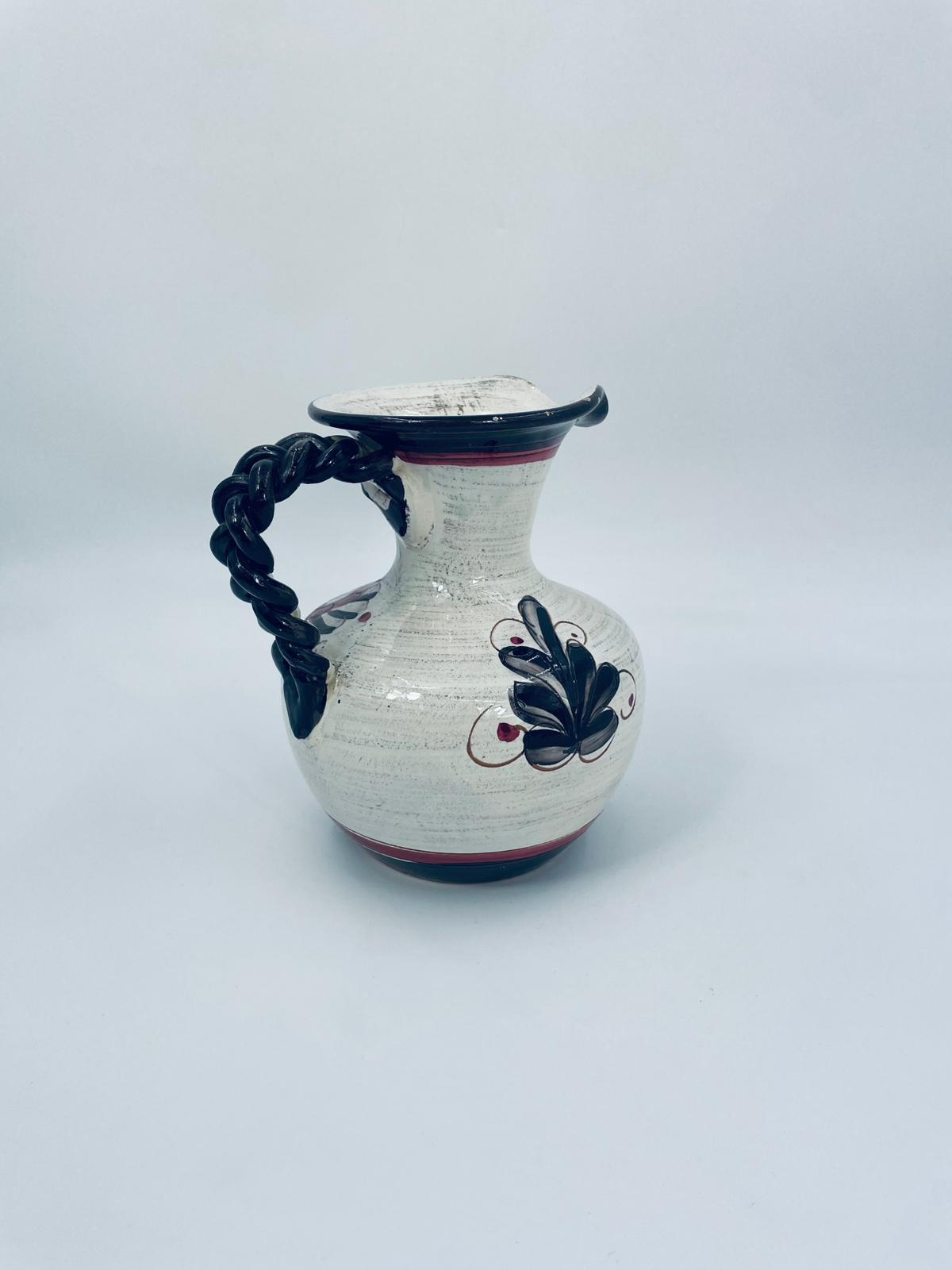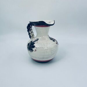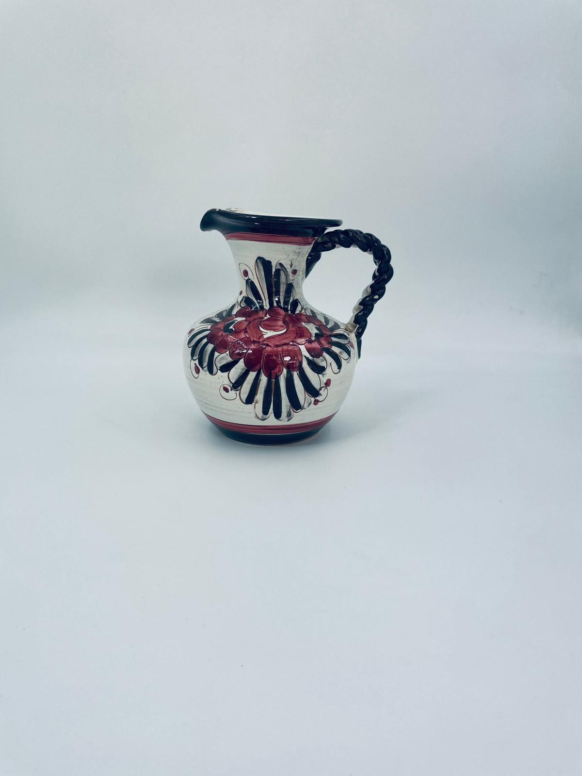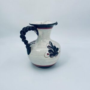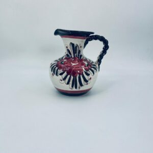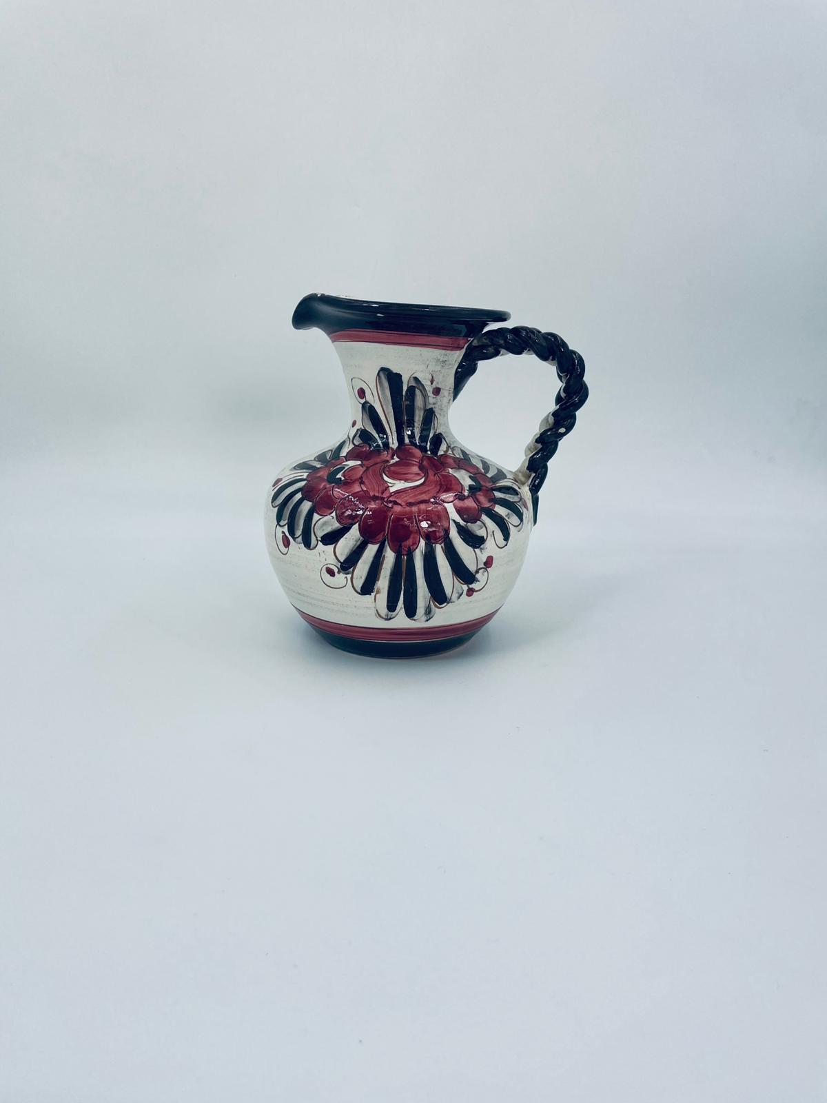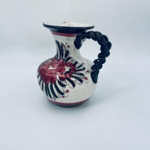 Dzbanek dekoracyjny Włoski, wykonany z ceramiki Majolikowej. Dzbanek posiada dekoracyjny, pleciony uchwyt. Ręcznie robiony, ręcznie malowany w motyw bordowego kwiata, wykończony kolorem brązowym. Posiada uszczerbki na górnej krawędzi.