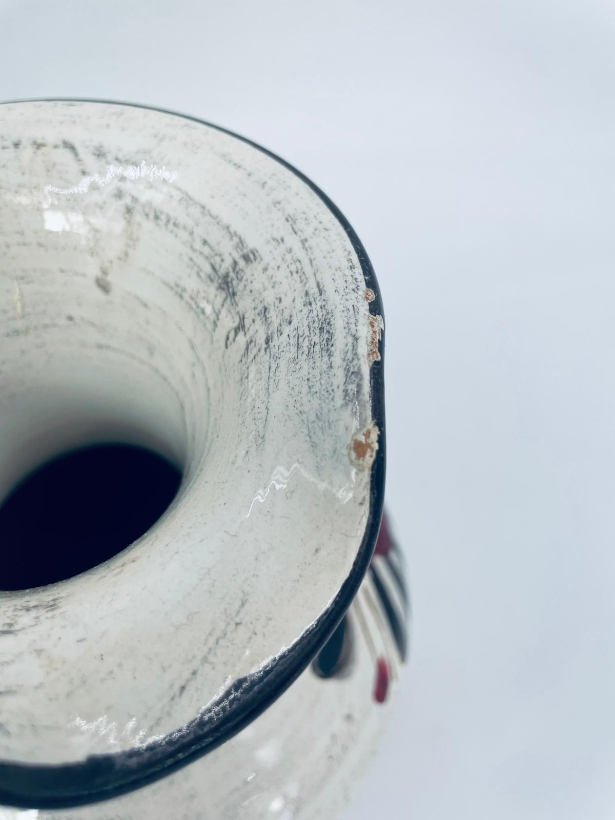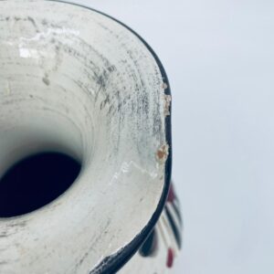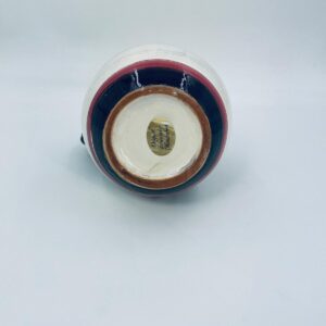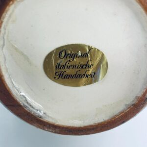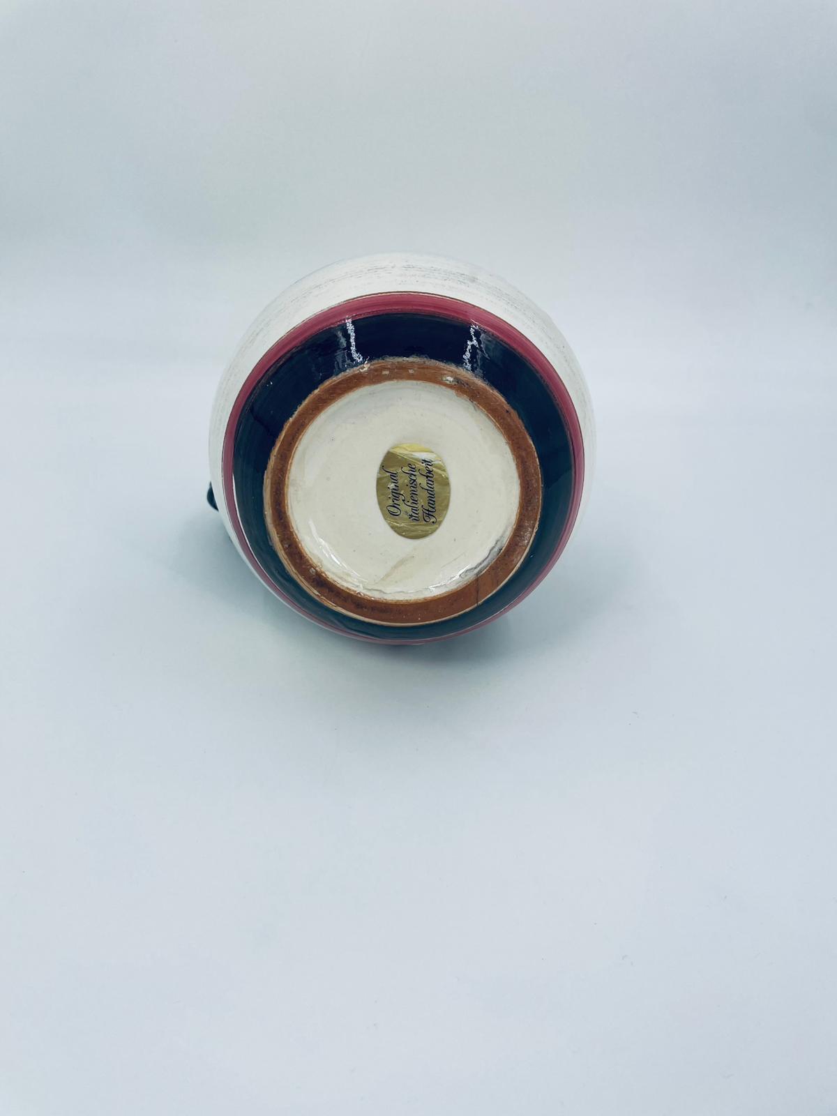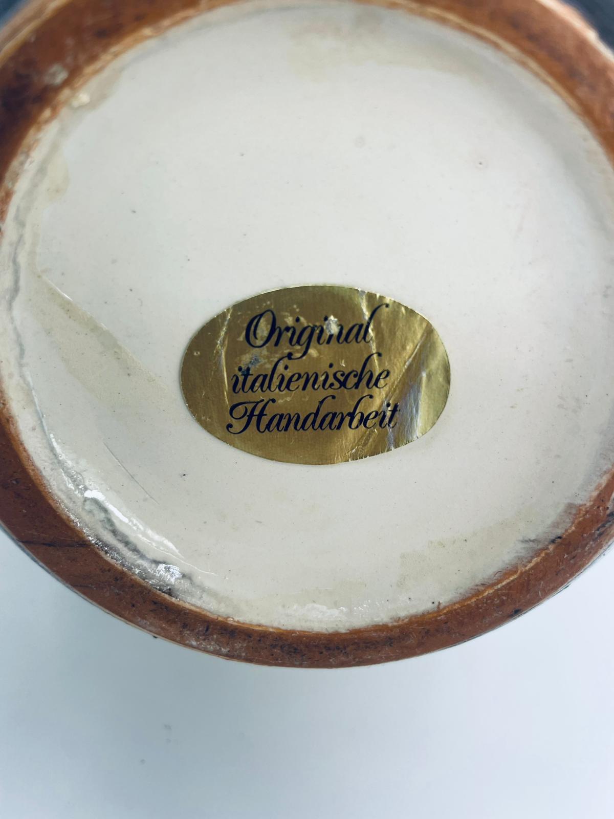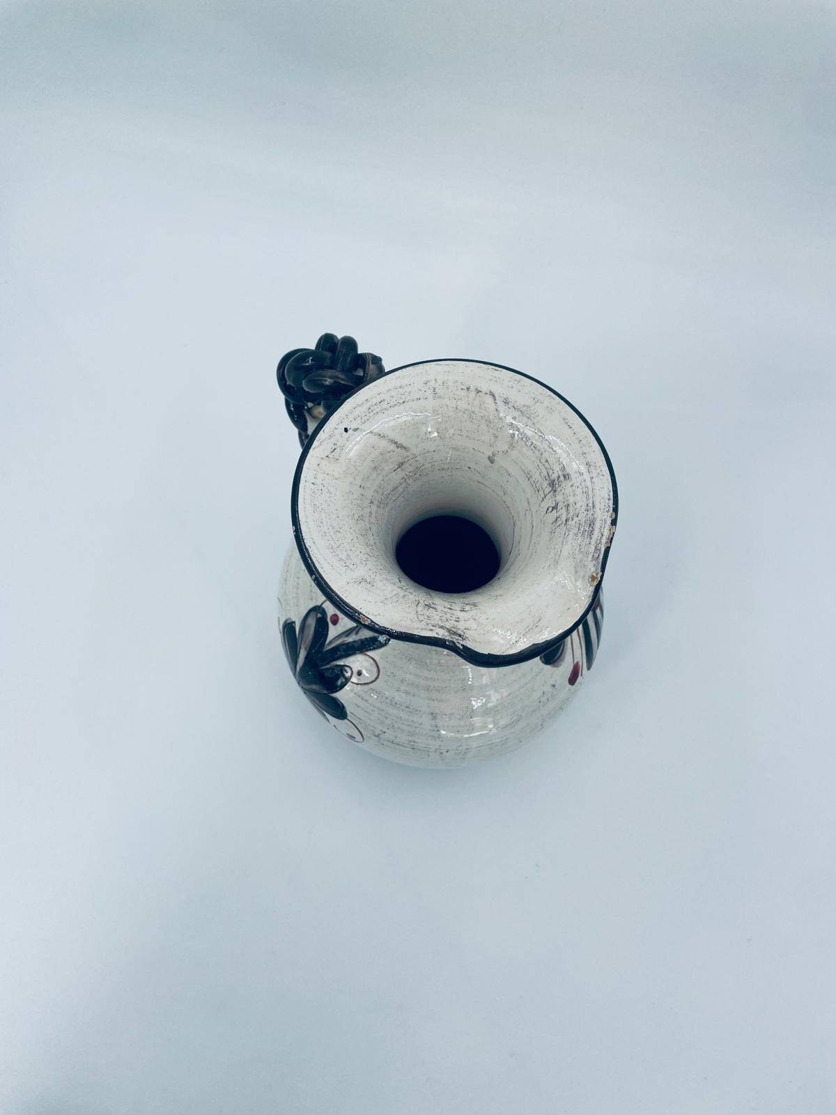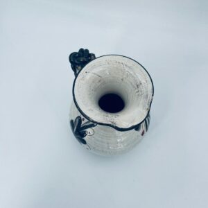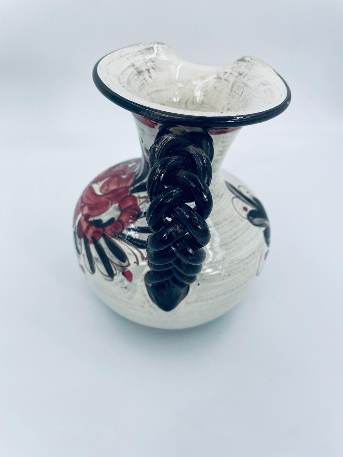 Dzbanek dekoracyjny Włoski, wykonany z ceramiki Majolikowej. Dzbanek posiada dekoracyjny, pleciony uchwyt. Ręcznie robiony, ręcznie malowany w motyw bordowego kwiata, wykończony kolorem brązowym. Posiada uszczerbki na górnej krawędzi.