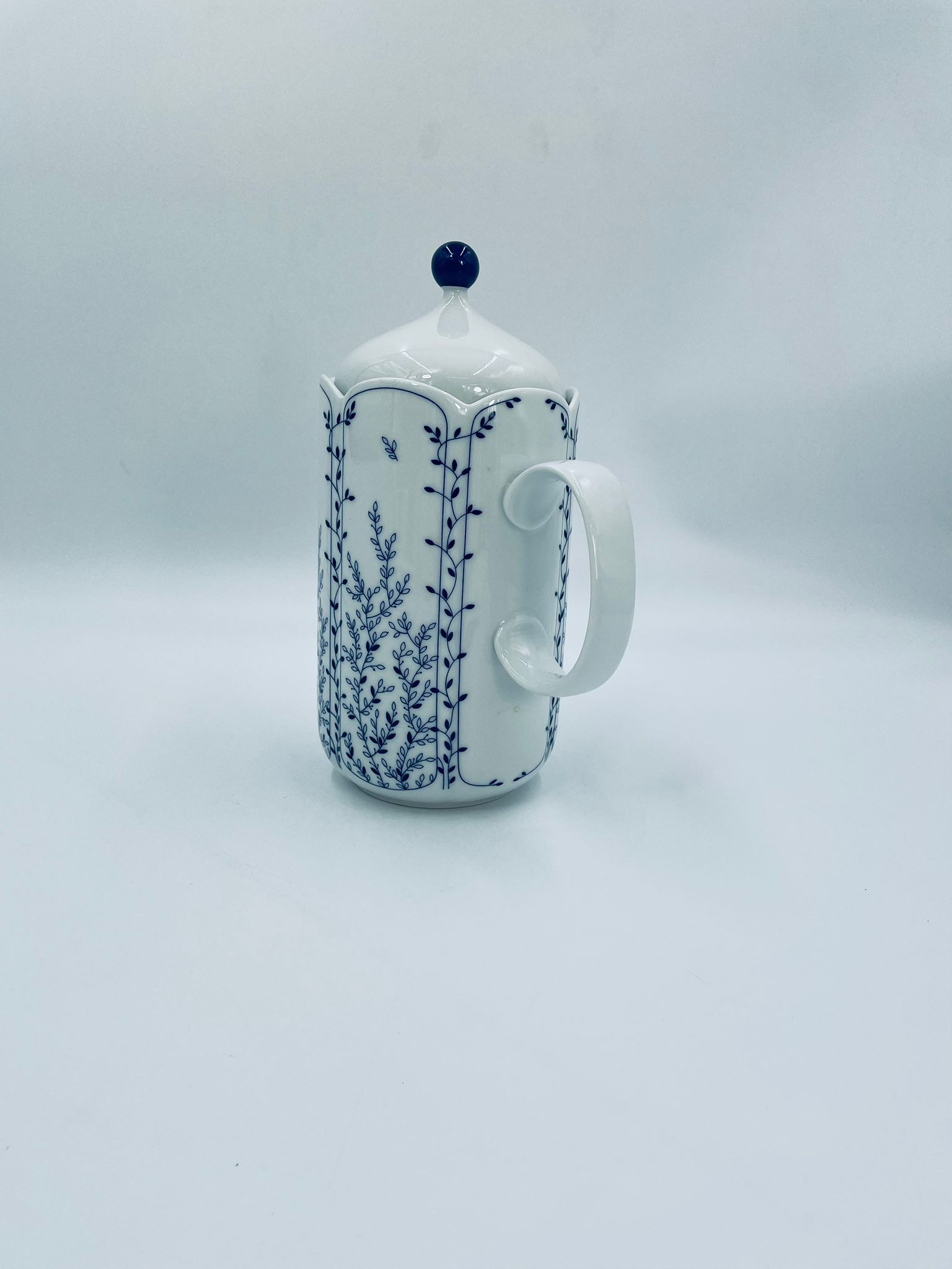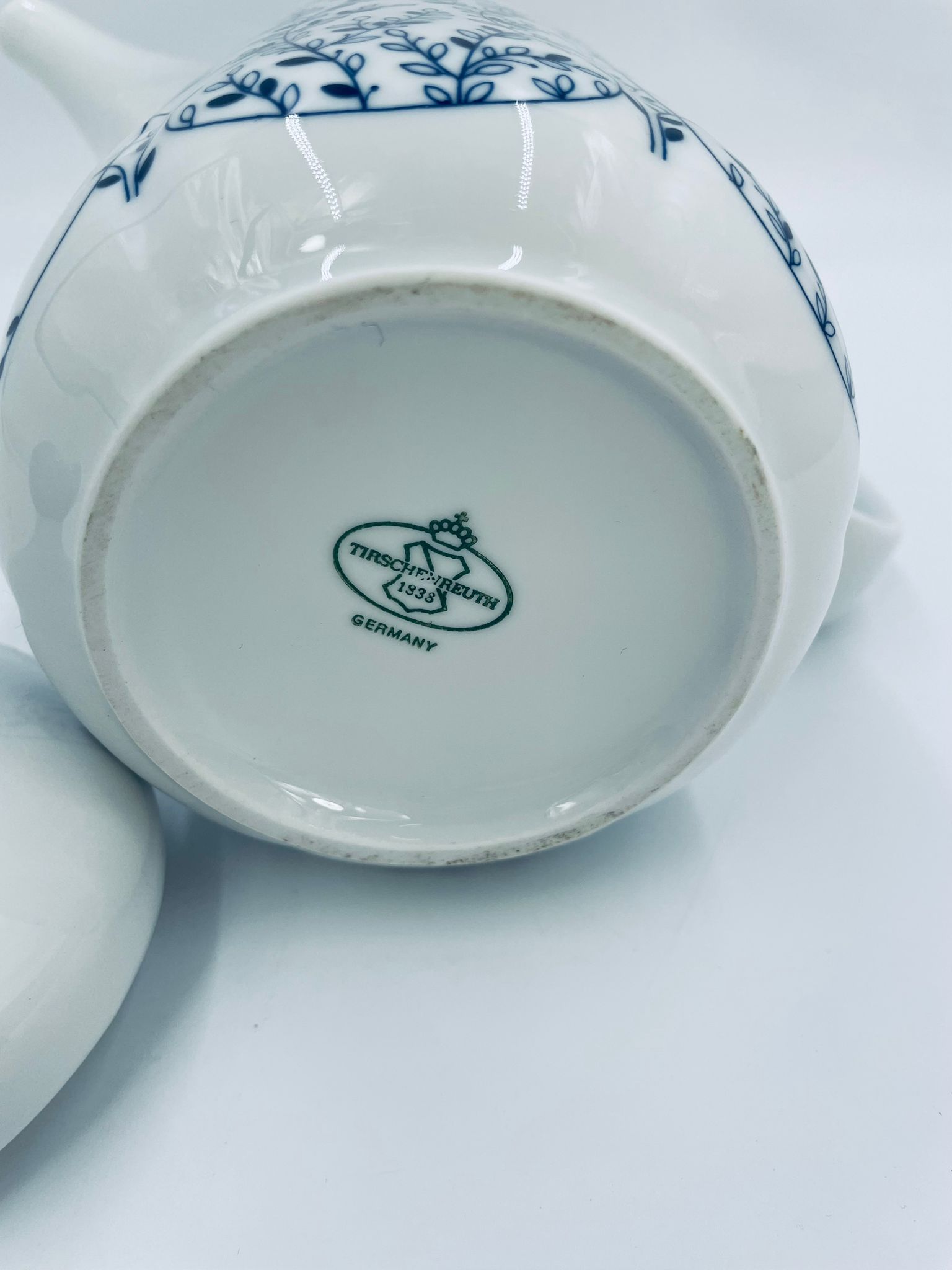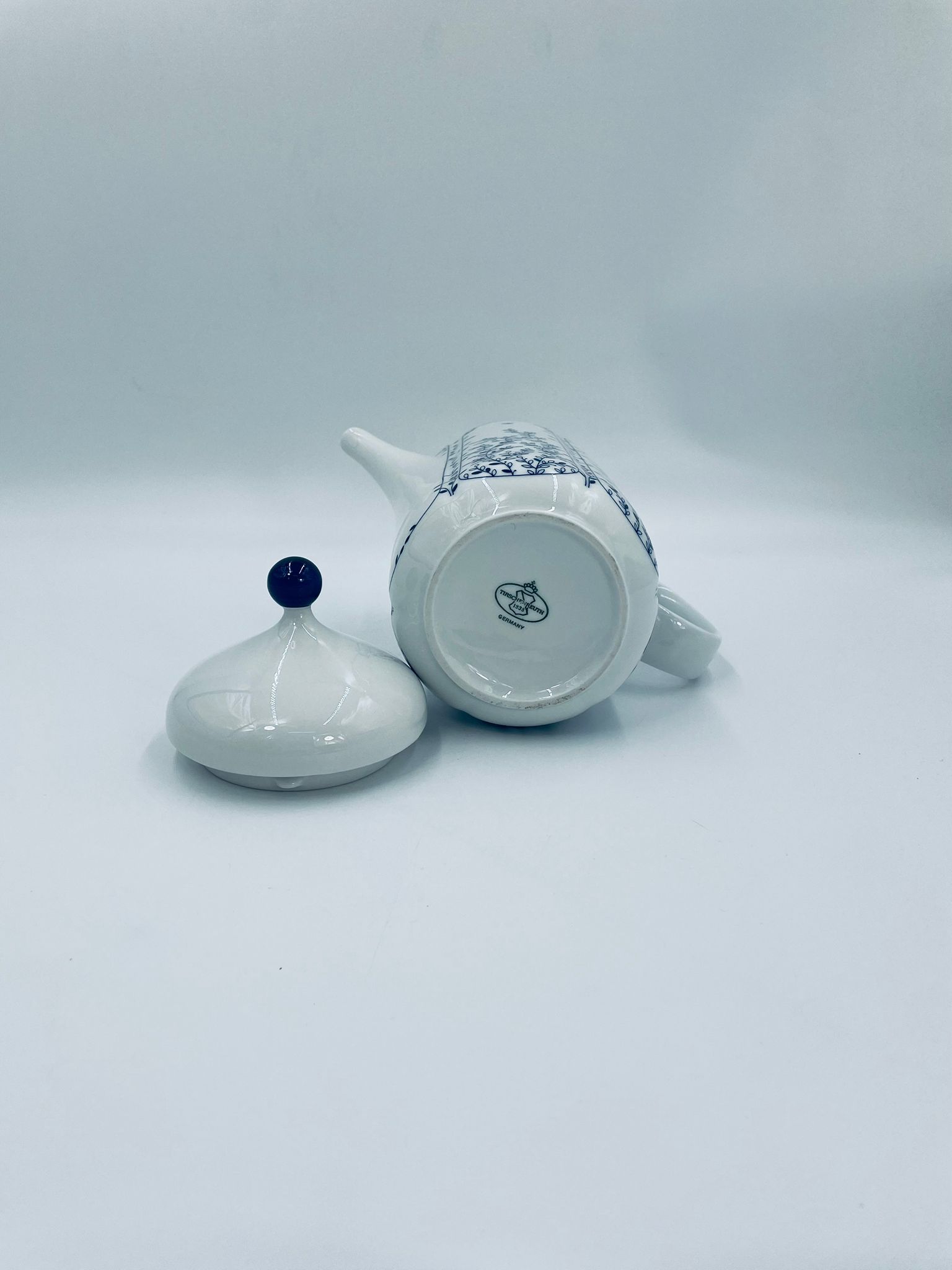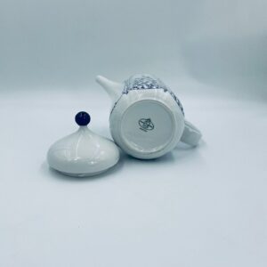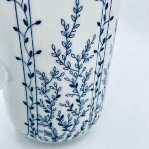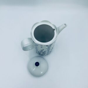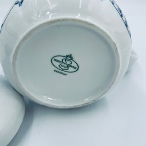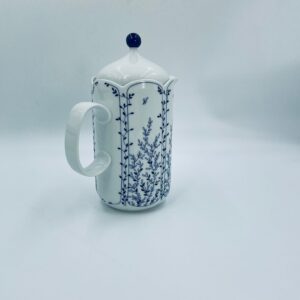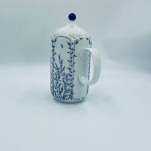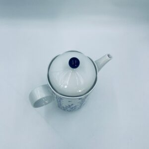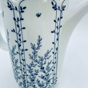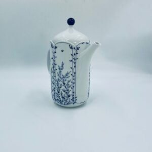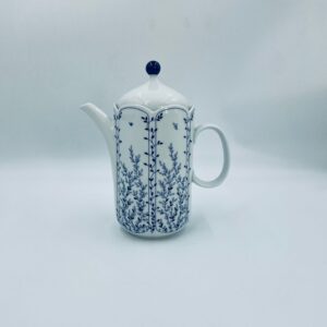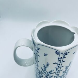 Dzbanek do herbaty renomowanej wytwórni Tirschenreuth, wykonany z wysokiej jakości białej porcelany. Dzbanek charakteryzuje się klasycznym kształtem serii „Fleur” z żłobkowaniami i dekoracyjnym, nieregularnym górnym brzegiem. Dzbanek ozdobiony jest niebieskim, delikatnym motywem roślinnym „Blätterzauber”.