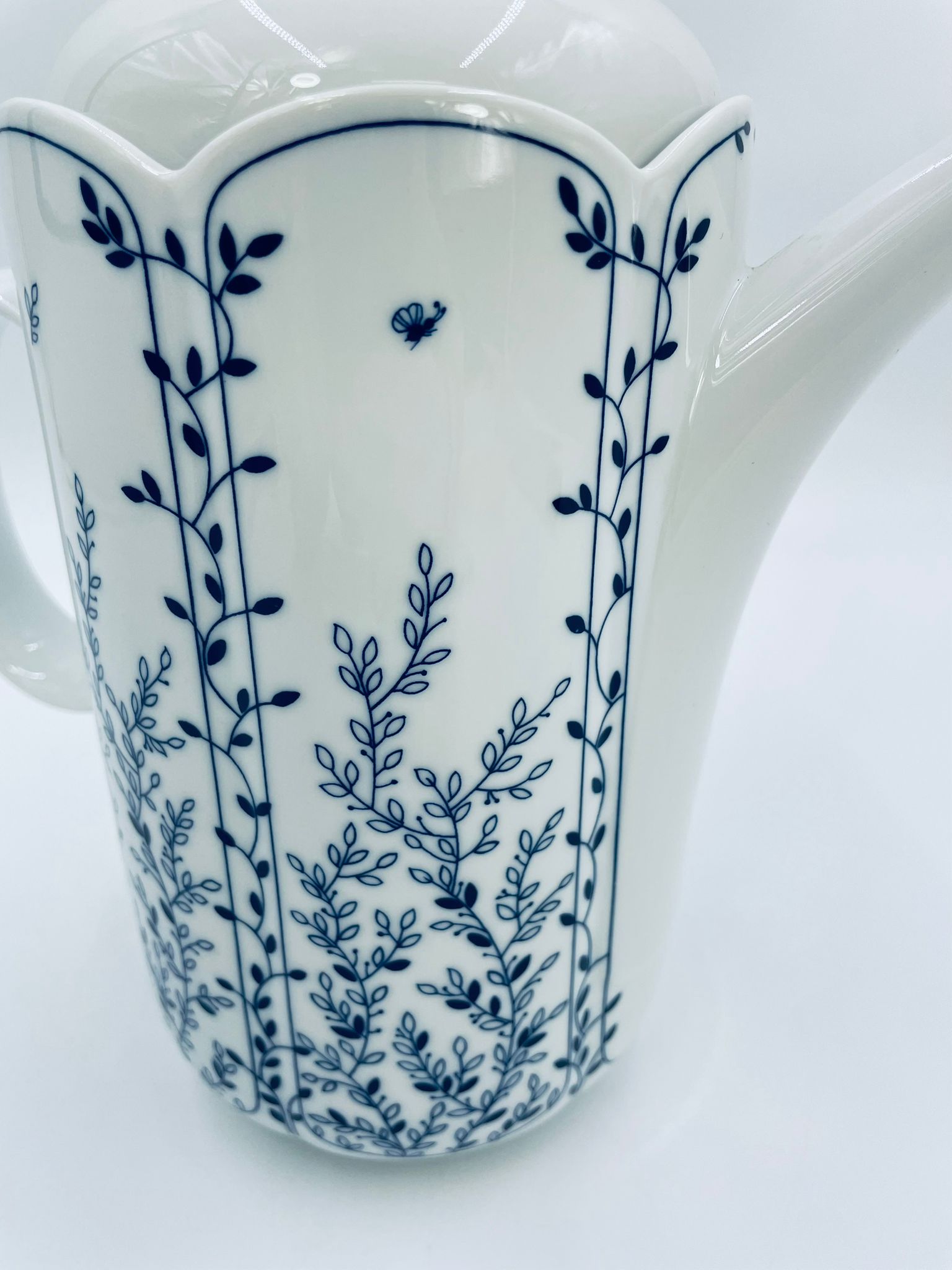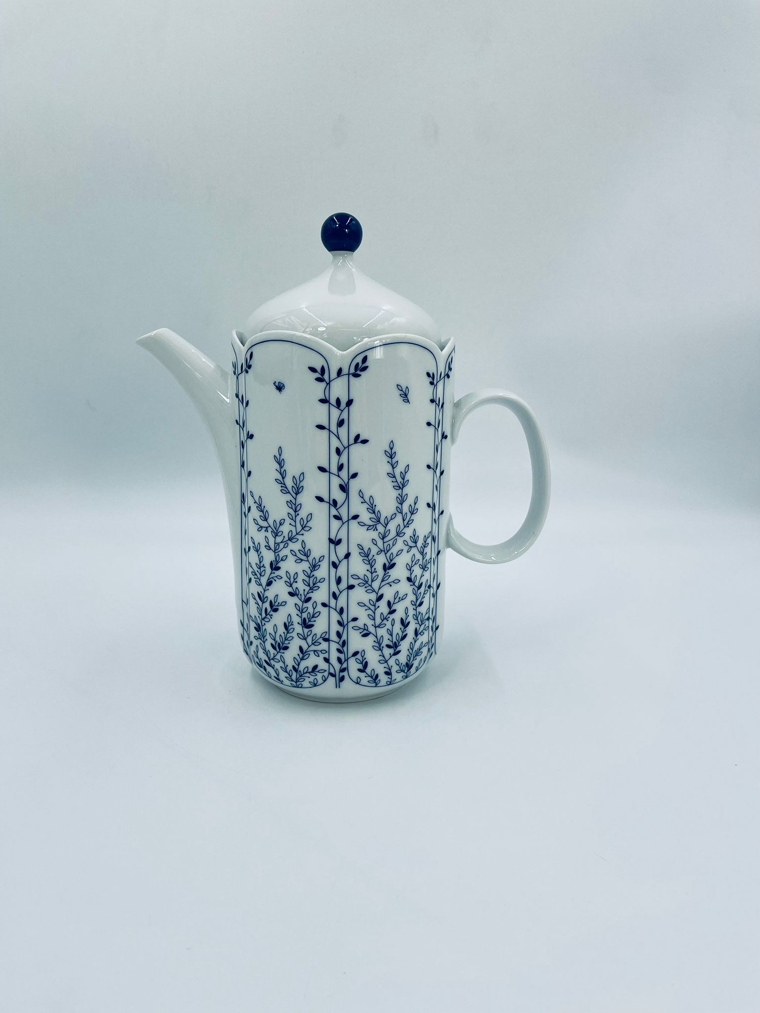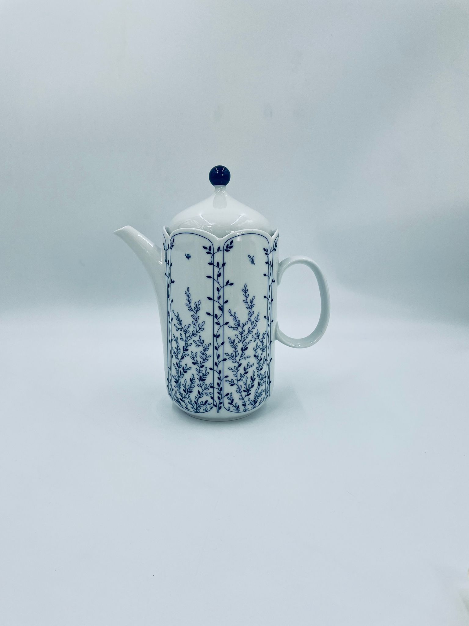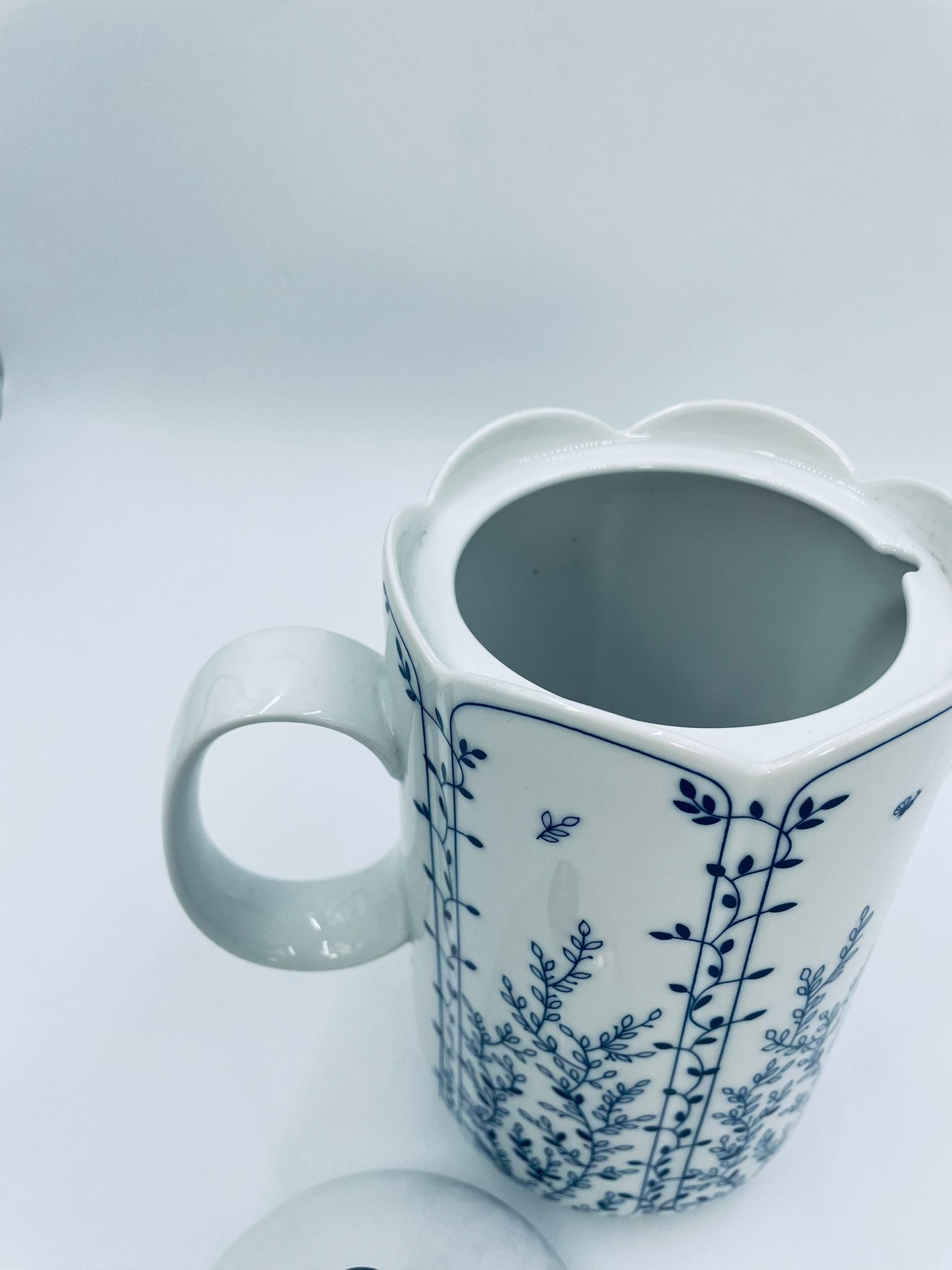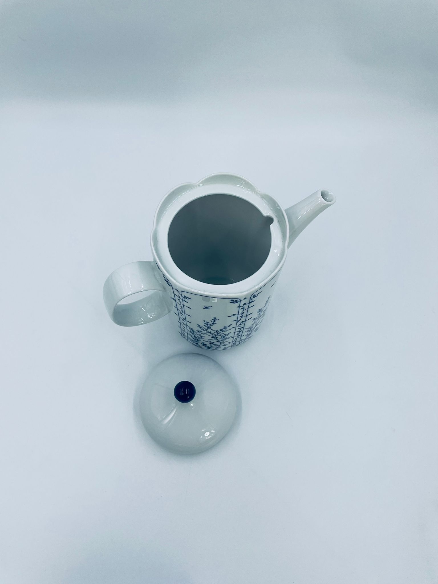 Dzbanek do herbaty renomowanej wytwórni Tirschenreuth, wykonany z wysokiej jakości białej porcelany. Dzbanek charakteryzuje się klasycznym kształtem serii „Fleur” z żłobkowaniami i dekoracyjnym, nieregularnym górnym brzegiem. Dzbanek ozdobiony jest niebieskim, delikatnym motywem roślinnym „Blätterzauber”.