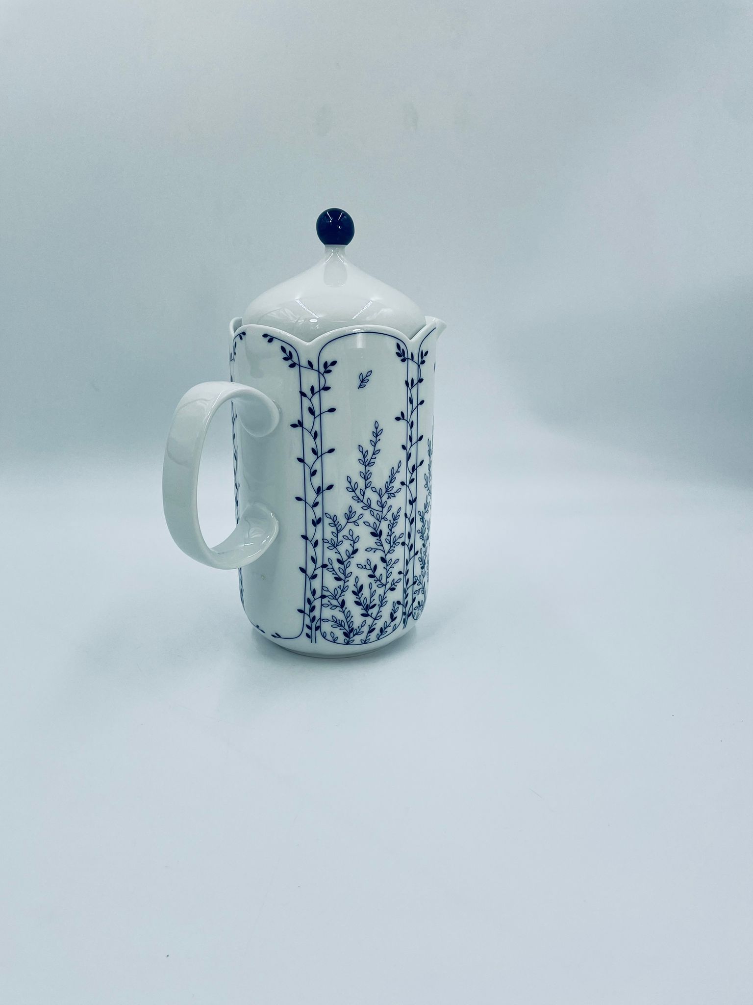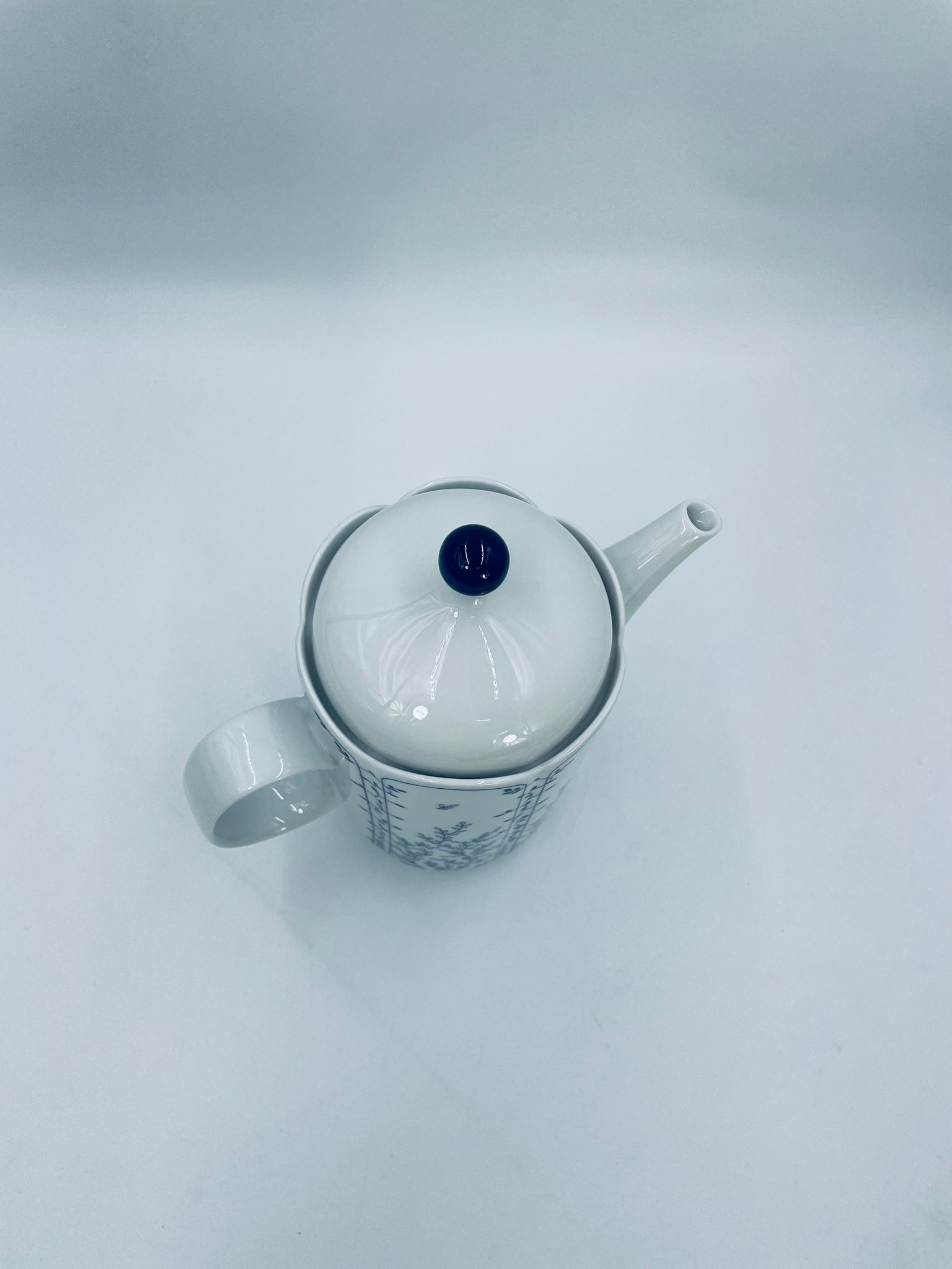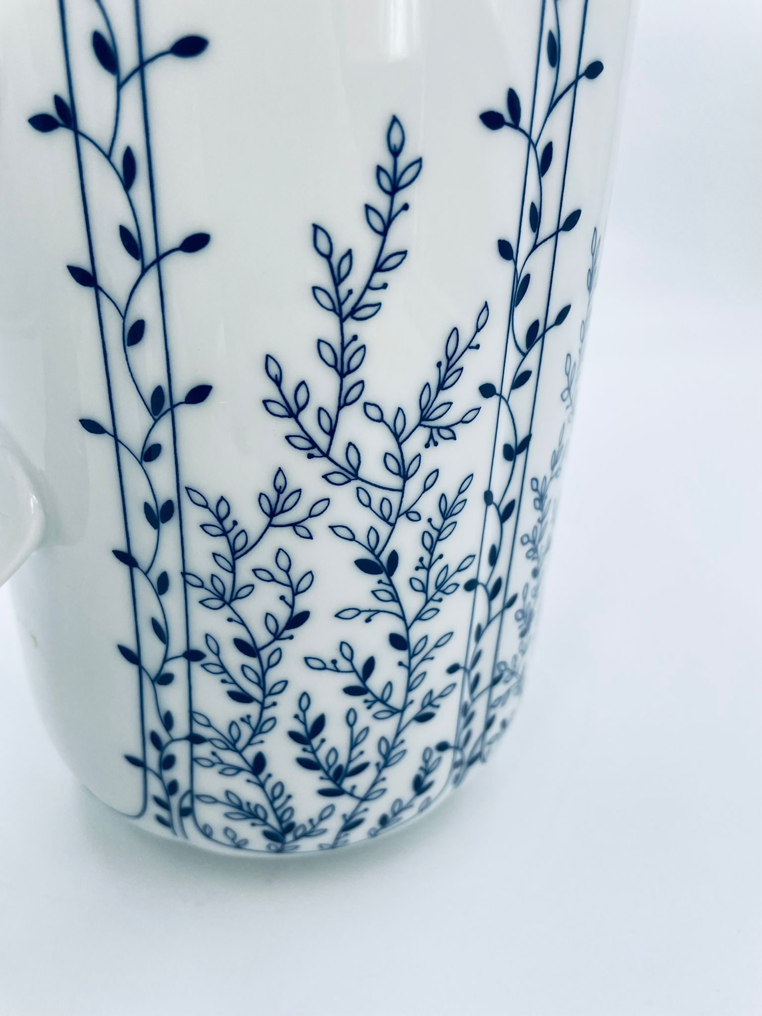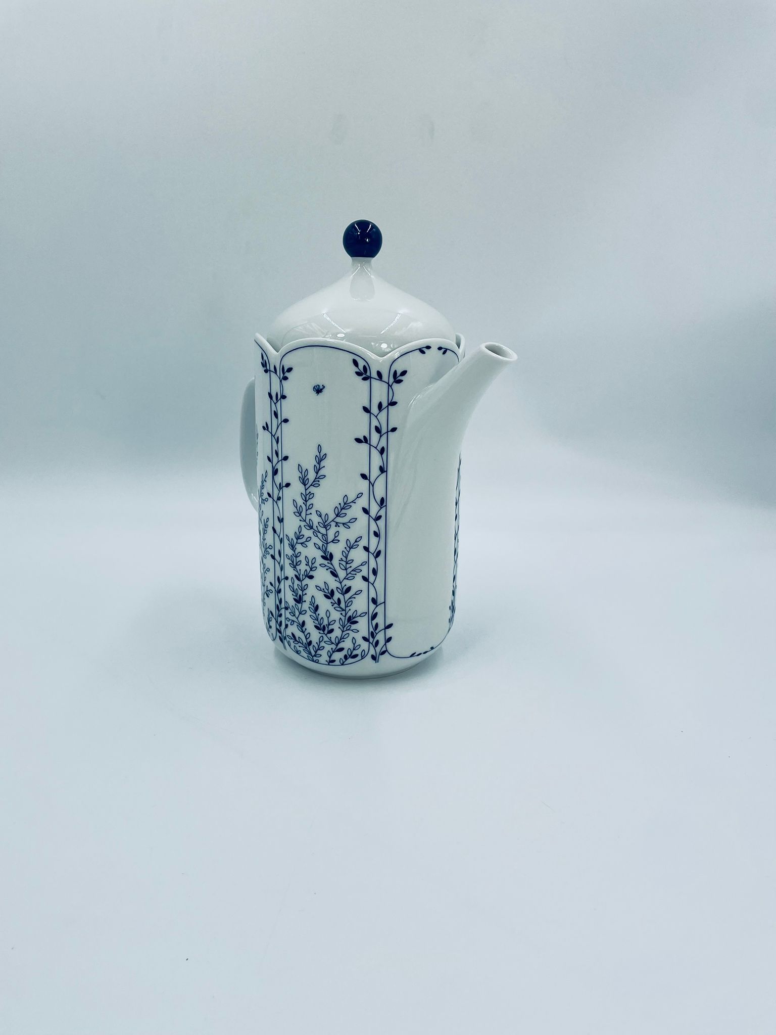 Dzbanek do herbaty renomowanej wytwórni Tirschenreuth, wykonany z wysokiej jakości białej porcelany. Dzbanek charakteryzuje się klasycznym kształtem serii „Fleur” z żłobkowaniami i dekoracyjnym, nieregularnym górnym brzegiem. Dzbanek ozdobiony jest niebieskim, delikatnym motywem roślinnym „Blätterzauber”.