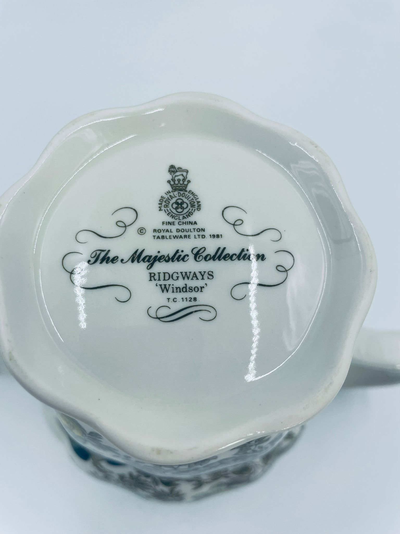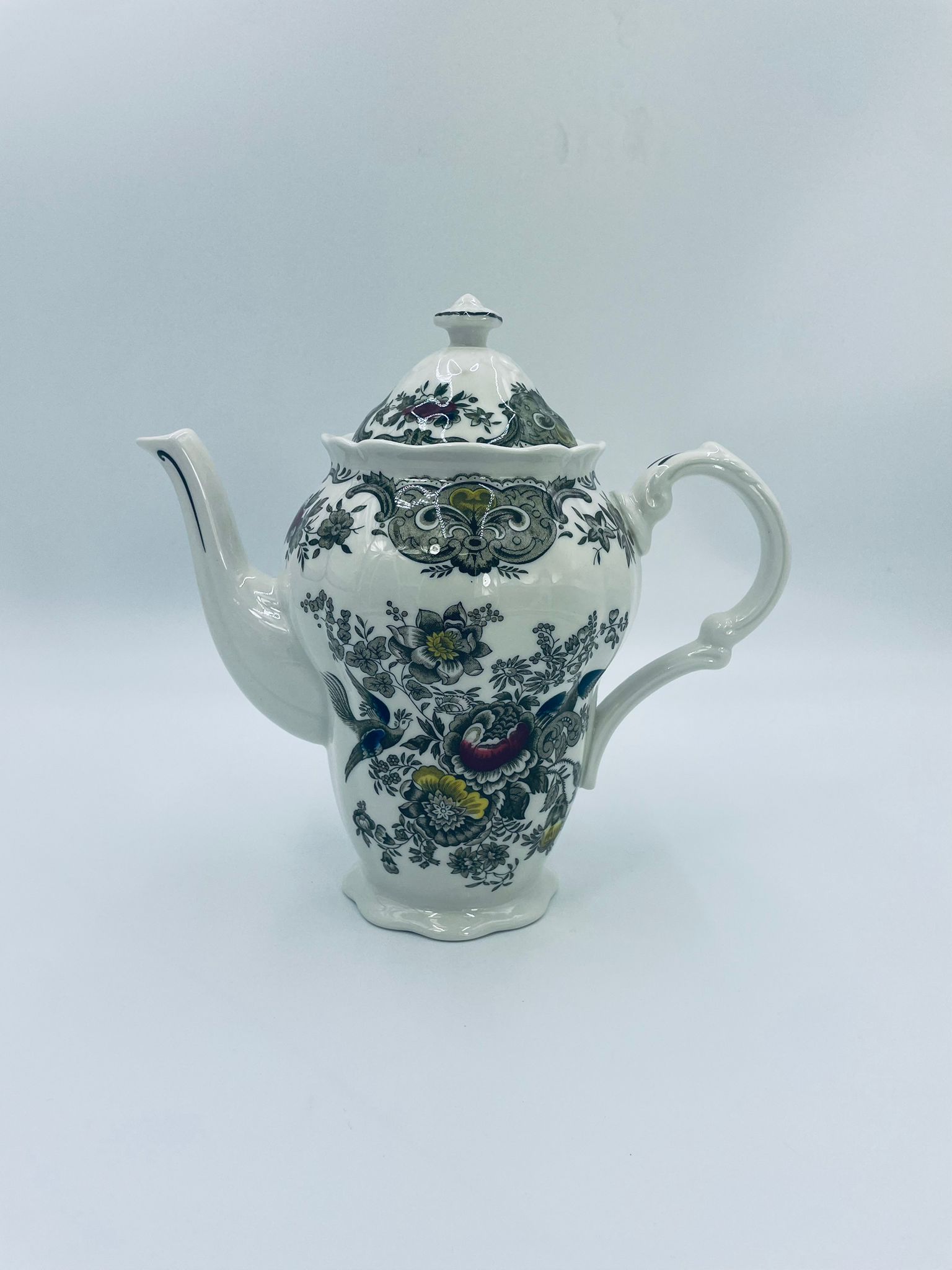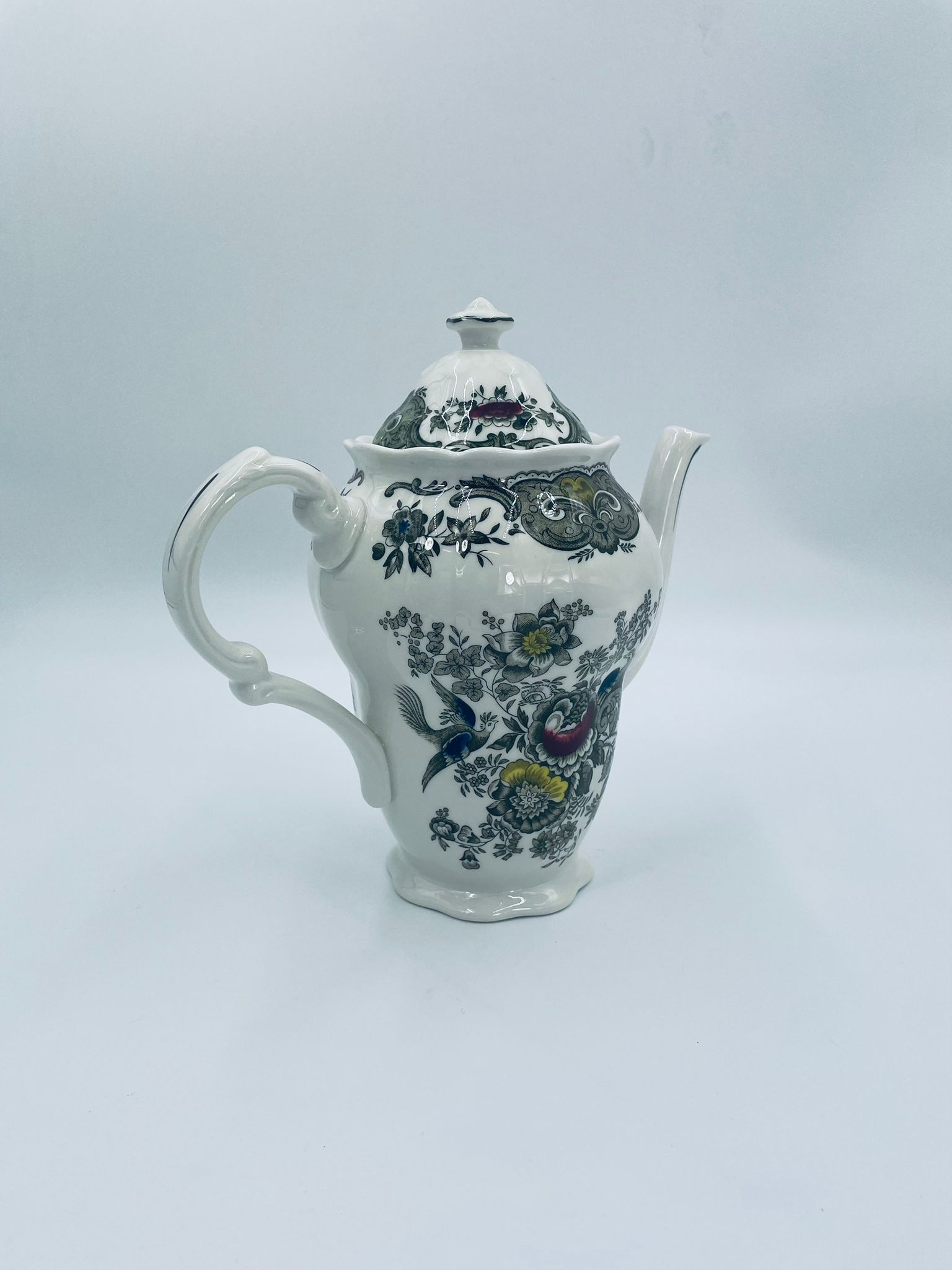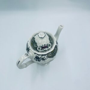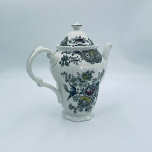 Dzbanek do herbaty wytwórni Royal Doulton Tableware z 1981r., wykonany z wysokiej jakości szlachetnej, angielskiej porcelany. Dzbanek we wzorze „Ridgways ‚Windsor’” , charakteryzuje się pięknym wzorem kwiatów i ręcznie grawerowanym wzorem bażantów. Posiada falistą podstawę, dekoracyjny uchwyt i wylewkę z akcentem w kolorze khaki oraz dekoracyjna pokrywę z reliefami i uchwytem w kształcie kwiata.