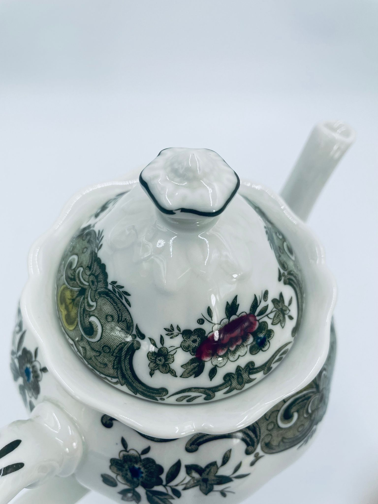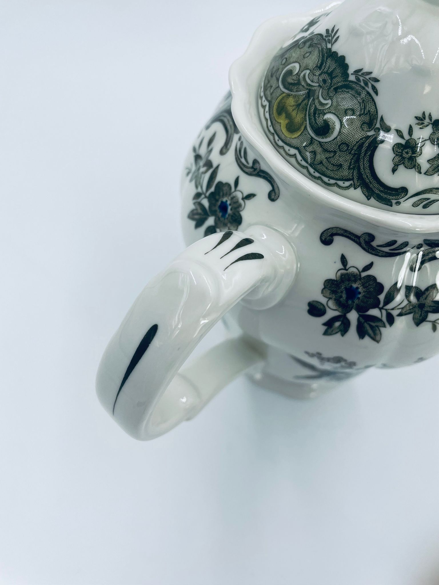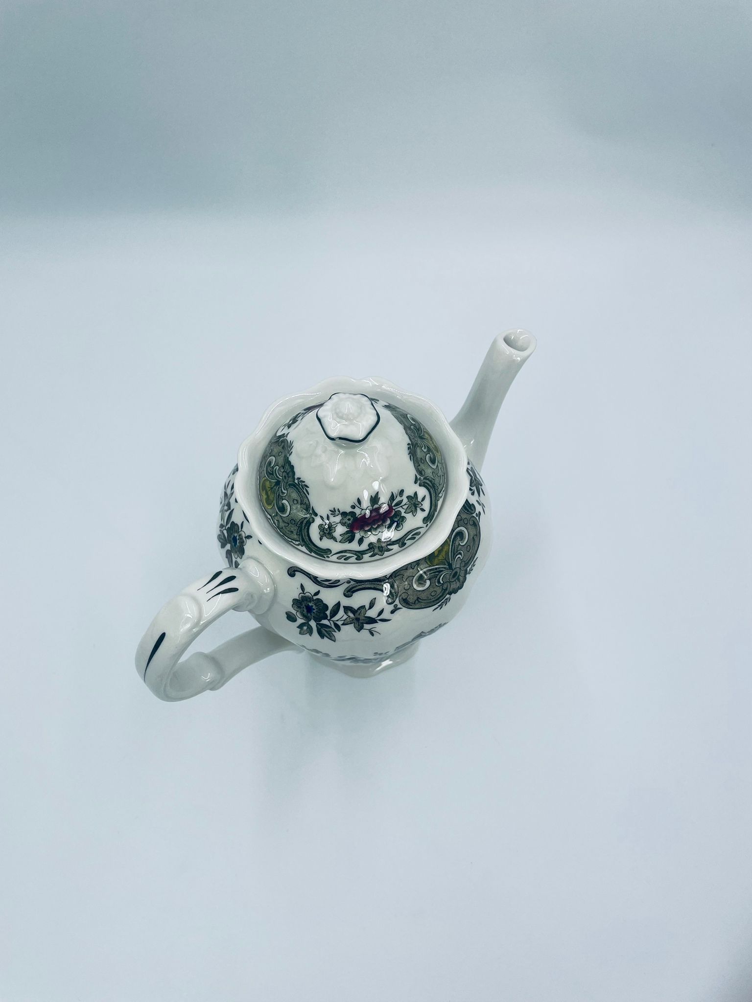 Dzbanek do herbaty wytwórni Royal Doulton Tableware z 1981r., wykonany z wysokiej jakości szlachetnej, angielskiej porcelany. Dzbanek we wzorze „Ridgways ‚Windsor’” , charakteryzuje się pięknym wzorem kwiatów i ręcznie grawerowanym wzorem bażantów. Posiada falistą podstawę, dekoracyjny uchwyt i wylewkę z akcentem w kolorze khaki oraz dekoracyjna pokrywę z reliefami i uchwytem w kształcie kwiata.