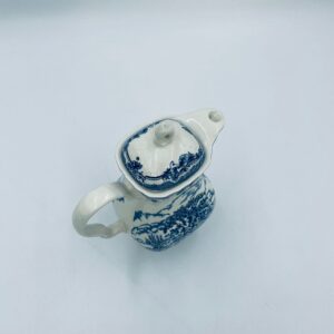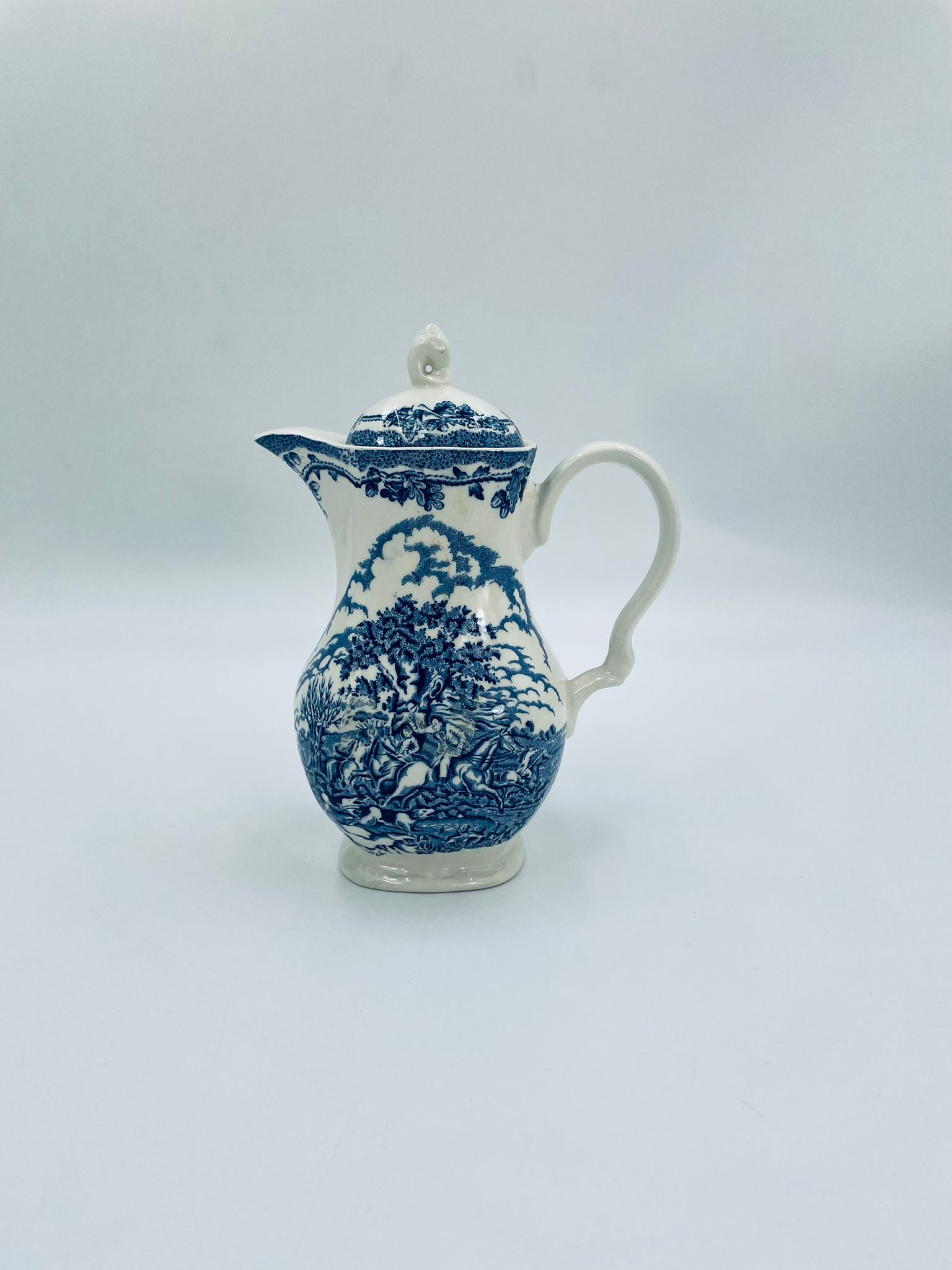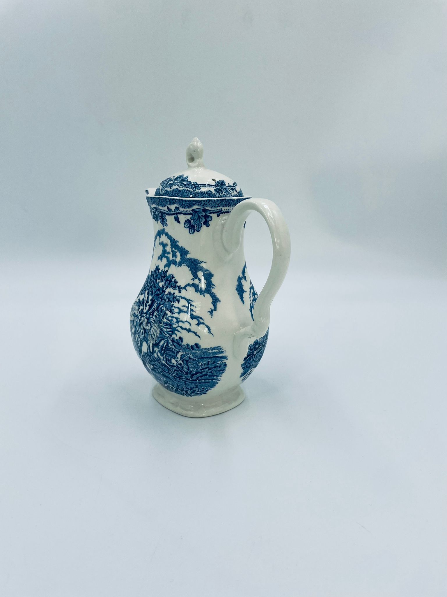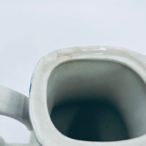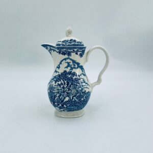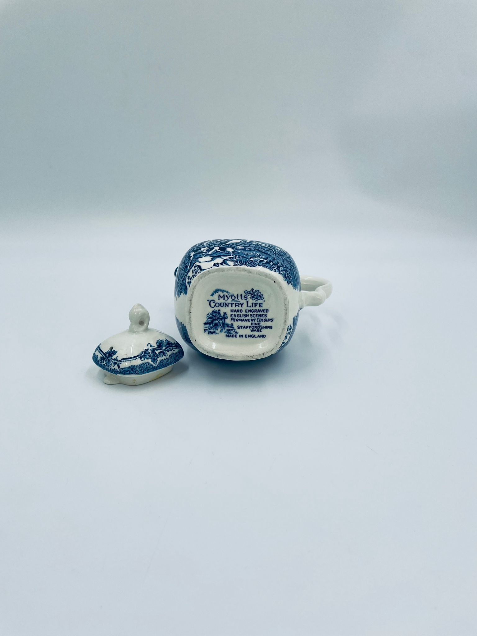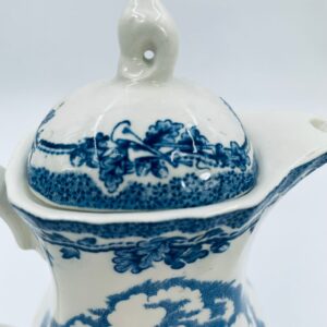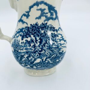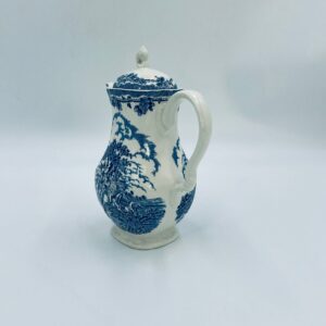 Dzbanek do kawy wytwórni Myotts Country Life, wykonany z wysokie jakości angielskiej porcelany. Dzbanek charakteryzuje się ręcznie grawerowanym, niebieskim wzorem „Country Life” życia na wsi. Posiada ozdoby uchwyt oraz pokrywę z niebieskim wzorem roślinnym. Posiada uszczerbek oraz pęknięcie szkliwa.