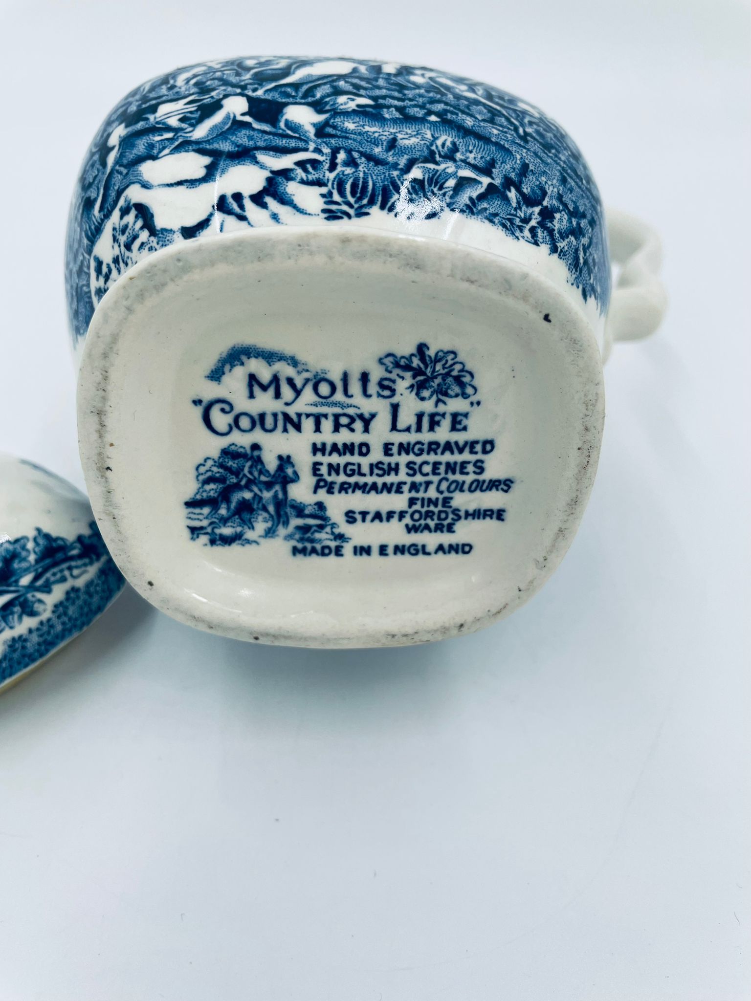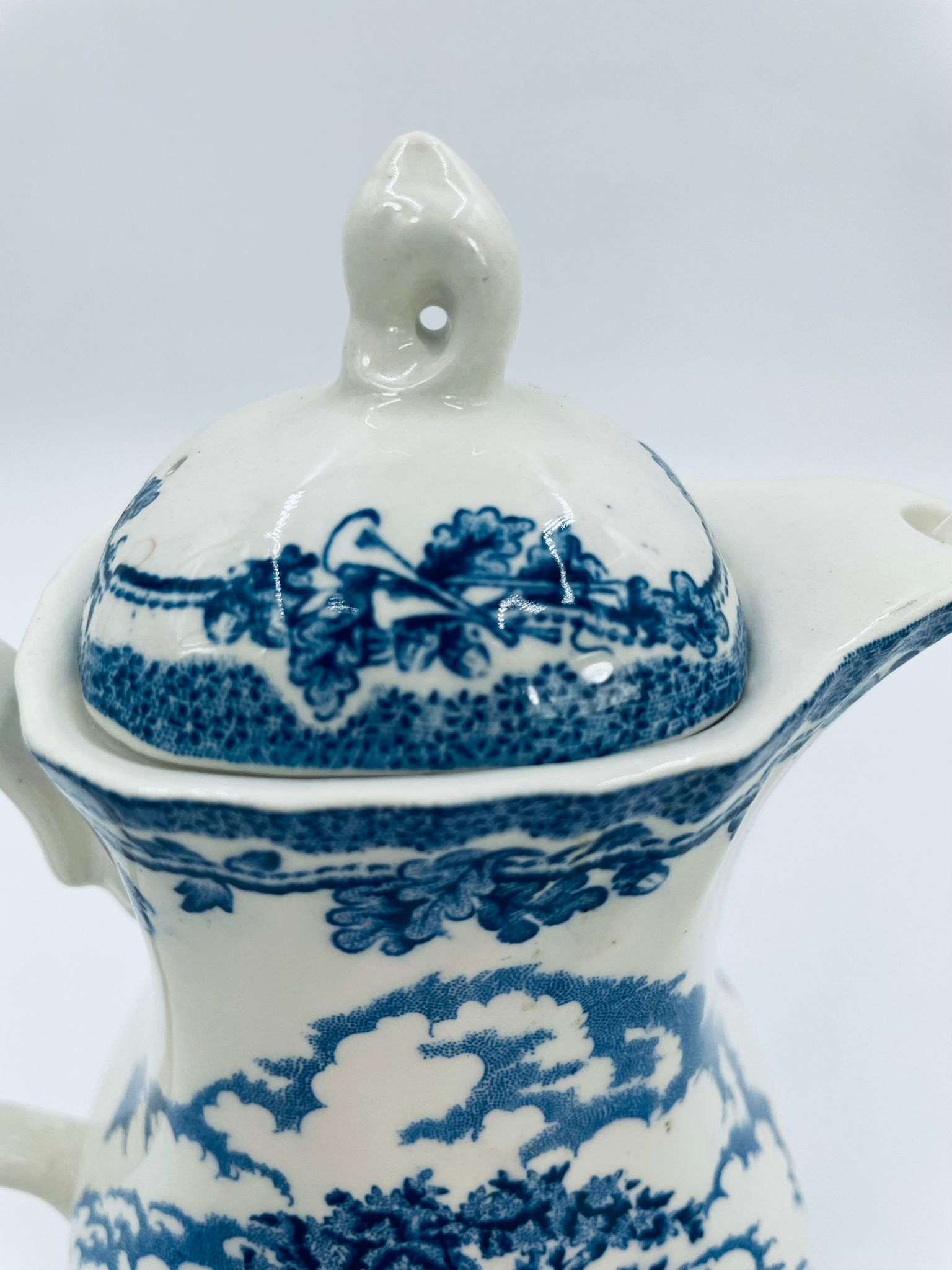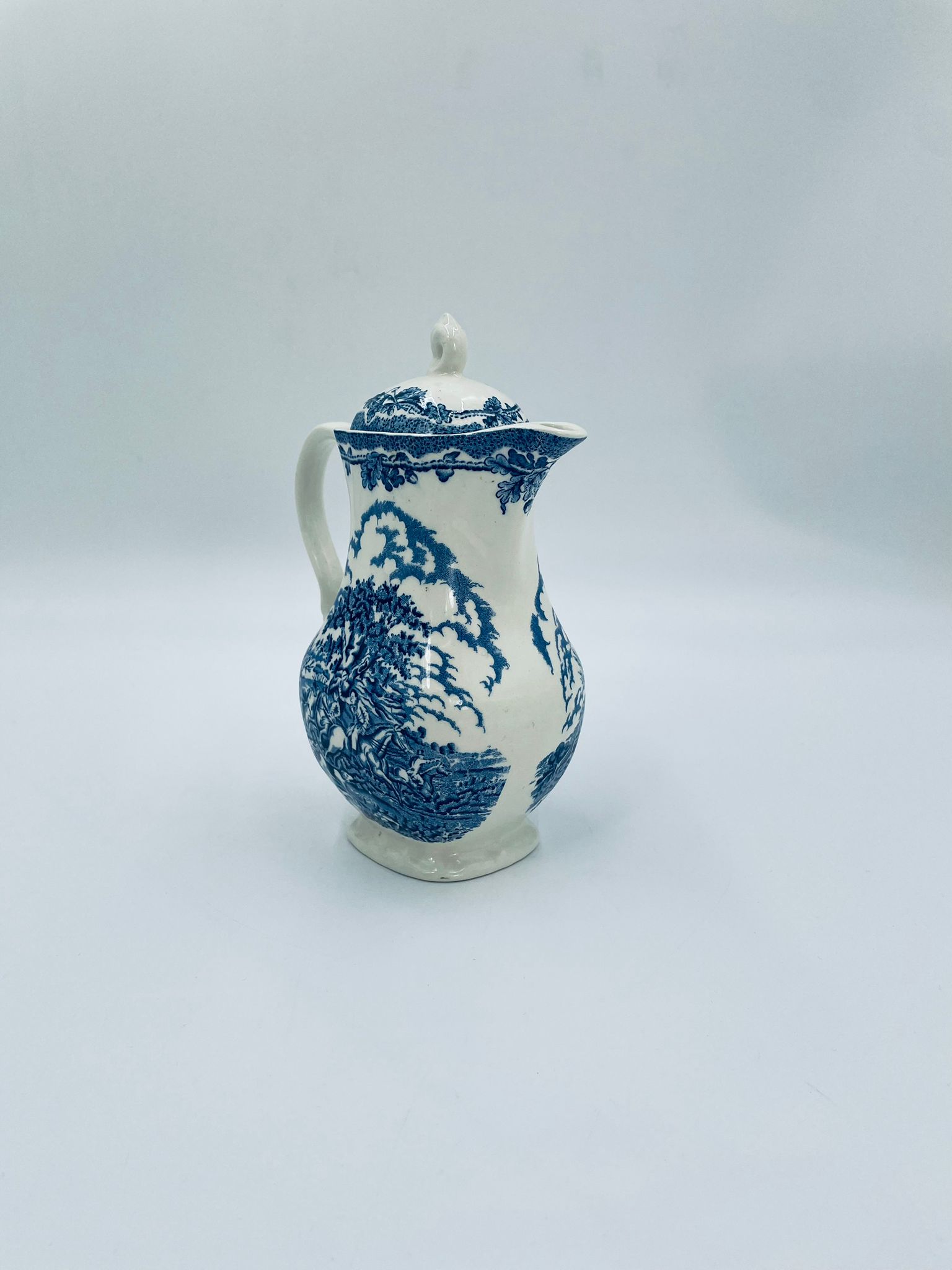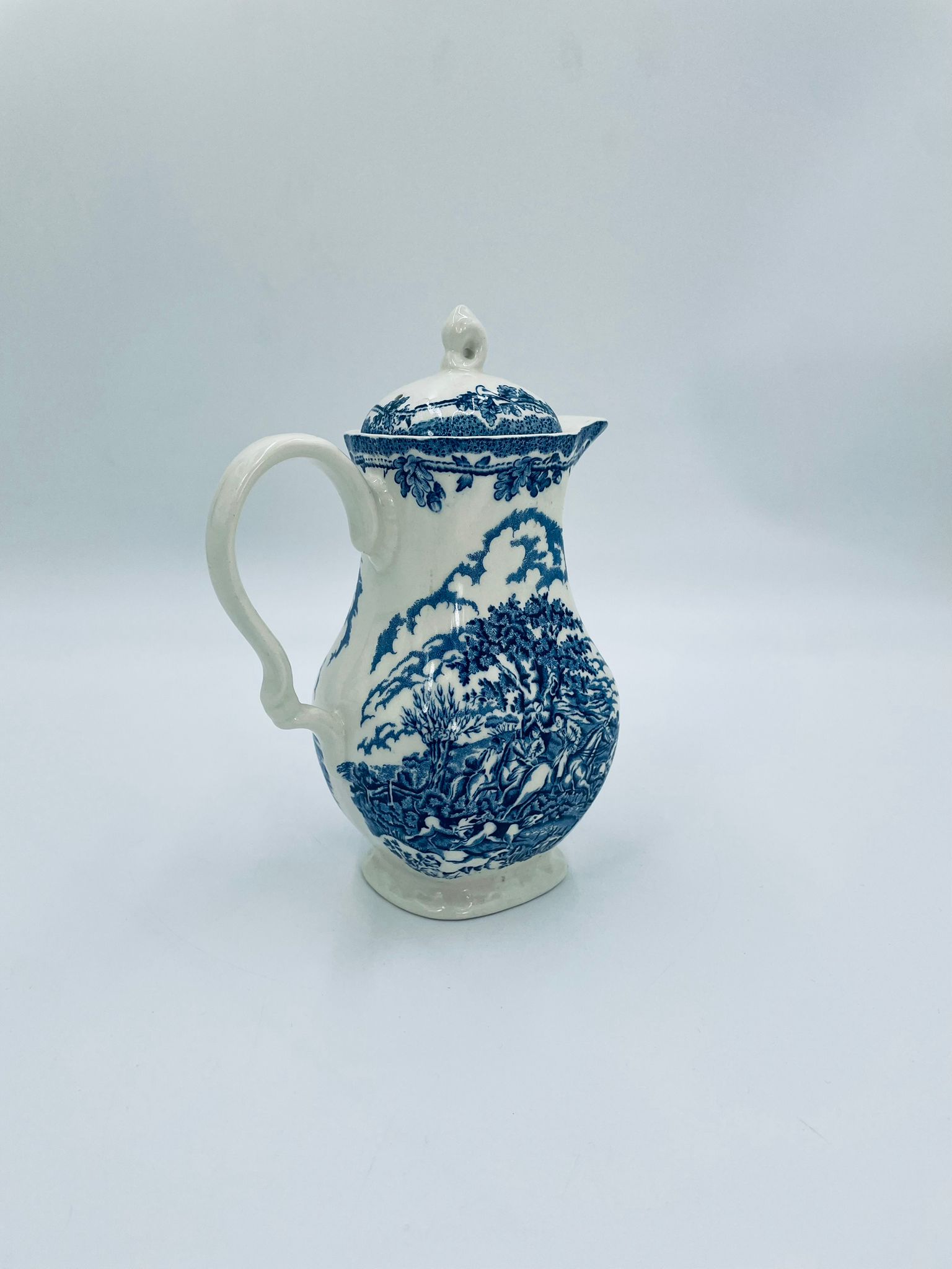 Dzbanek do kawy wytwórni Myotts Country Life, wykonany z wysokie jakości angielskiej porcelany. Dzbanek charakteryzuje się ręcznie grawerowanym, niebieskim wzorem „Country Life” życia na wsi. Posiada ozdoby uchwyt oraz pokrywę z niebieskim wzorem roślinnym. Posiada uszczerbek oraz pęknięcie szkliwa.