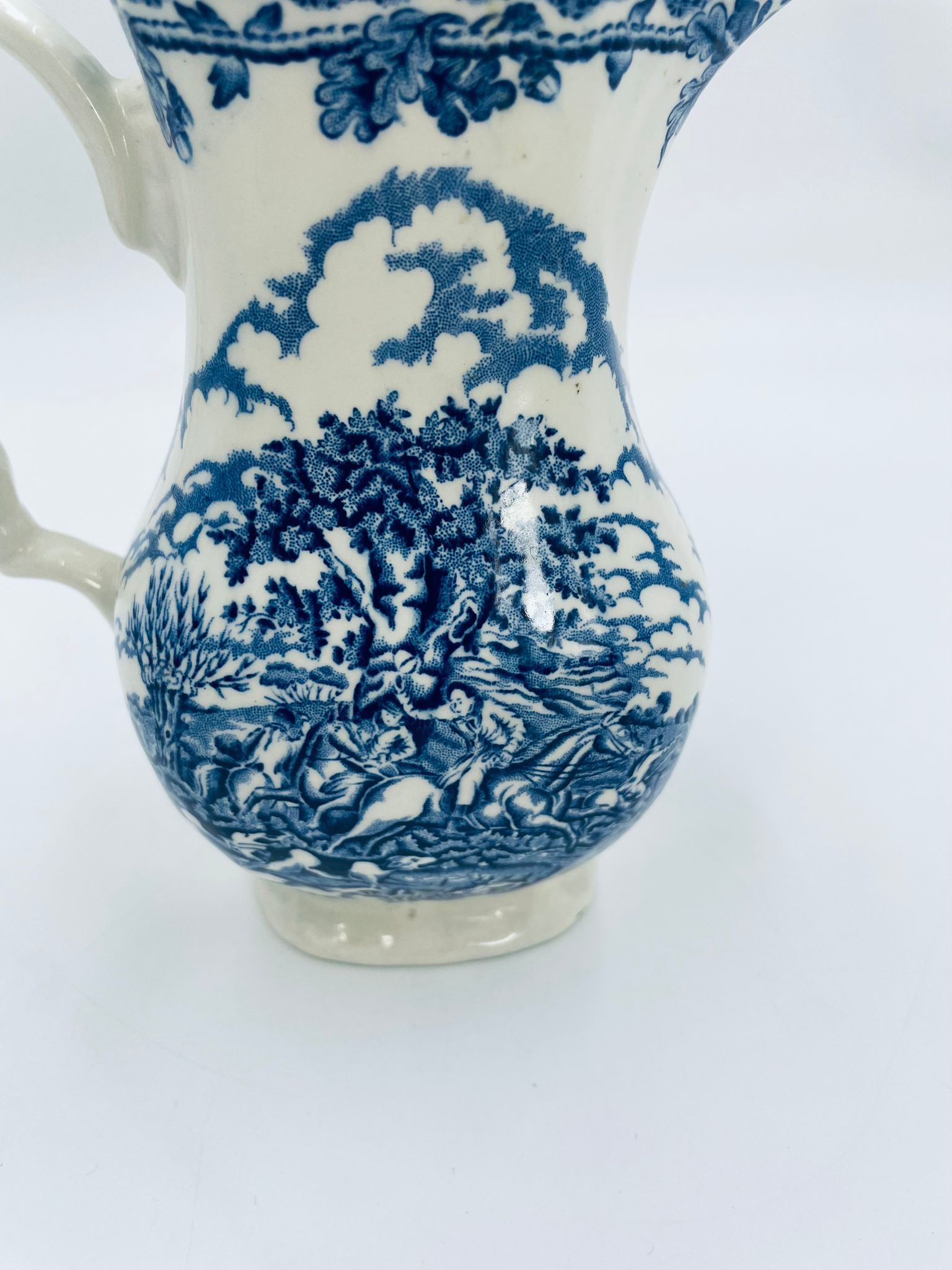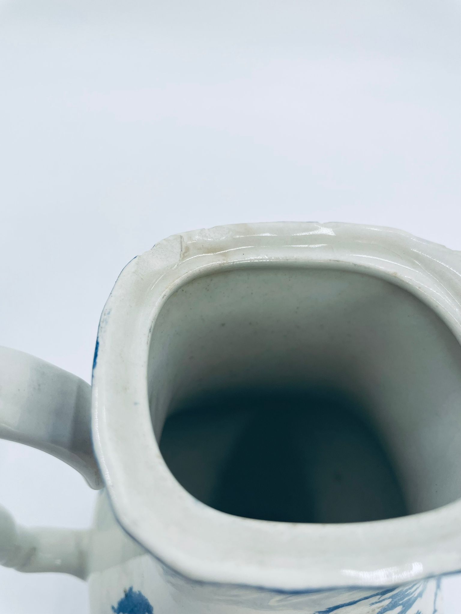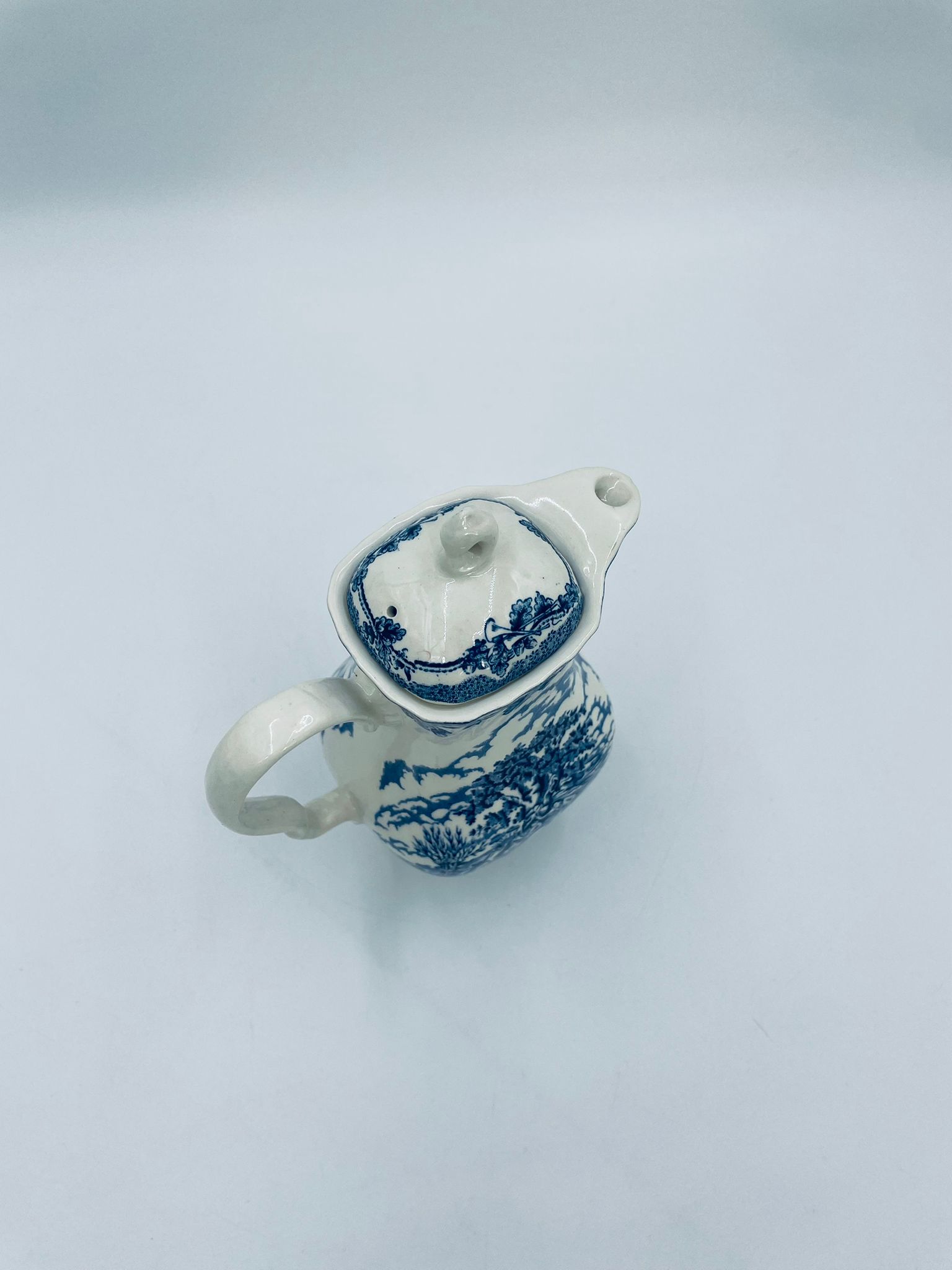 Dzbanek do kawy wytwórni Myotts Country Life, wykonany z wysokie jakości angielskiej porcelany. Dzbanek charakteryzuje się ręcznie grawerowanym, niebieskim wzorem „Country Life” życia na wsi. Posiada ozdoby uchwyt oraz pokrywę z niebieskim wzorem roślinnym. Posiada uszczerbek oraz pęknięcie szkliwa.