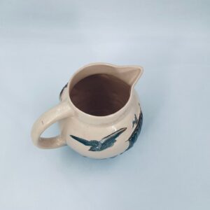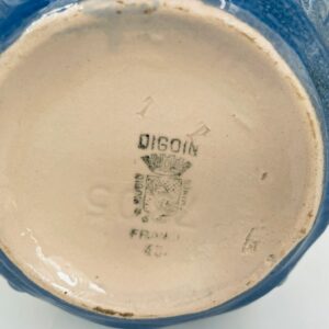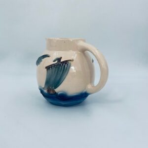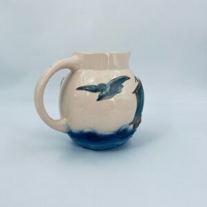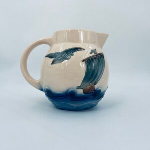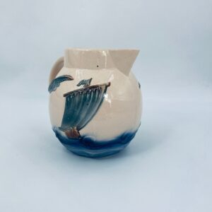 Antyczny i rzadki Dzbanek na wodę francuskiej wytwórni Digoin Sarreguemines, wykonany z ceramiki w stylu Art Deco, datowany w latach 30-40tych XXw. Dzbanek charakteryzuje się dekoracją barbotine (reliefowa) , przedstawiająca fale, mewy oraz żaglówkę na beżowym tle.