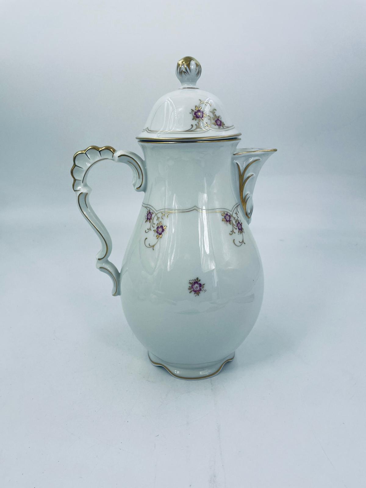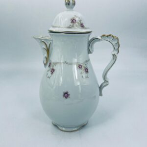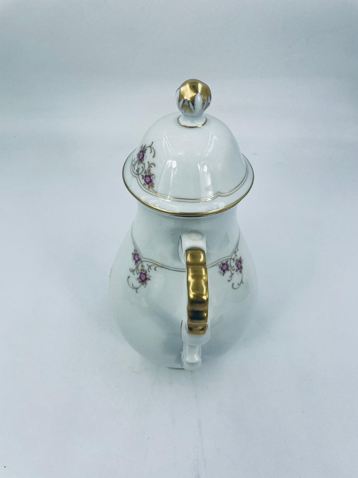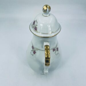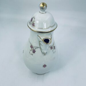 Porcelanowy dzbanek Lindner Handarbeit W.Germany Marie Lisie Jasmin. Biała porcelana z motywem małych różowych kwiatów, wykończona złoceniami. Delikatne przetarcie na rączce dzbanka.