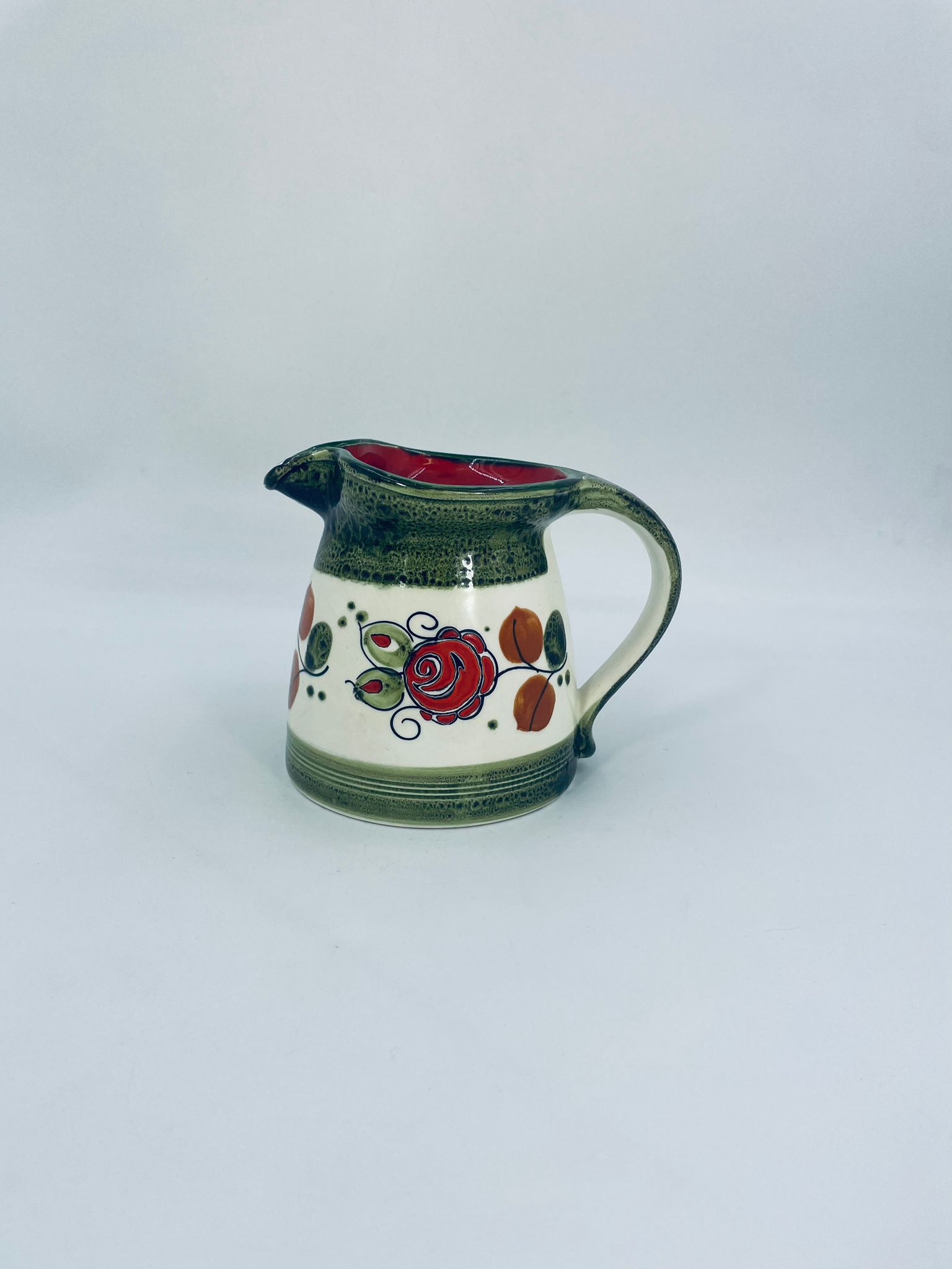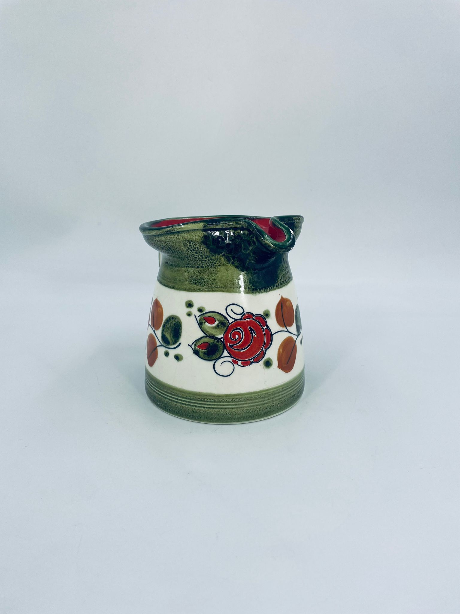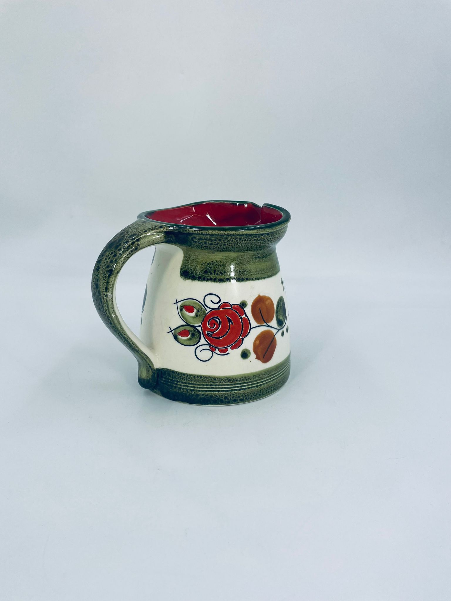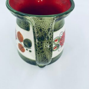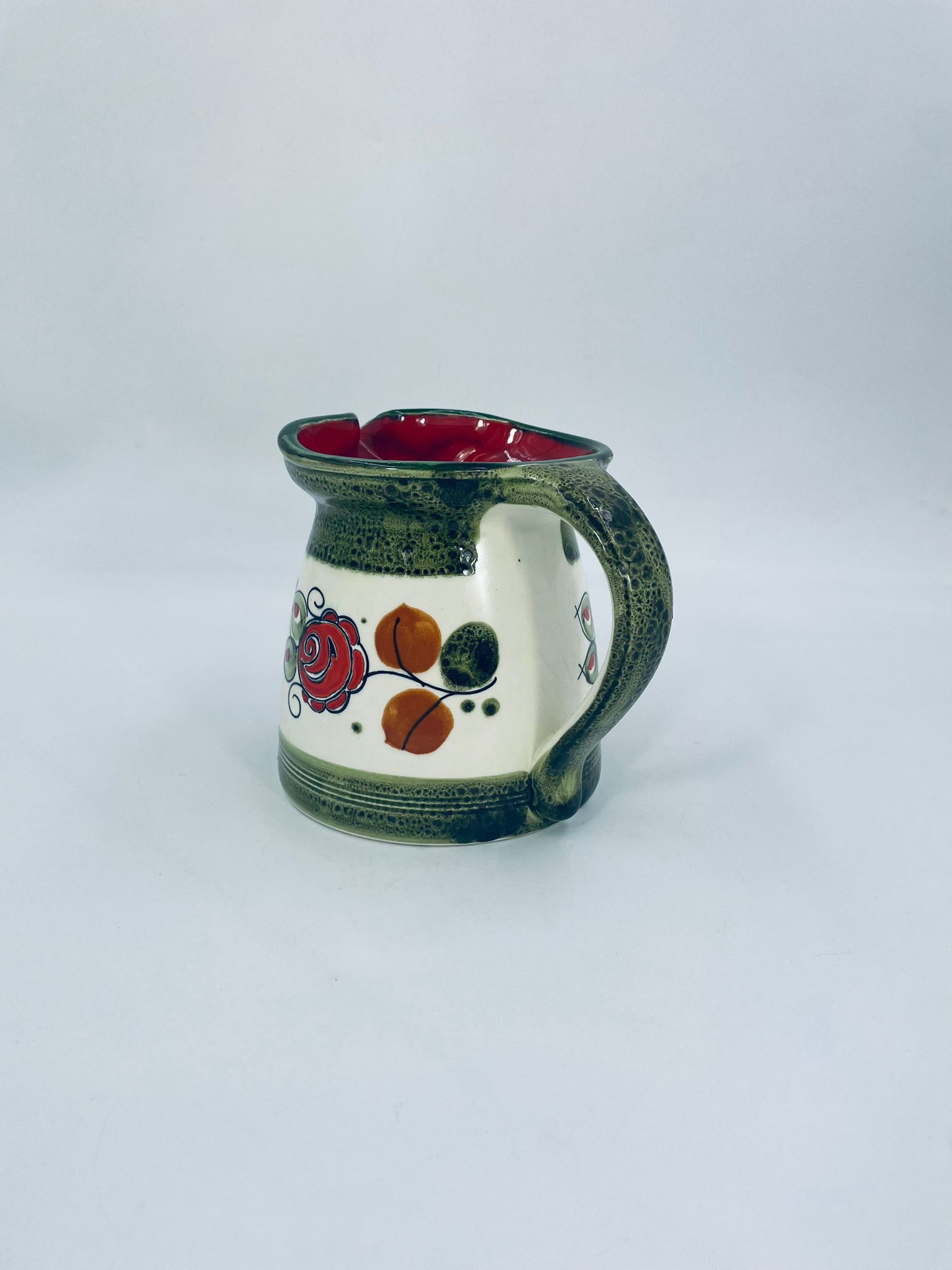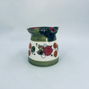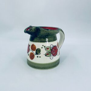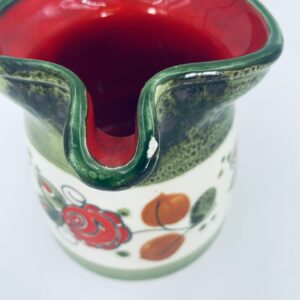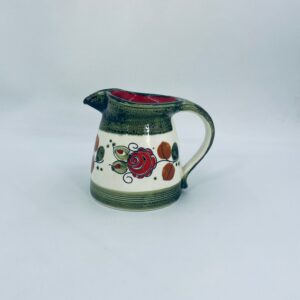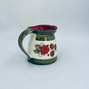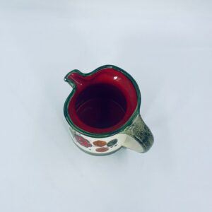Dzbanek na mleko wytworni Schrambergr Tirol. Jest to wyrób majolikowy. Typową cechą wyrobów majolikowych jest obecność krakelury (drobnych spękań szkliwa) na powierzchni. Dzbanek ręcznie malowany we wzory kwiatowe na jasnym tle, z zielonym, nakrapianym wykończeniem przy górnej krawędzi, na podstawie oraz uchwycie. Środek dzbanka w czerwonym kolorze. Posiada pęknięcie szkliwa oraz mały uszczerbek na dzióbku.