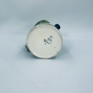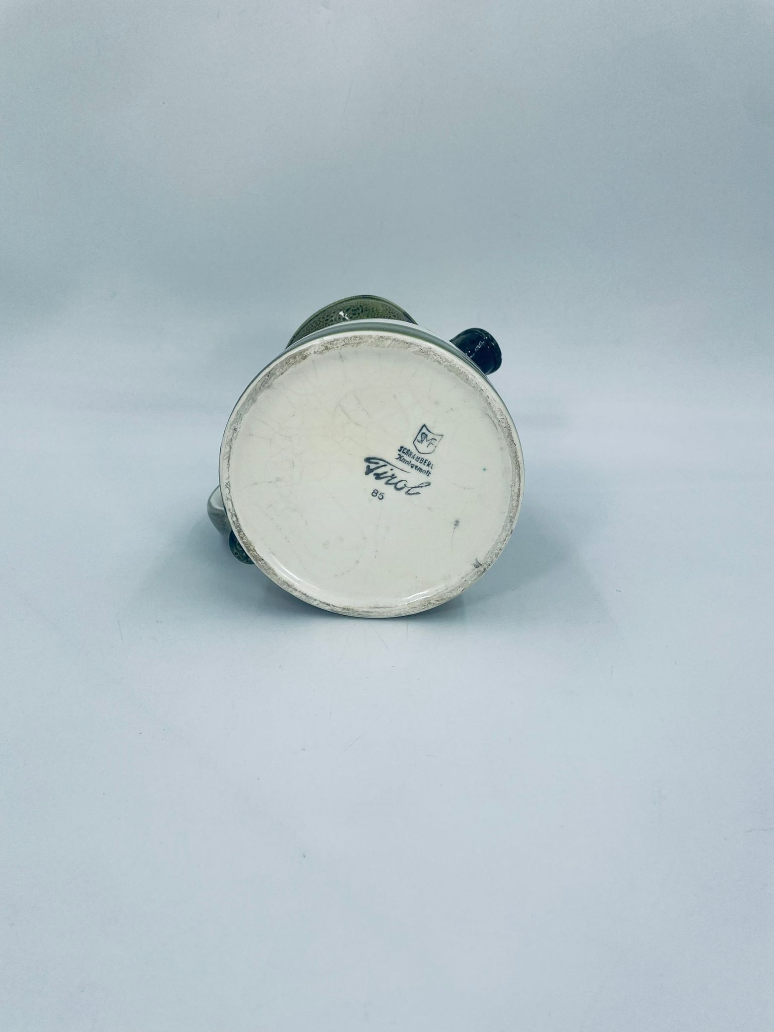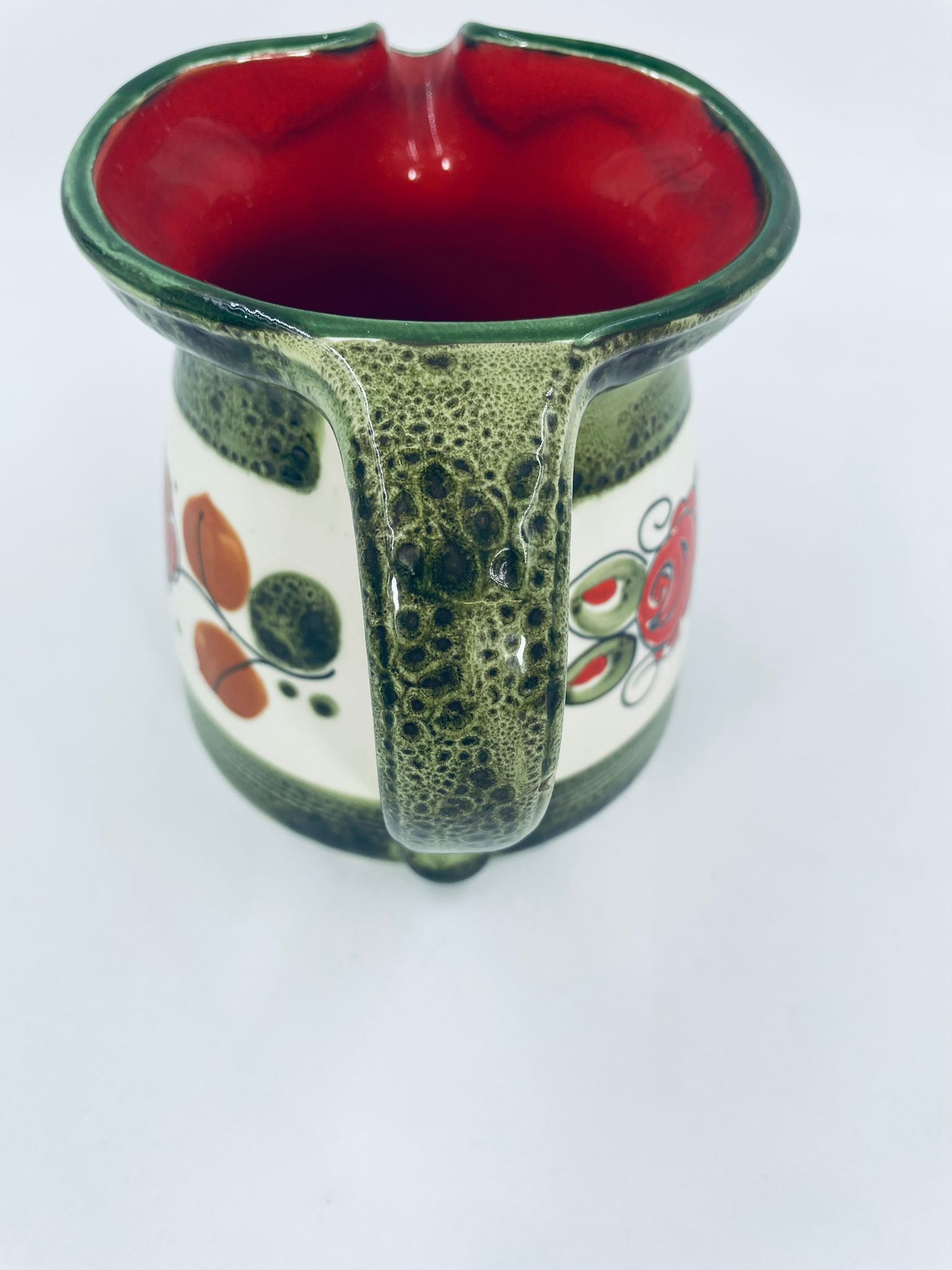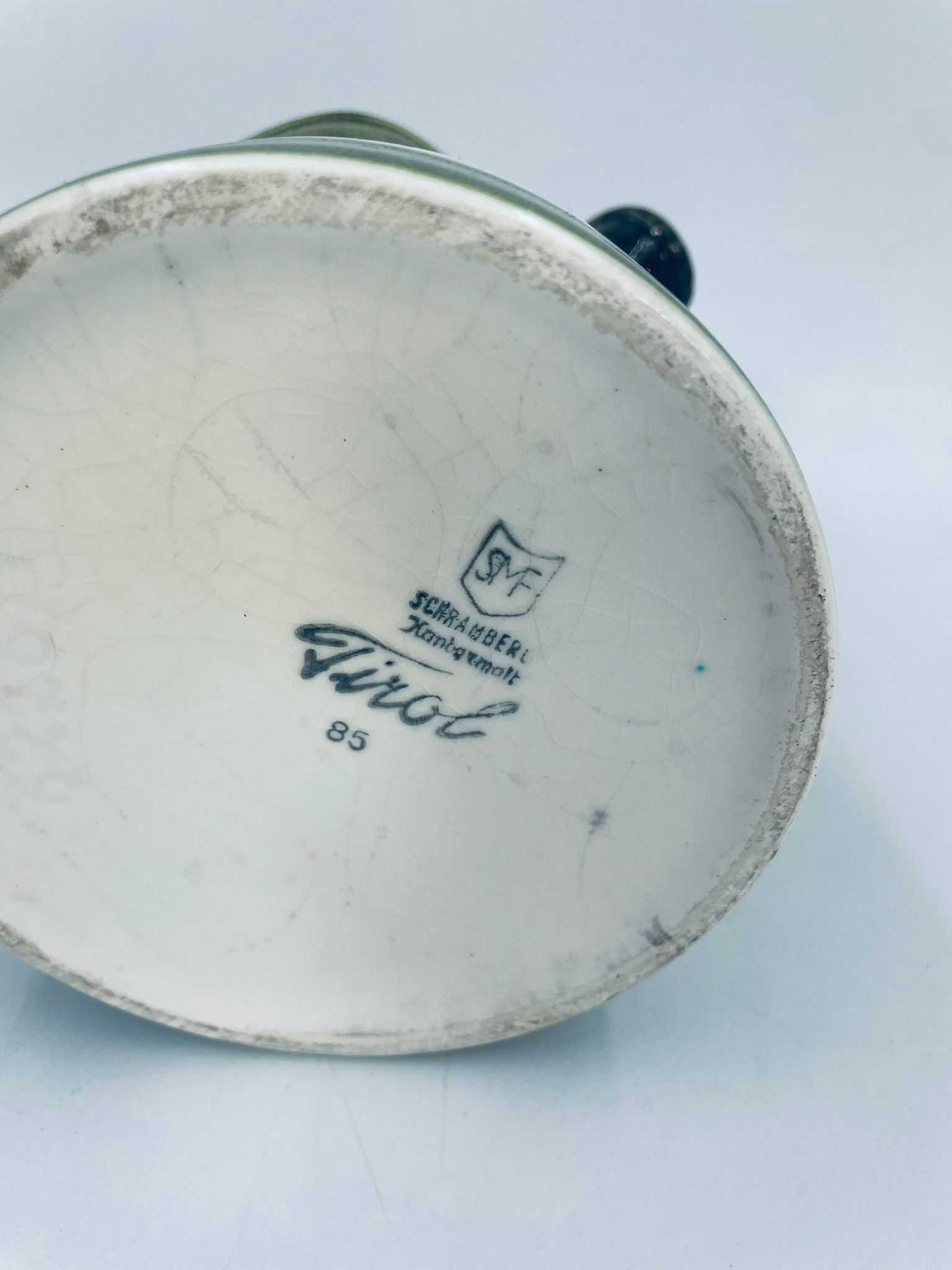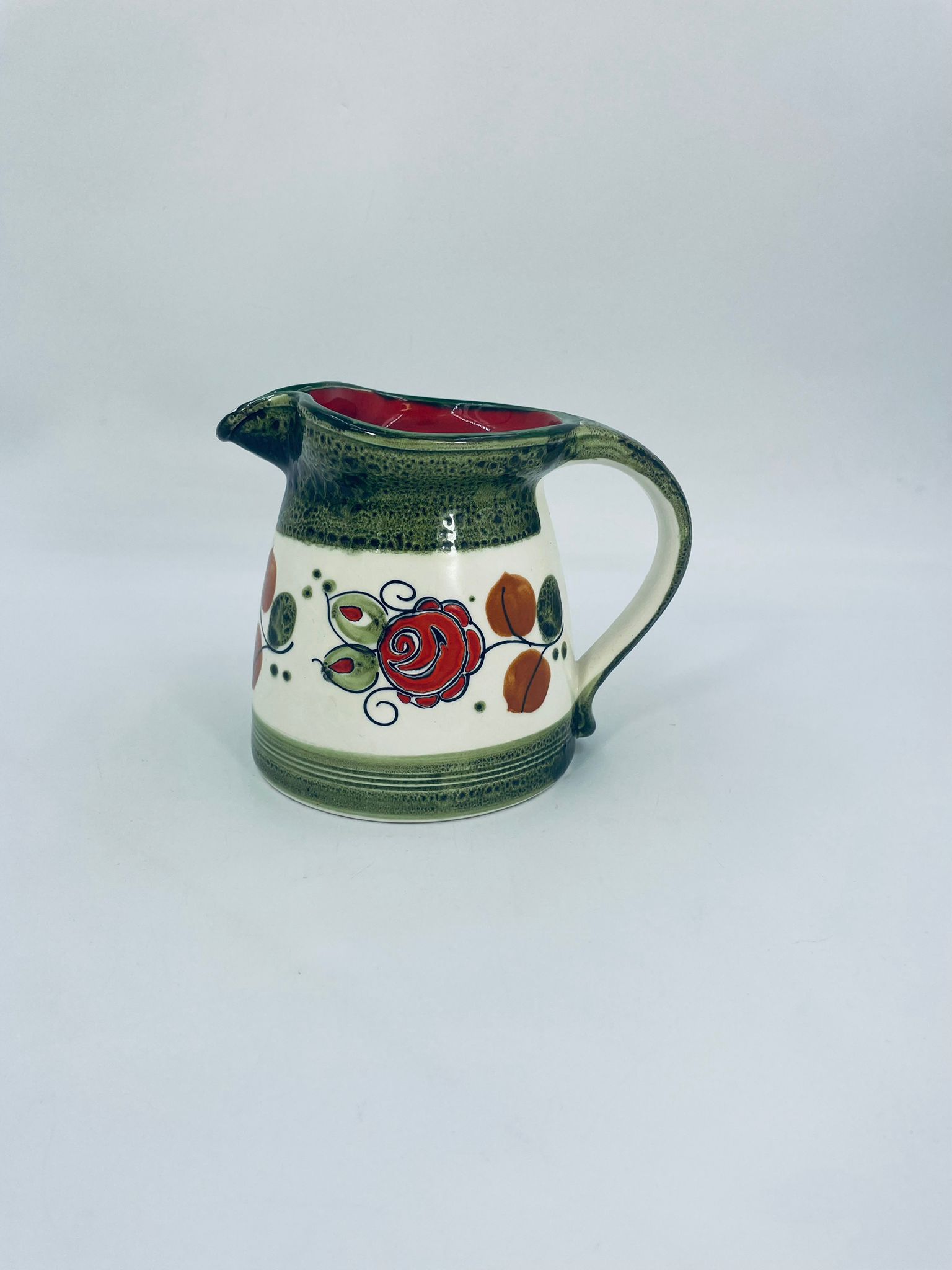 Dzbanek na mleko wytworni Schrambergr Tirol. Jest to wyrób majolikowy. Typową cechą wyrobów majolikowych jest obecność krakelury (drobnych spękań szkliwa) na powierzchni. Dzbanek ręcznie malowany we wzory kwiatowe na jasnym tle, z zielonym, nakrapianym wykończeniem przy górnej krawędzi, na podstawie oraz uchwycie. Środek dzbanka w czerwonym kolorze. Posiada pęknięcie szkliwa oraz mały uszczerbek na dzióbku.