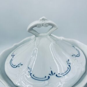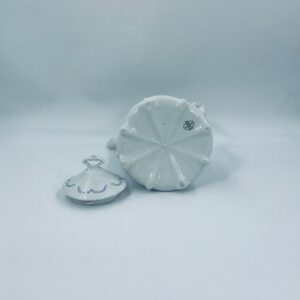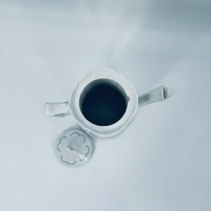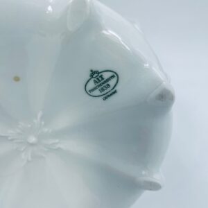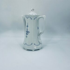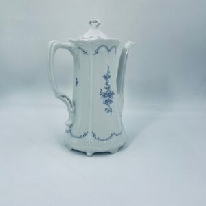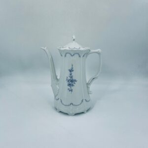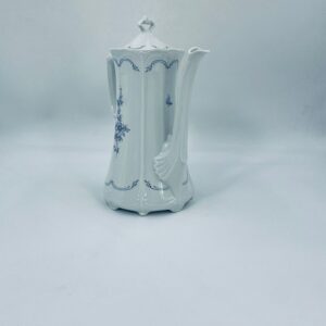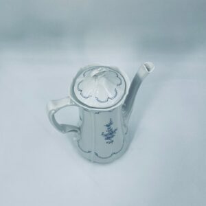 Dzbanek na herbatę wytwórni Tirschenreutch wykonany z wysokiej jakości białej porcelany. Imbryk we wzorze Fleur De Lis Blue, charakteryzujący się niebieskimi akcentami, kwiatowym wzorem, ozdobnymi reliefami i pofalowanym brzegiem.