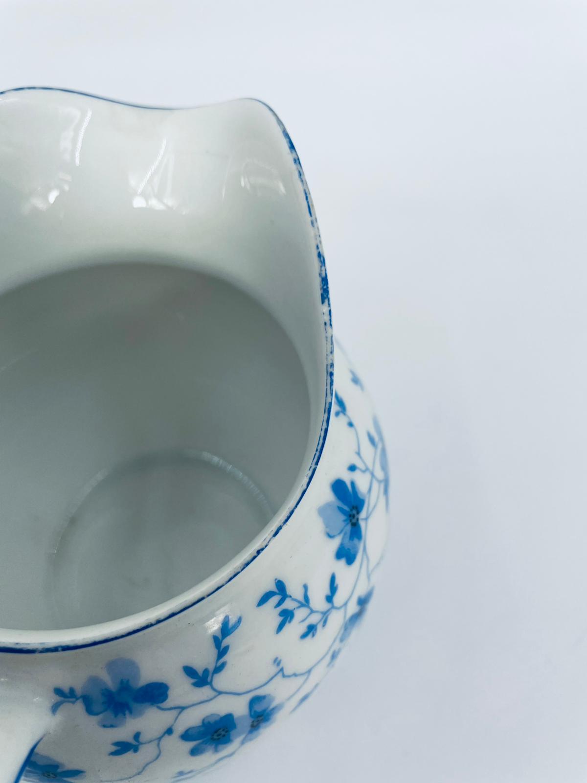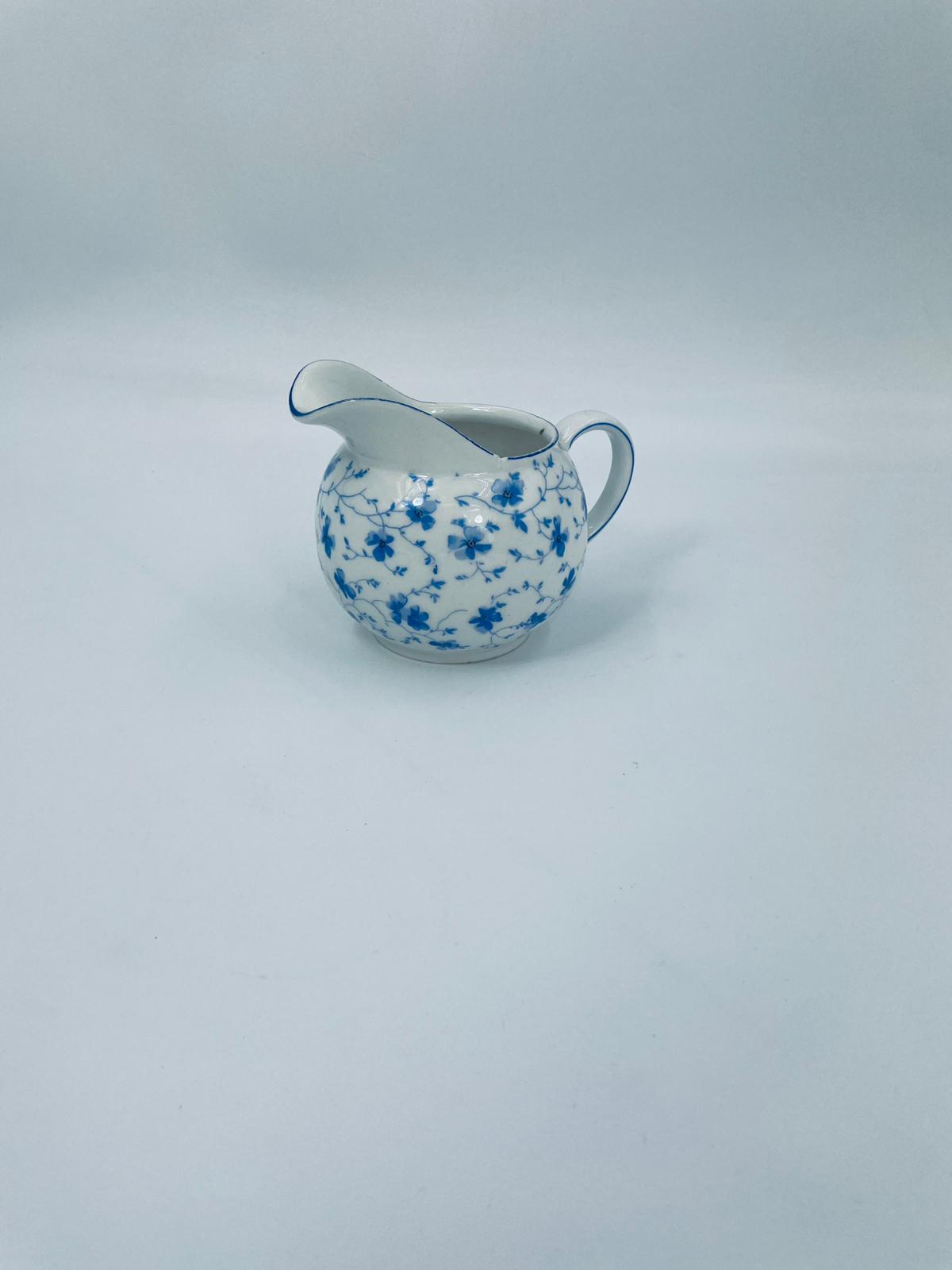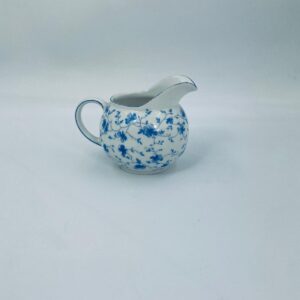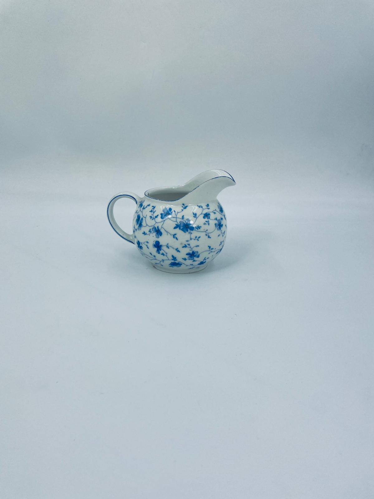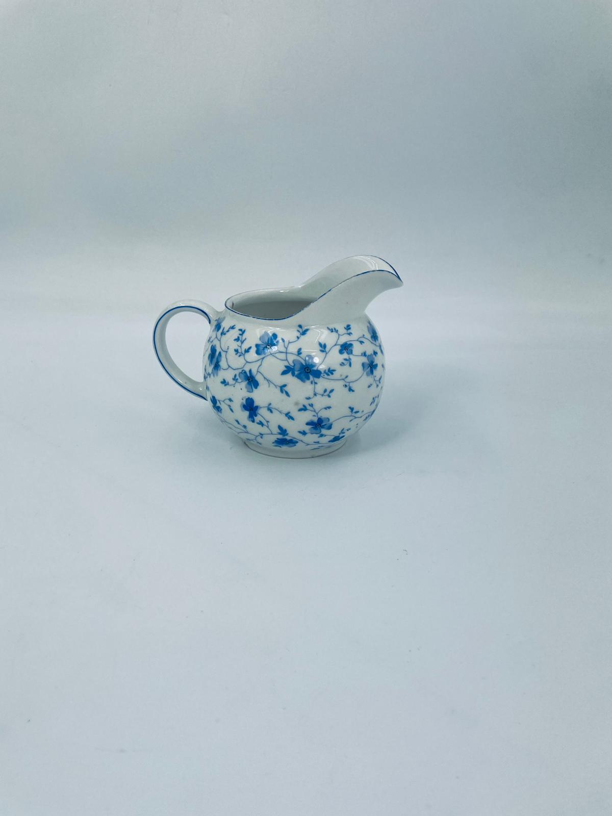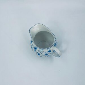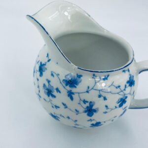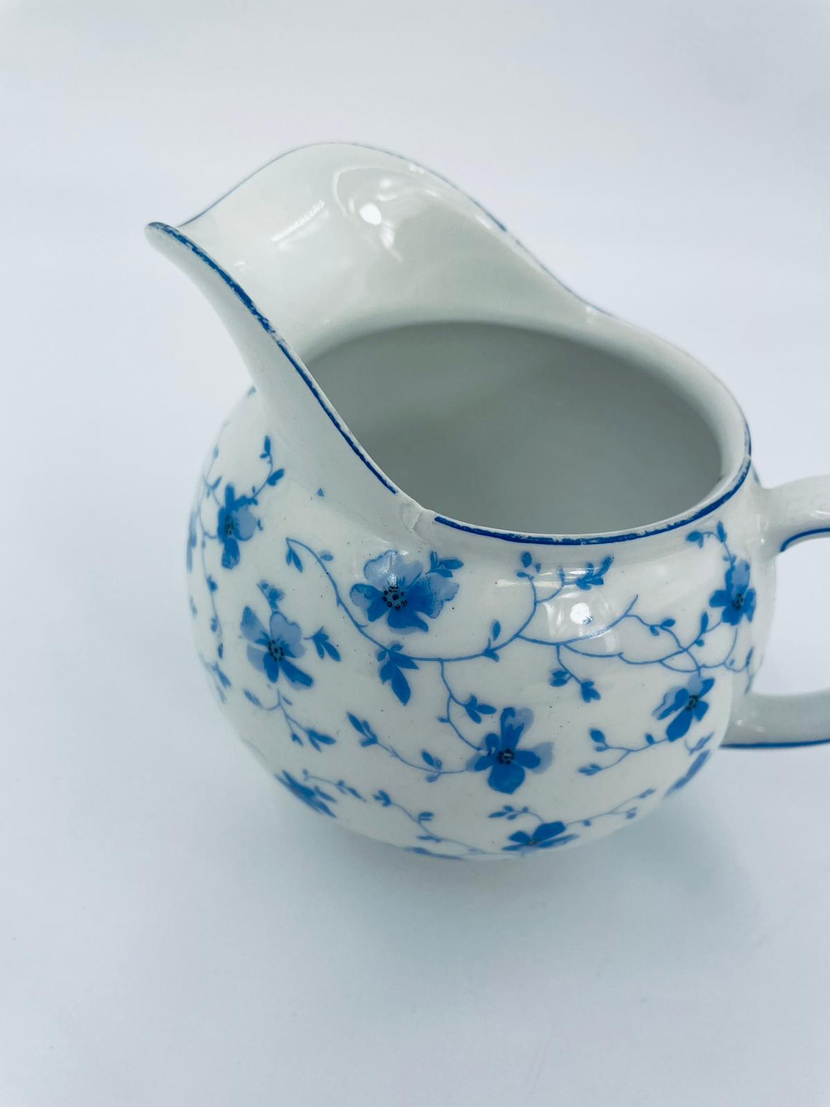 Dzbanek na mleko wytwórni Arzberg, wykonany z wysokiej jakości białej porcelany. Charakteryzuje się delikatnym wzorem niebieskich kwiatków, wykończony kolorem niebieskim na rancie. Posiada przetarcie na rancie oraz mały uszczerbek.
