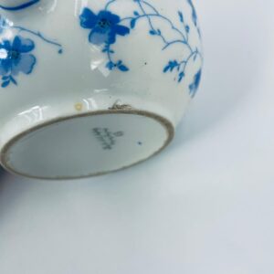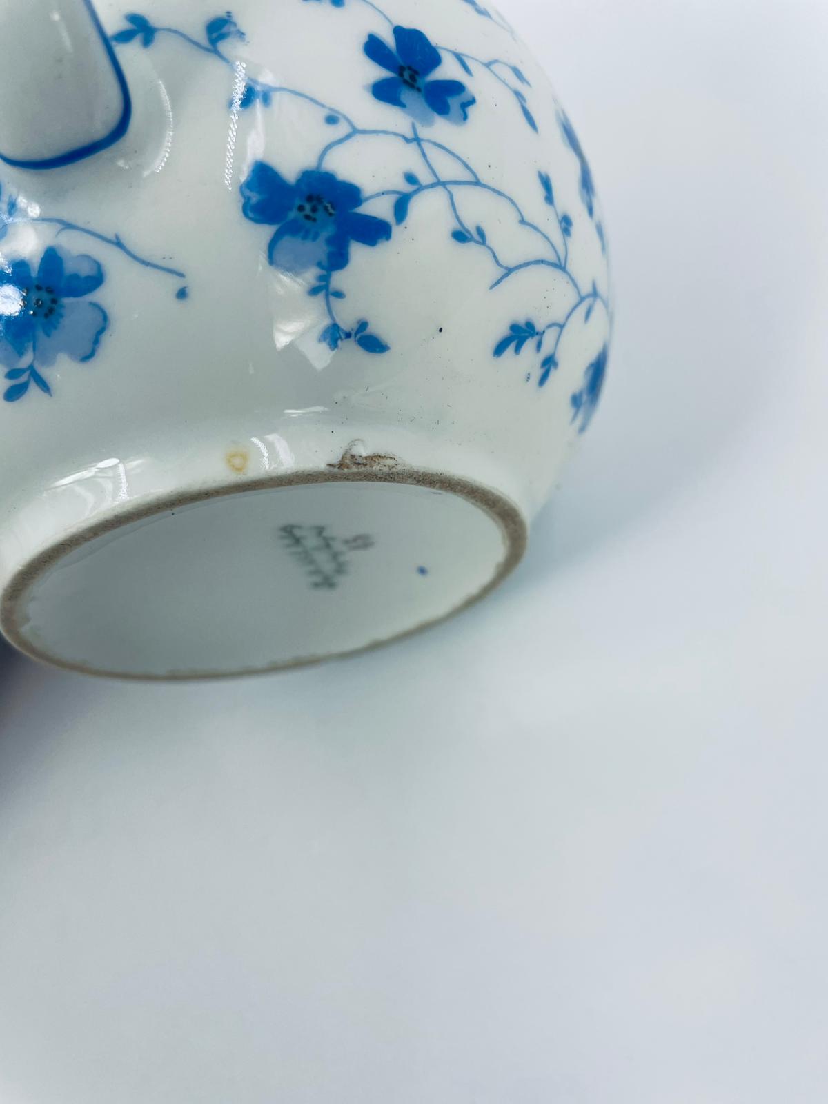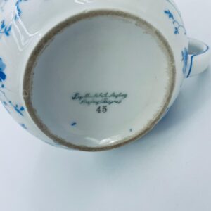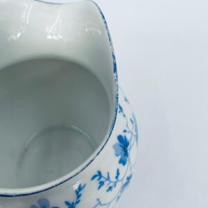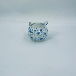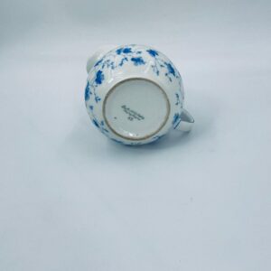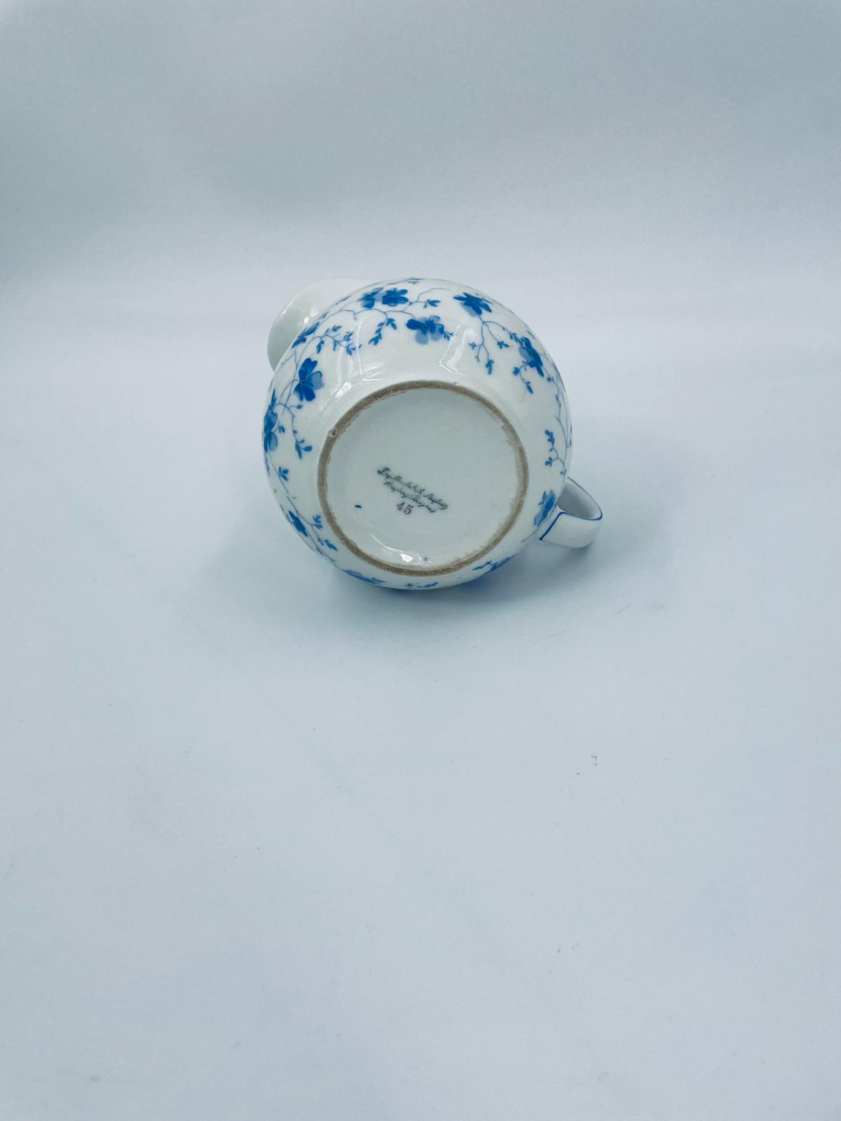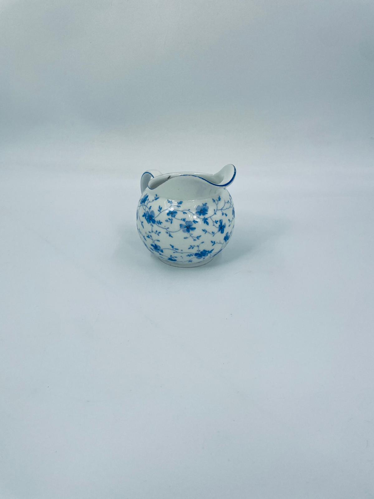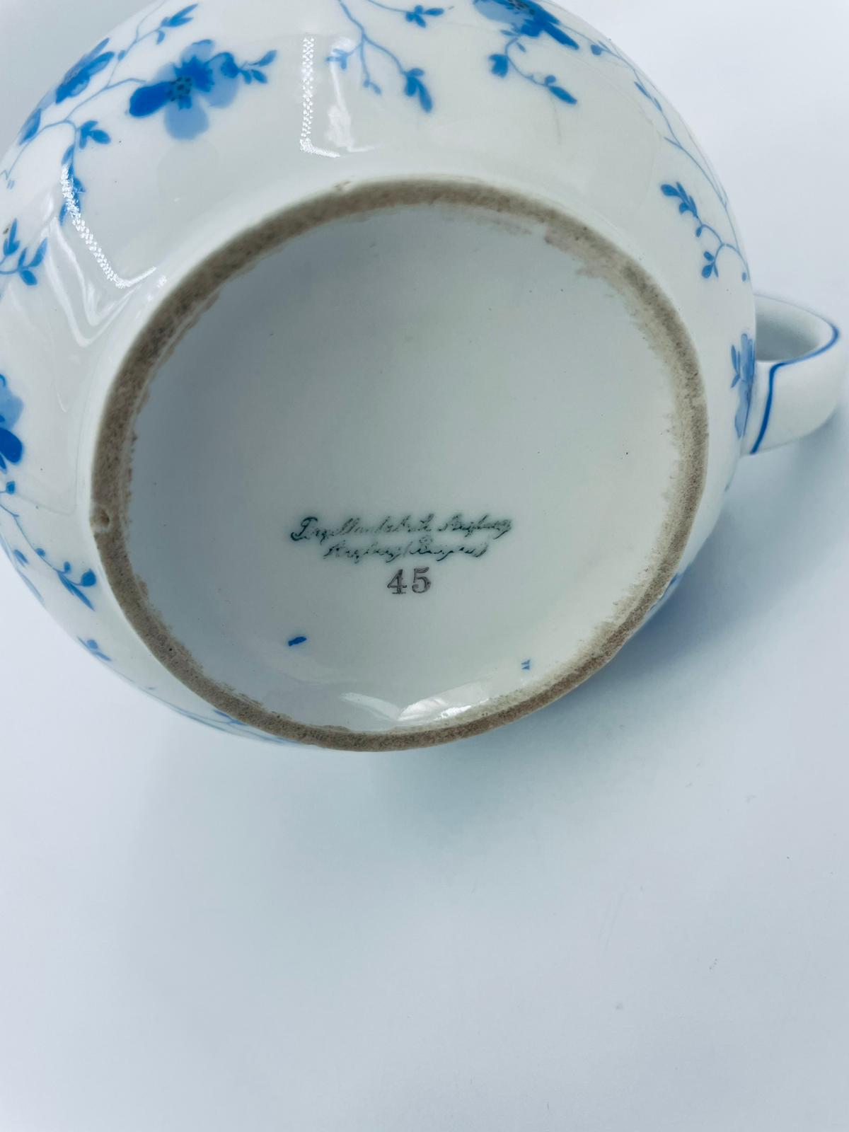 Dzbanek na mleko wytwórni Arzberg, wykonany z wysokiej jakości białej porcelany. Charakteryzuje się delikatnym wzorem niebieskich kwiatków, wykończony kolorem niebieskim na rancie. Posiada przetarcie na rancie oraz mały uszczerbek.