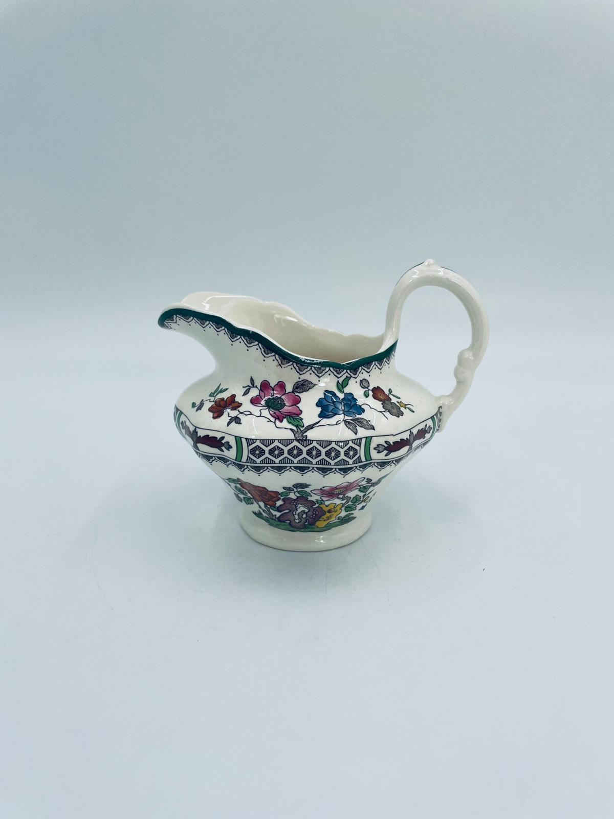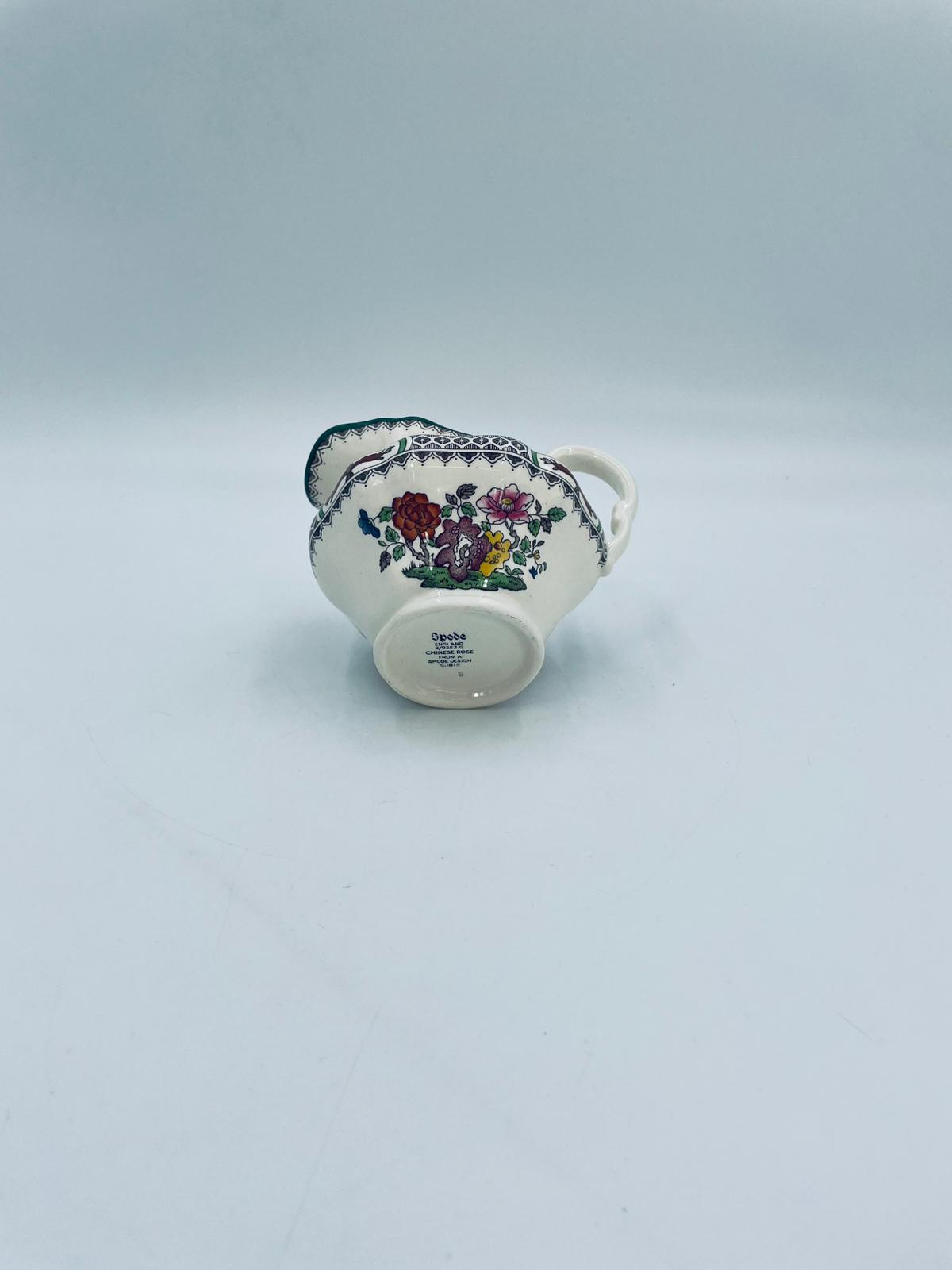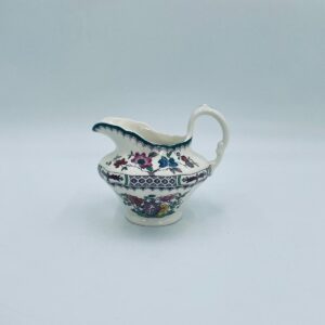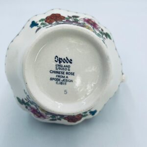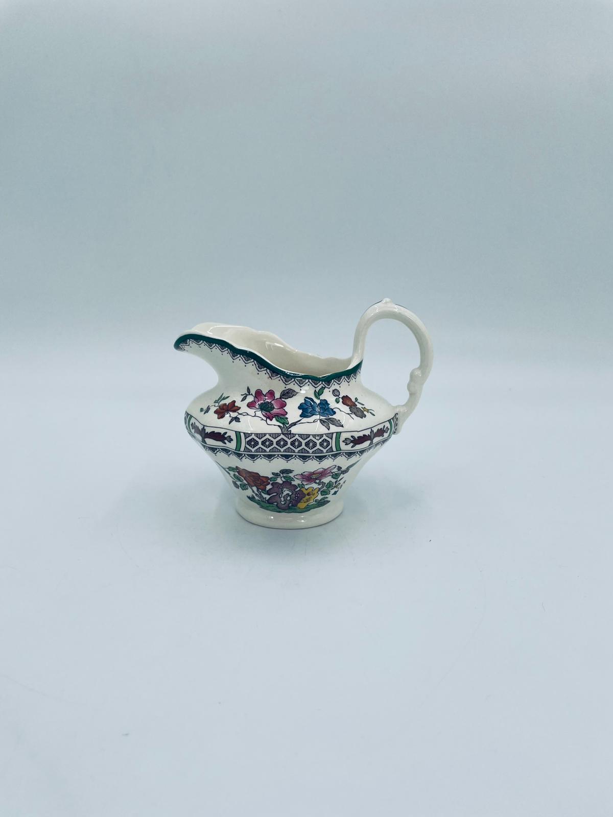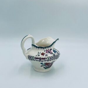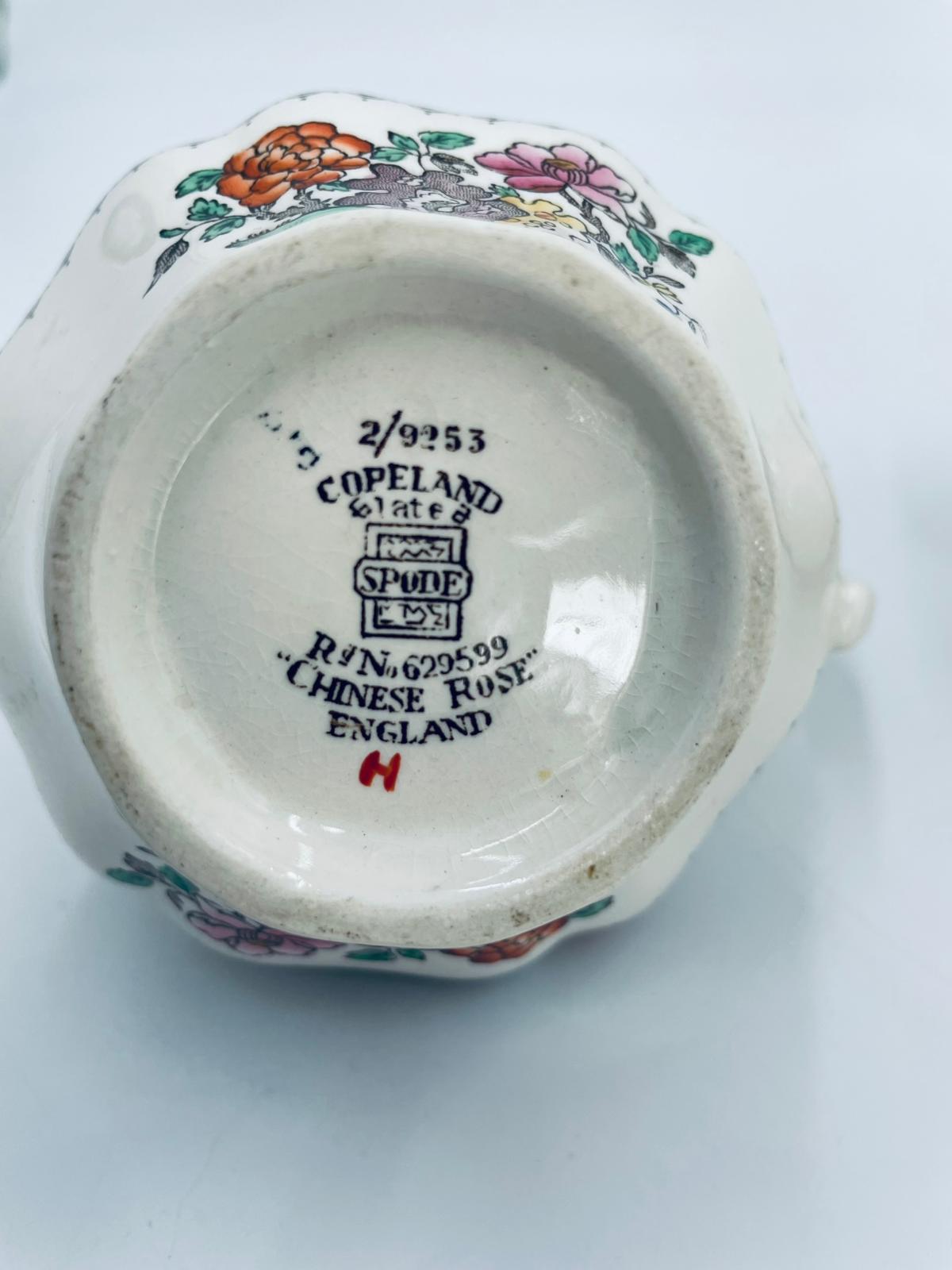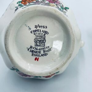 Dzbanuszek na mleko Angielskiej wytwórni Copeland Spode, wykonany z wysokiej jakości porcelany. Mlecznik z dekoracyjnym uchwytem, we wzorze Chinese Rose, charakteryzuje się ręcznie malowanym, kolorowym motywem kwiatowym oraz wzorem geometrycznym, wykończona zieloną obwódką na falistym rancie. posiada pęknięcie szkliwa.