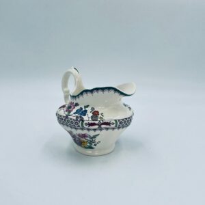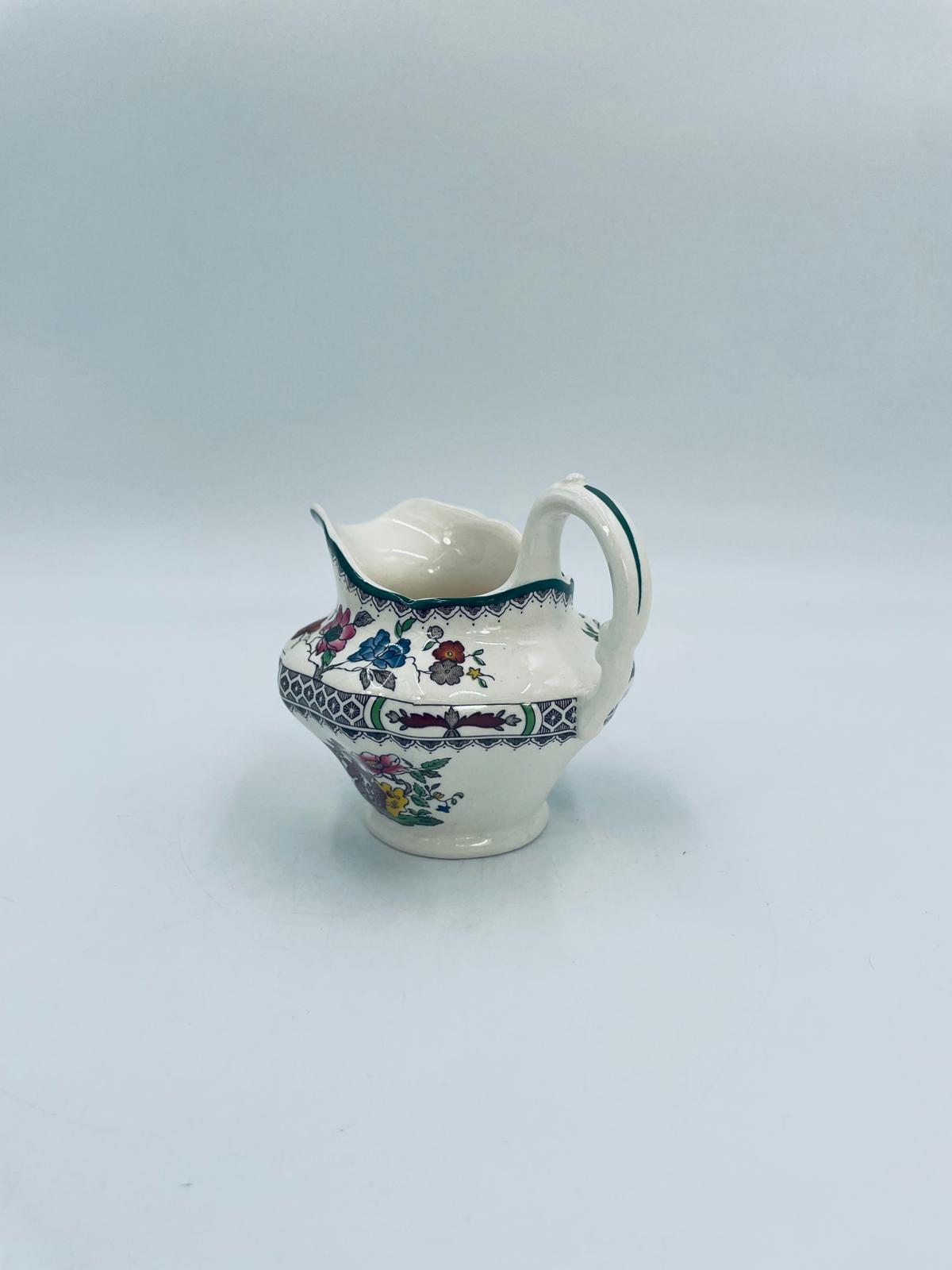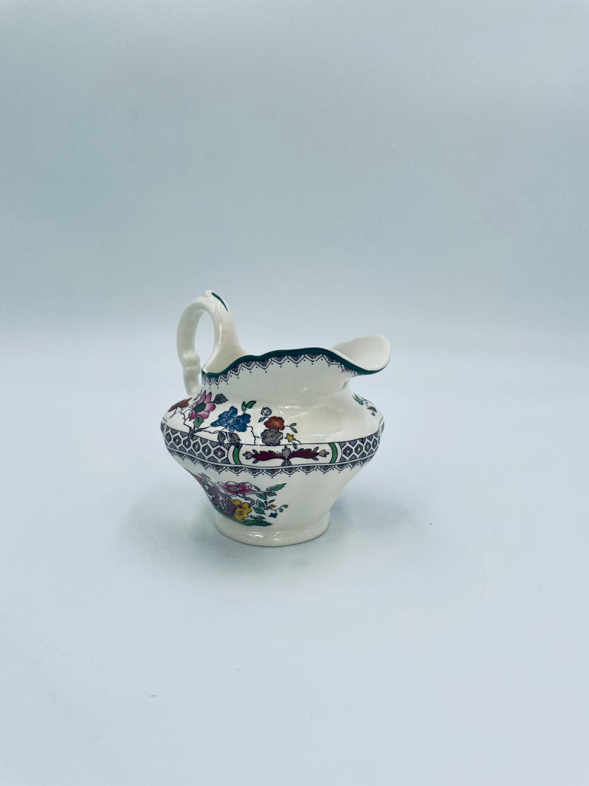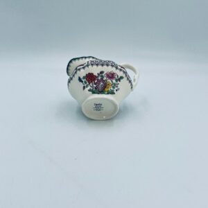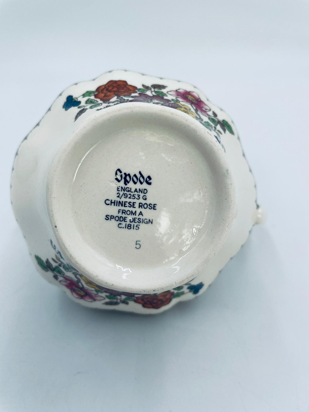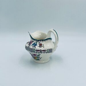Dzbanuszek na mleko Angielskiej wytwórni Copeland Spode, wykonany z wysokiej jakości porcelany. Mlecznik z dekoracyjnym uchwytem, we wzorze Chinese Rose, charakteryzuje się ręcznie malowanym, kolorowym motywem kwiatowym oraz wzorem geometrycznym, wykończona zieloną obwódką na falistym rancie. posiada pęknięcie szkliwa.