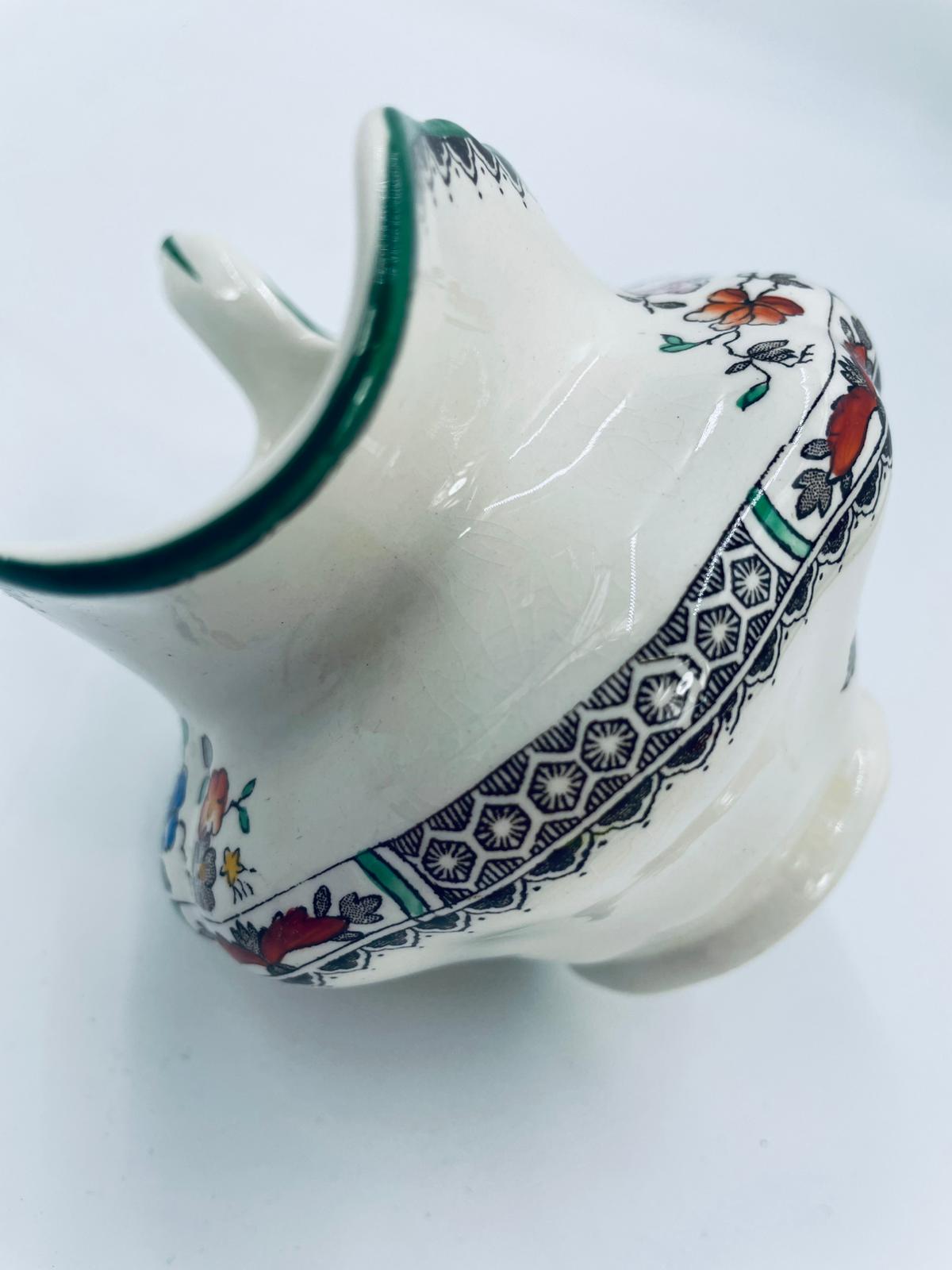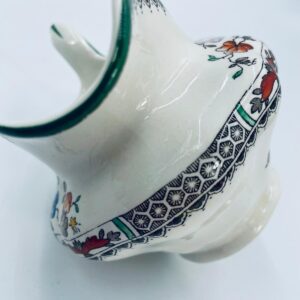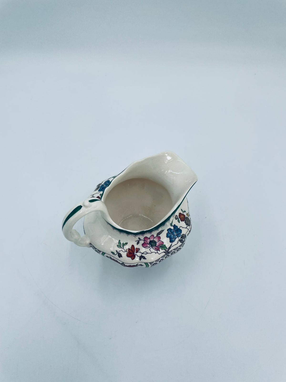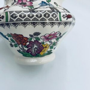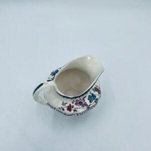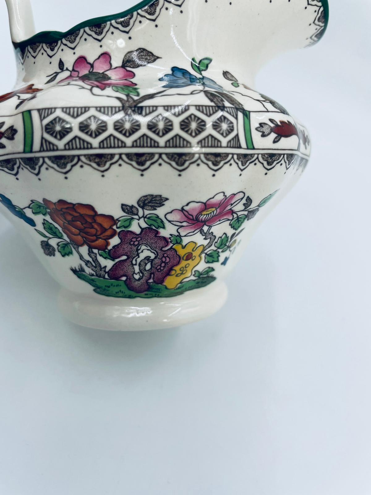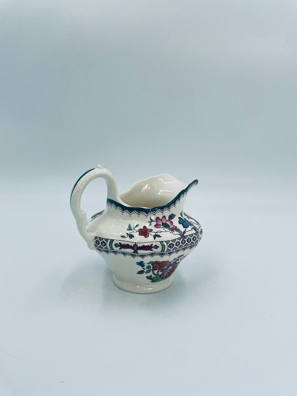 Dzbanuszek na mleko Angielskiej wytwórni Copeland Spode, wykonany z wysokiej jakości porcelany. Mlecznik z dekoracyjnym uchwytem, we wzorze Chinese Rose, charakteryzuje się ręcznie malowanym, kolorowym motywem kwiatowym oraz wzorem geometrycznym, wykończona zieloną obwódką na falistym rancie. posiada pęknięcie szkliwa.
