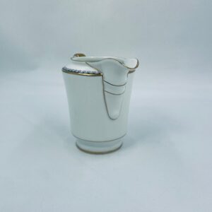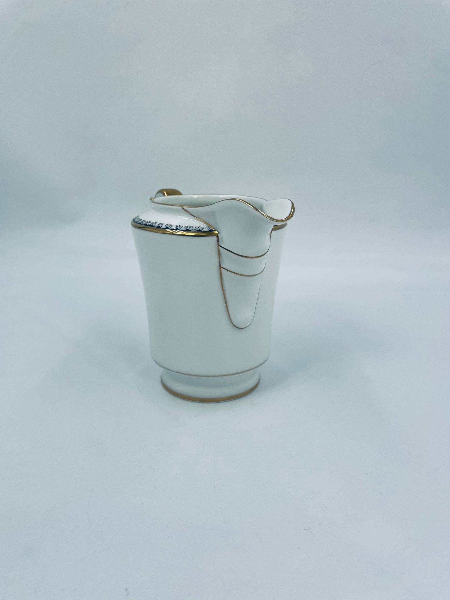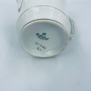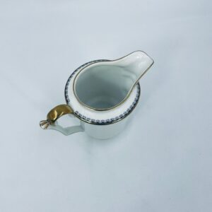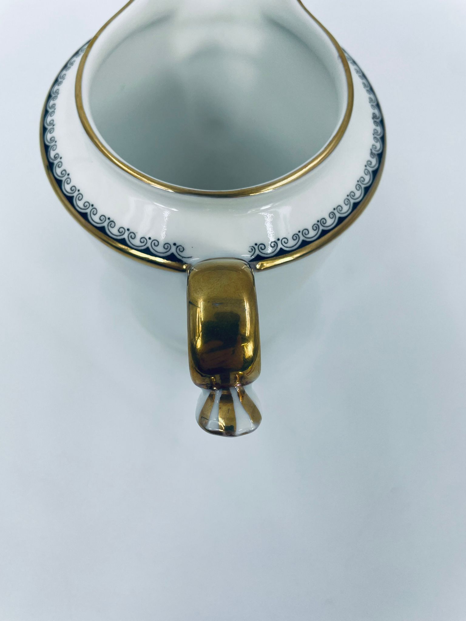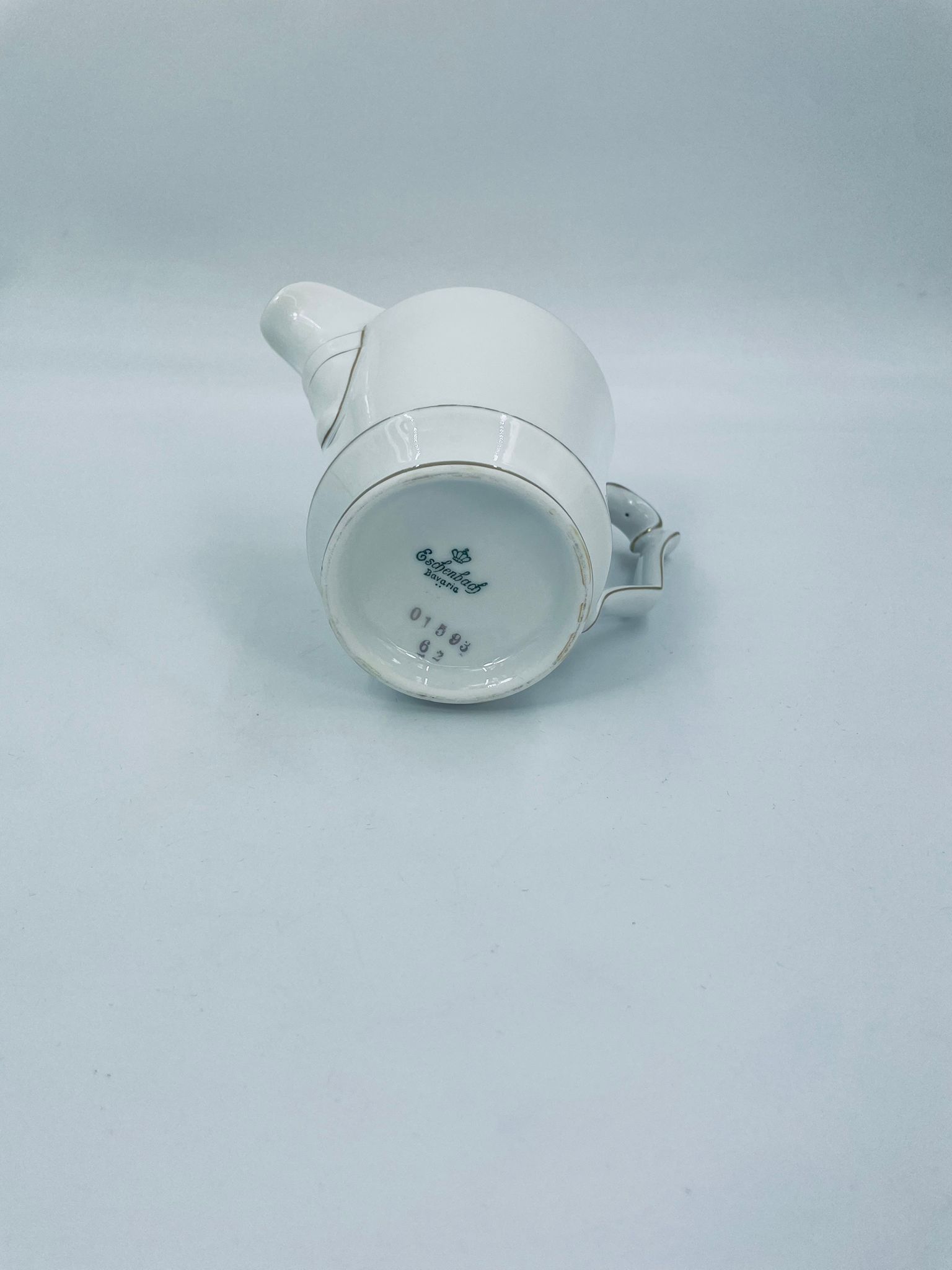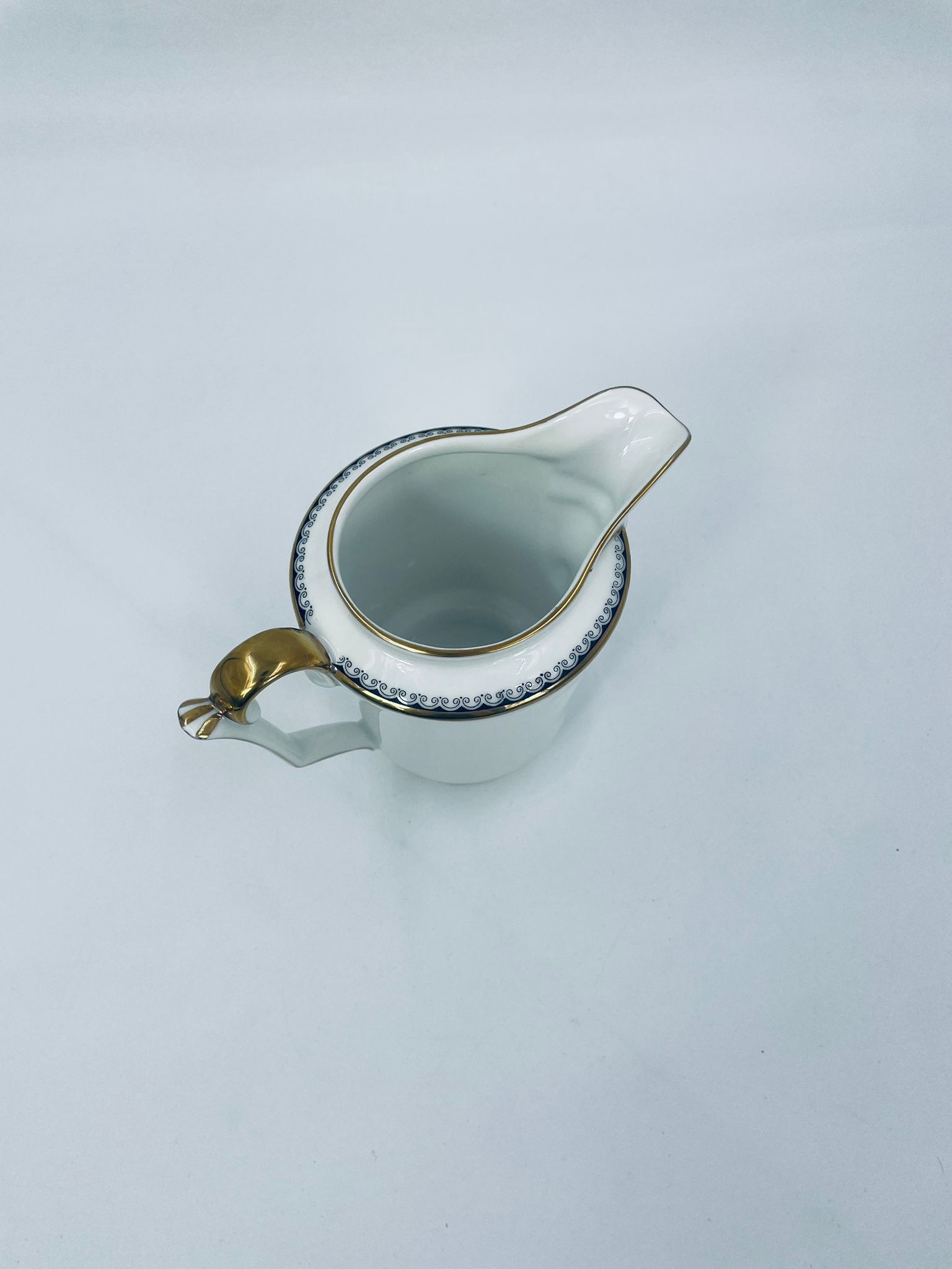 Dzbanek na mleko wytwórni Eschenbach Bavaria, wykonany z wysokiej jakości białej porcelany. Mlecznik z ozdobnym uchwytem, ozdobiony czarnym wzorem, wykończony złoceniem na rantach.
