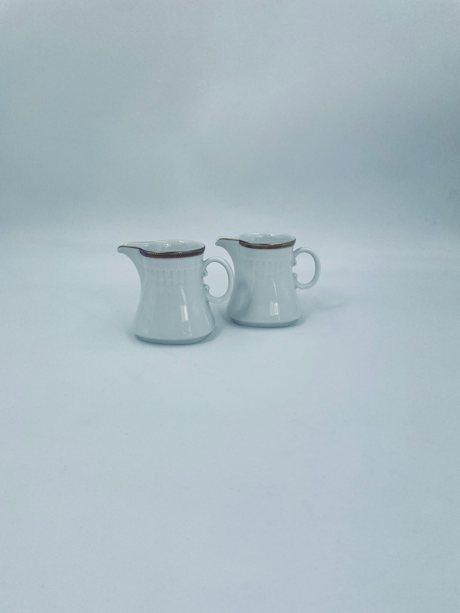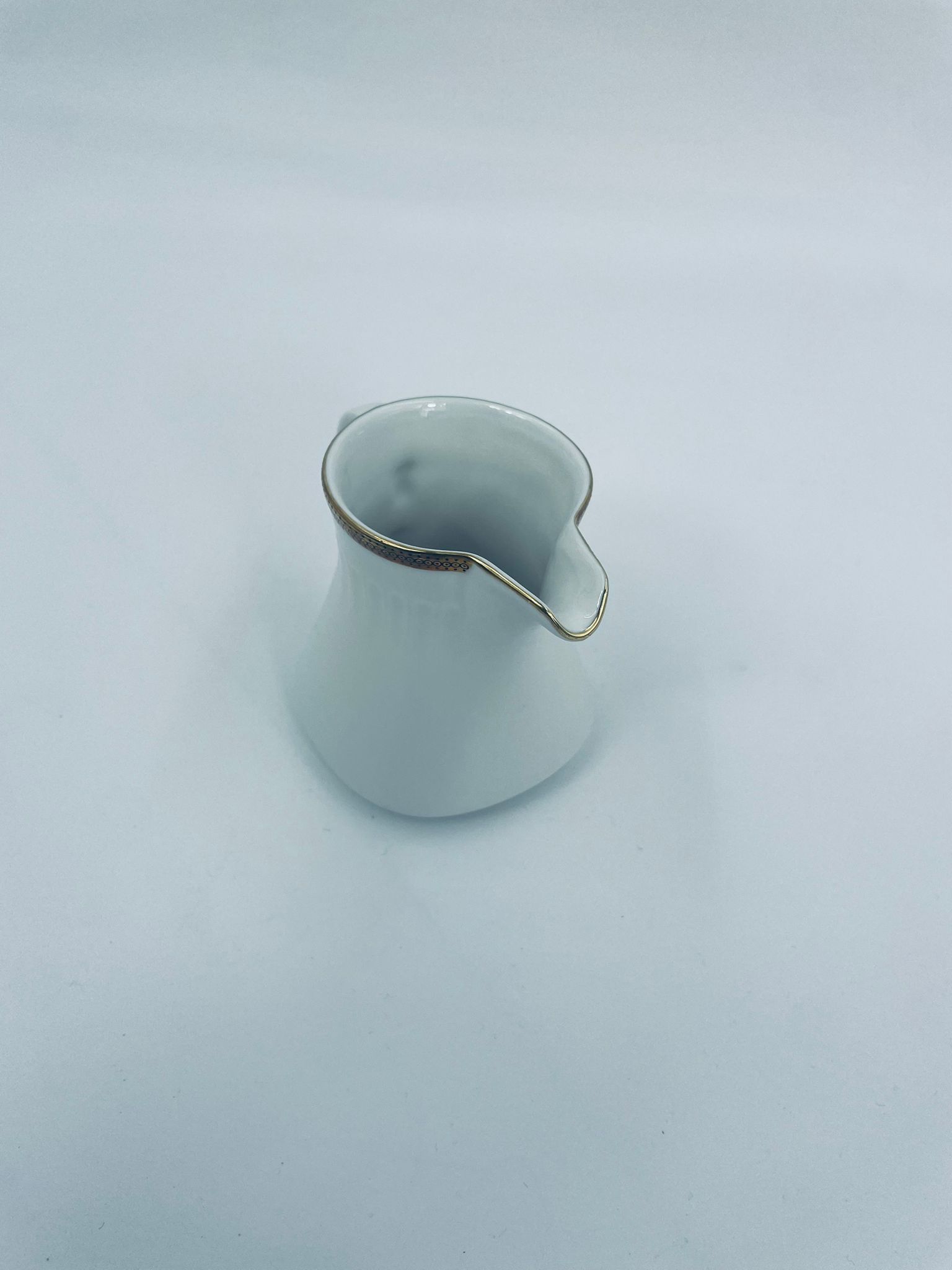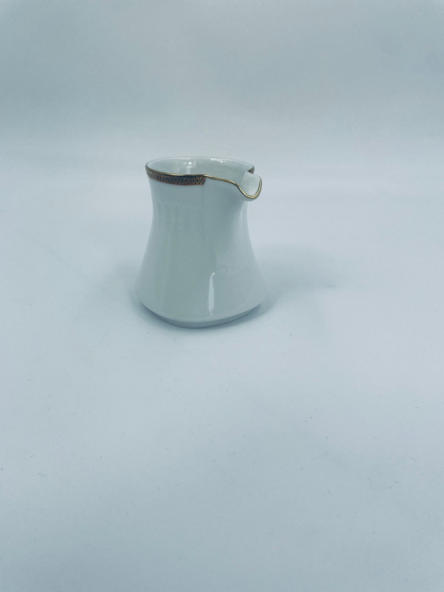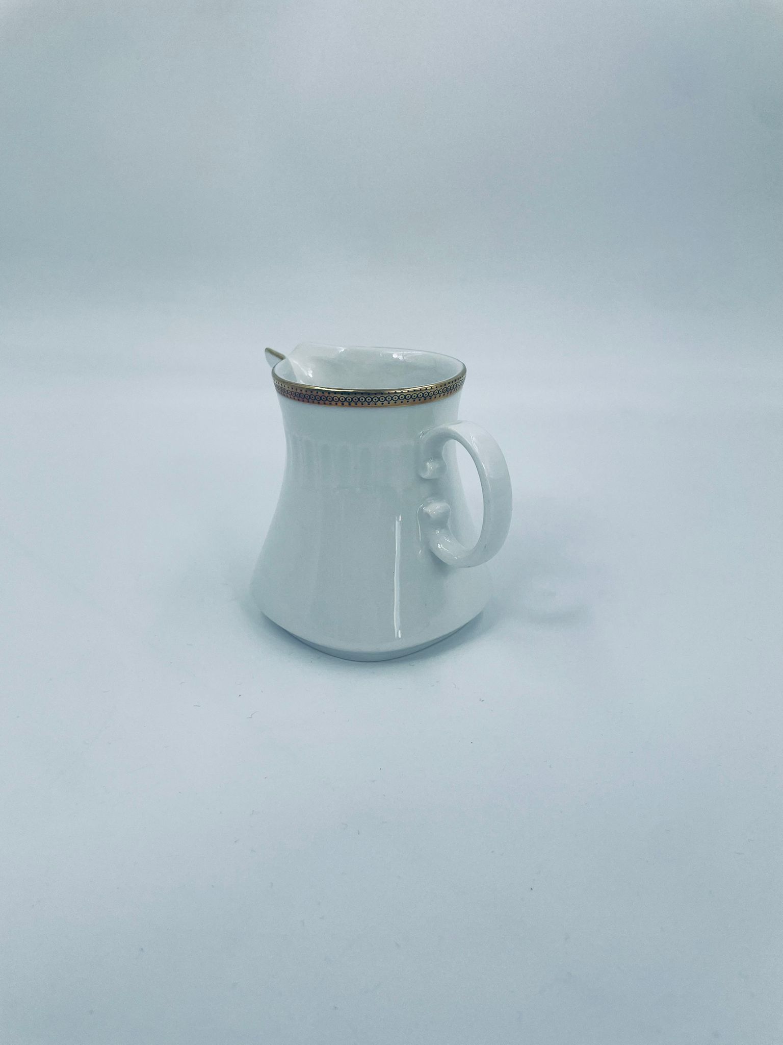 Dzbanek na mleko wytwórni Eschenbach Bavaria, wykonany z wysokiej jakości białej porcelany. Charakteryzuje się klasycznym stylem z delikatnym zdobieniem, złotym obrzeżem oraz subtelnymi ryflowaniami.