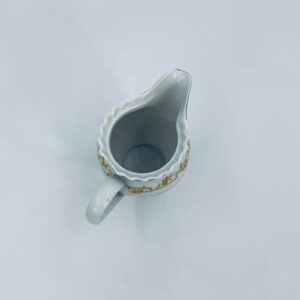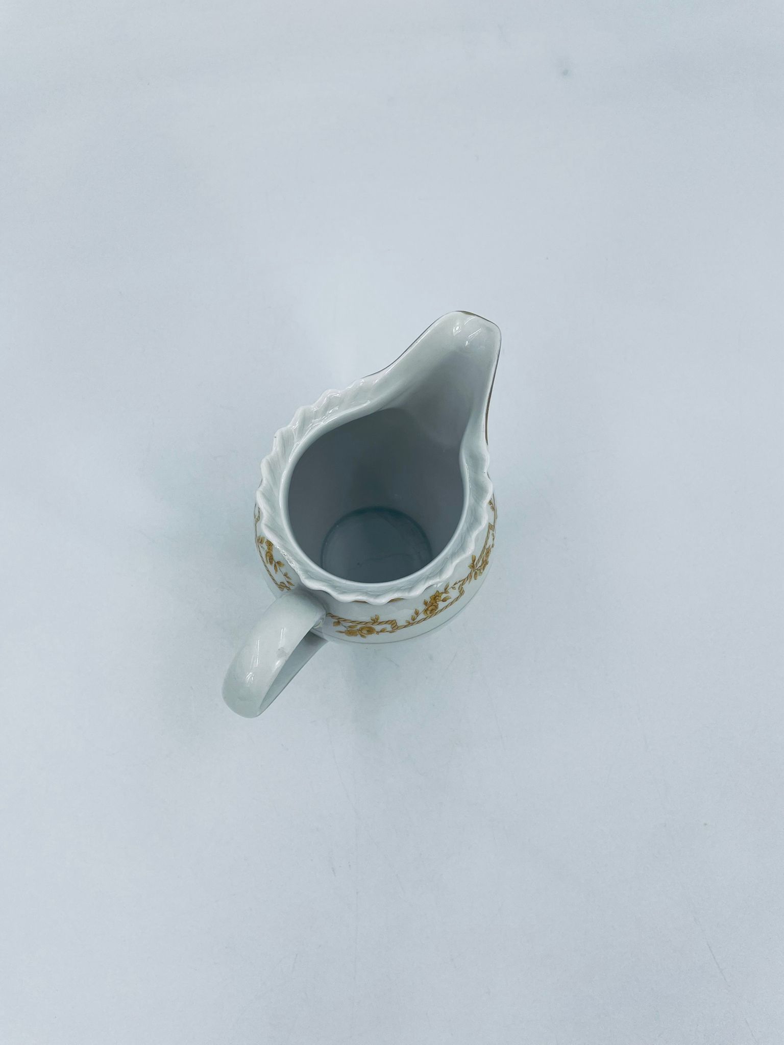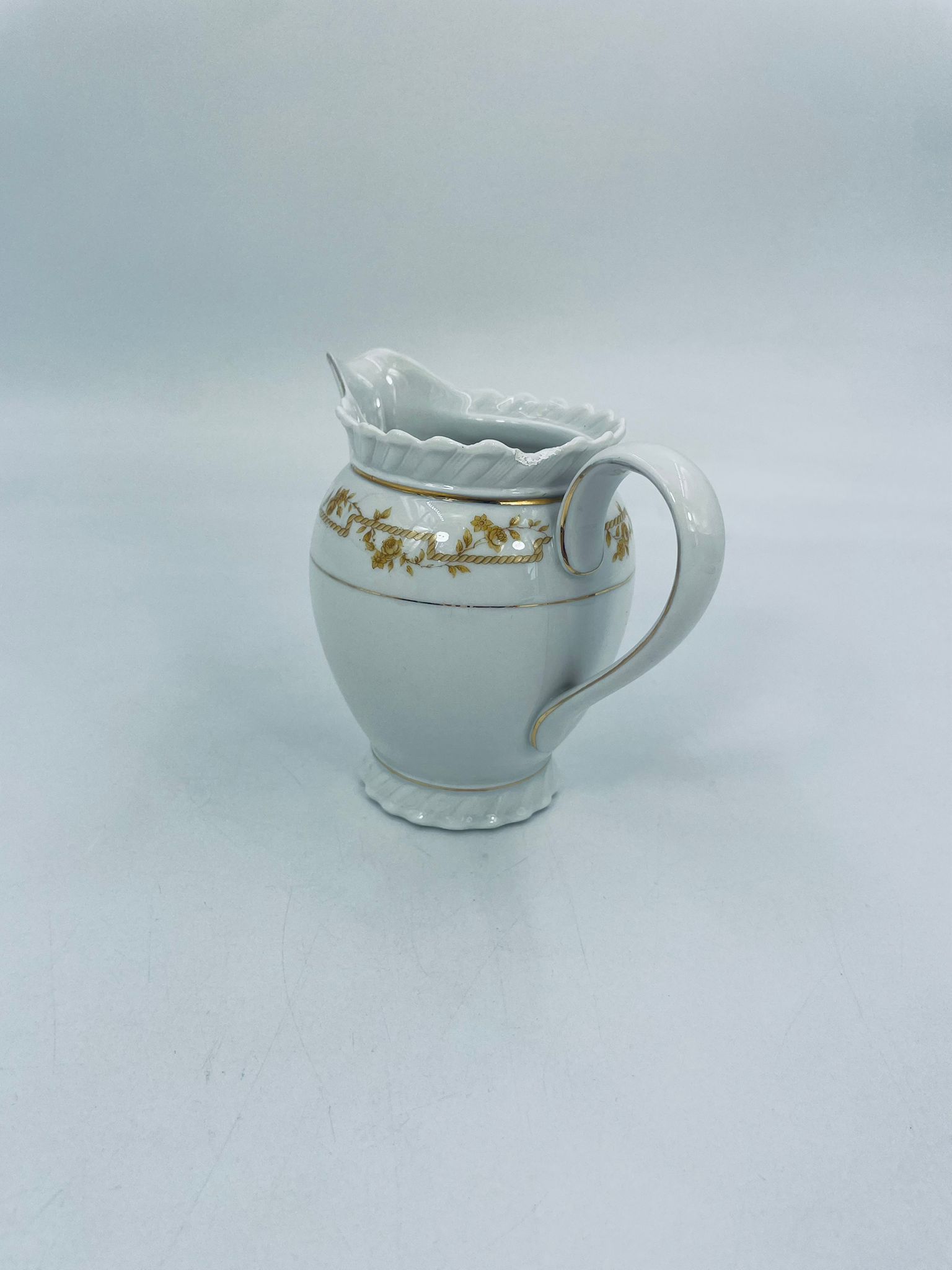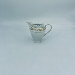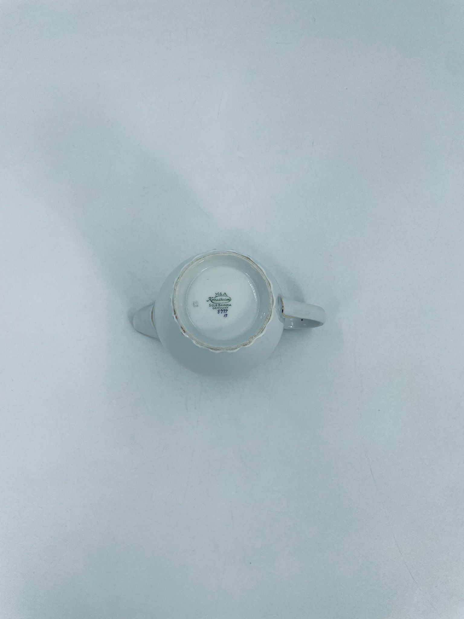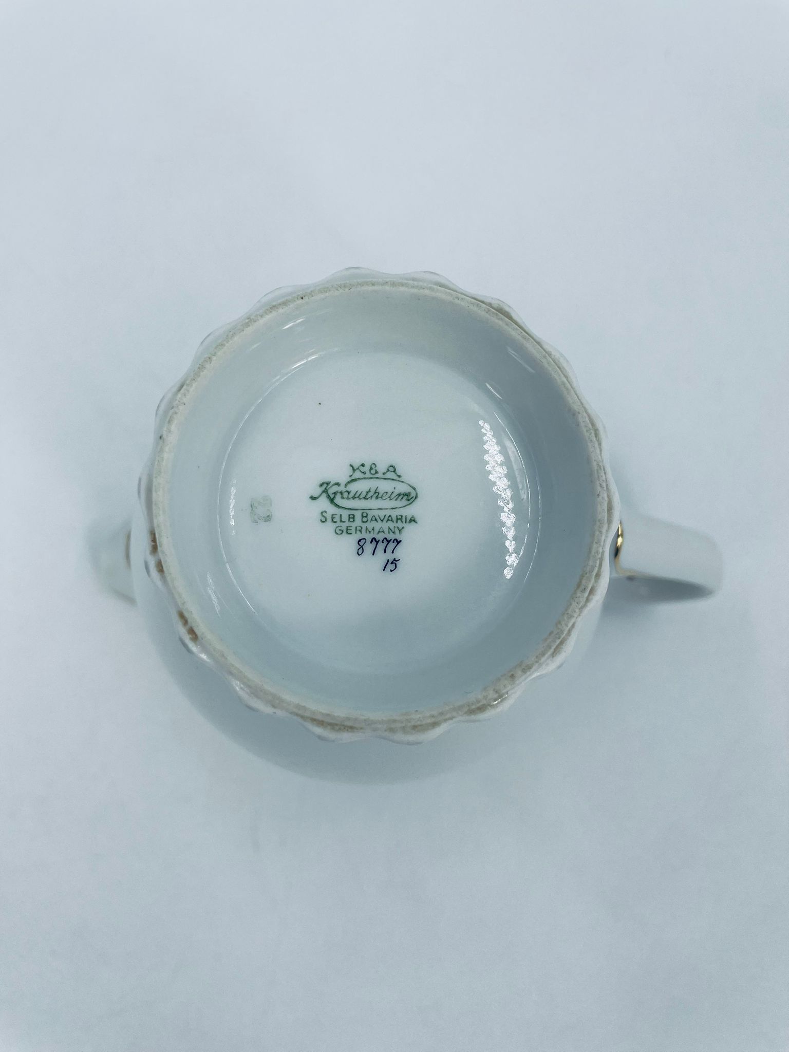 Dzbanek na mleko wytwórni Krautheim Selb Bavaria, wyprodukowany z wysokiej jakości białej porcelany, zdobiony motywem girlandy z lin i kwiatów, wykończony złoceniami. Posiada przetarcia na podstawie oraz uszczerbek na górnym rancie.