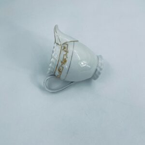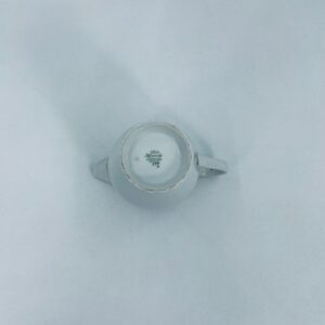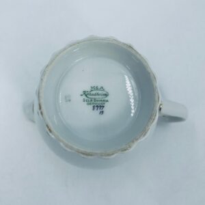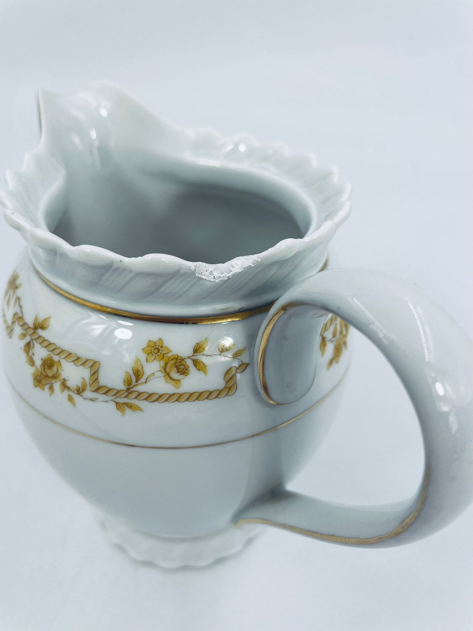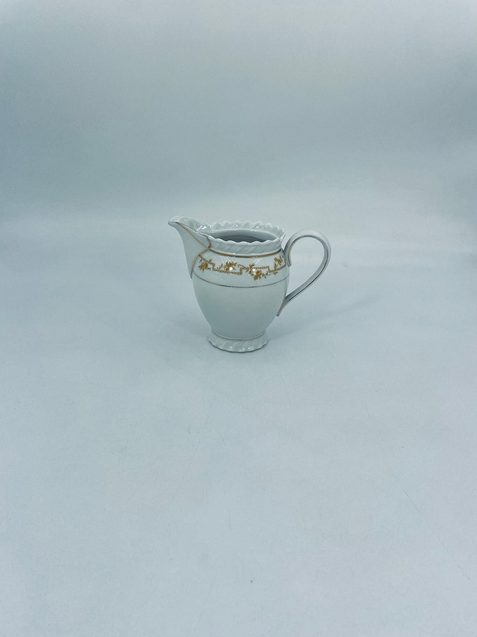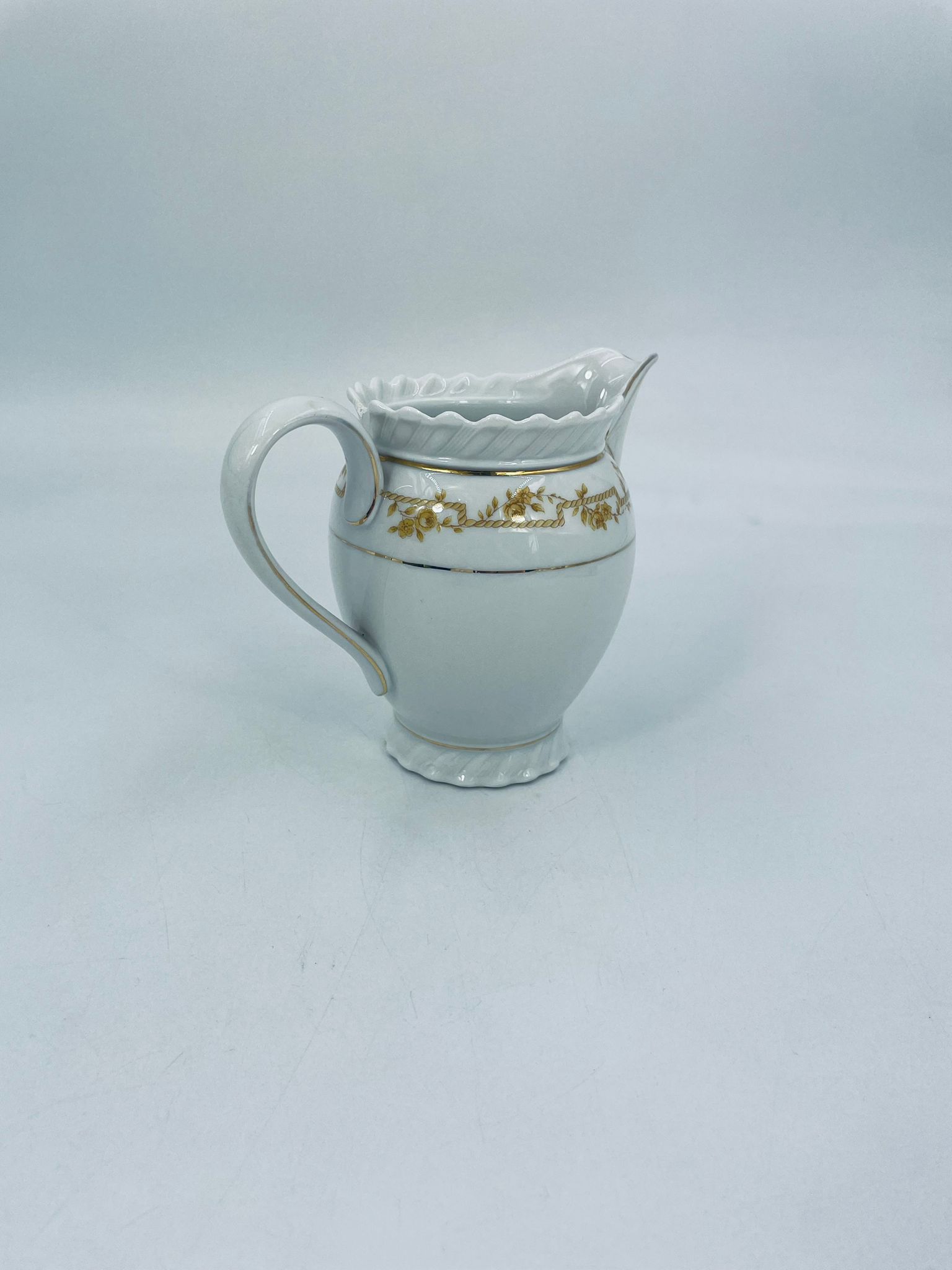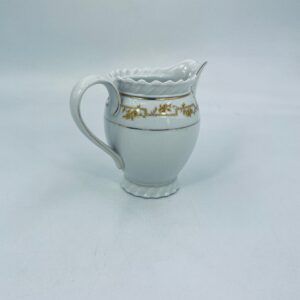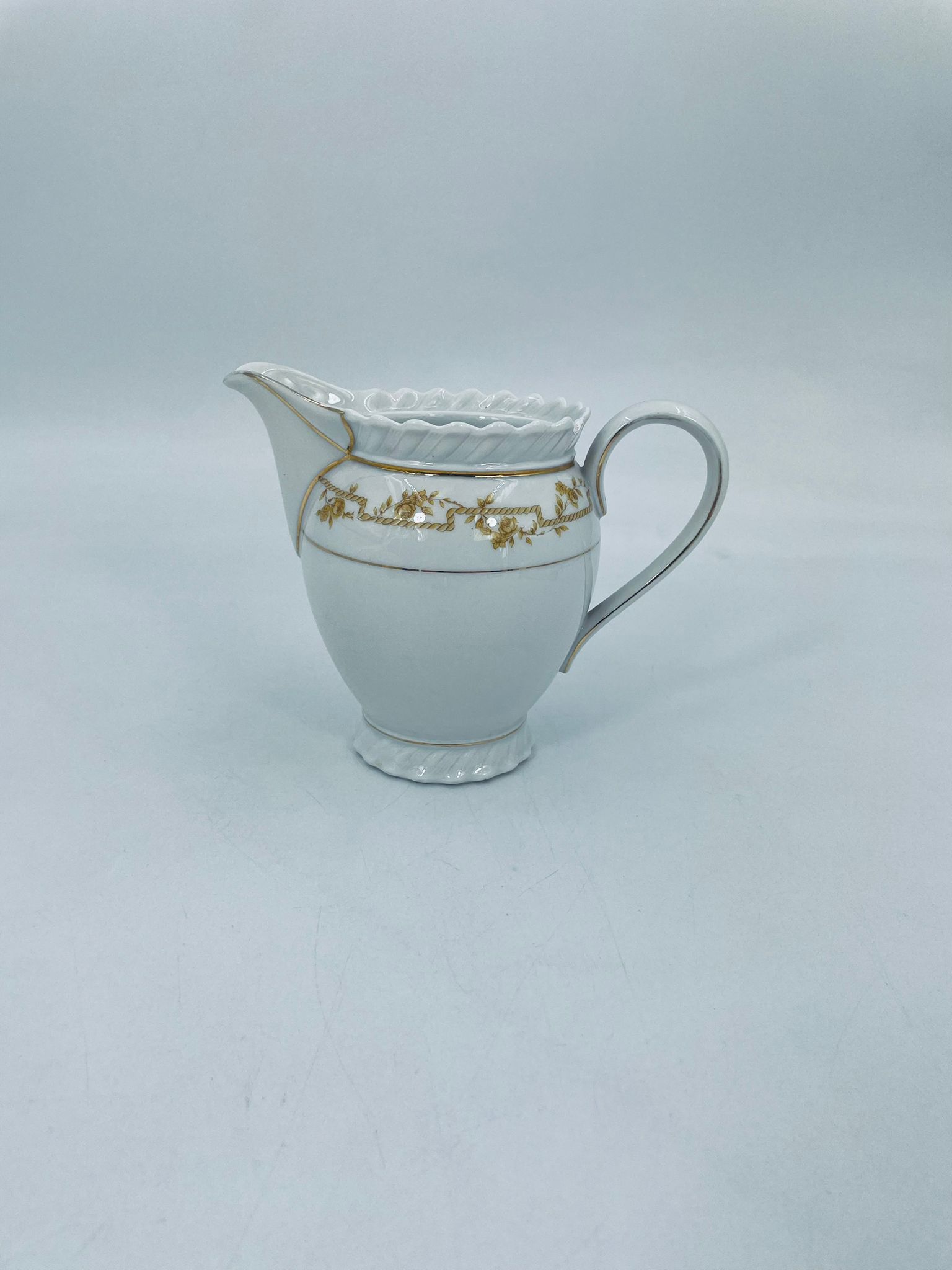Dzbanek na mleko wytwórni Krautheim Selb Bavaria, wyprodukowany z wysokiej jakości białej porcelany, zdobiony motywem girlandy z lin i kwiatów, wykończony złoceniami. Posiada przetarcia na podstawie oraz uszczerbek na górnym rancie.