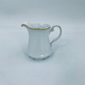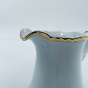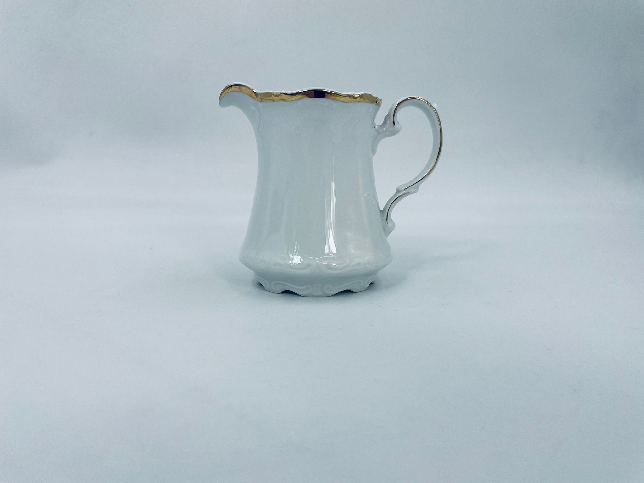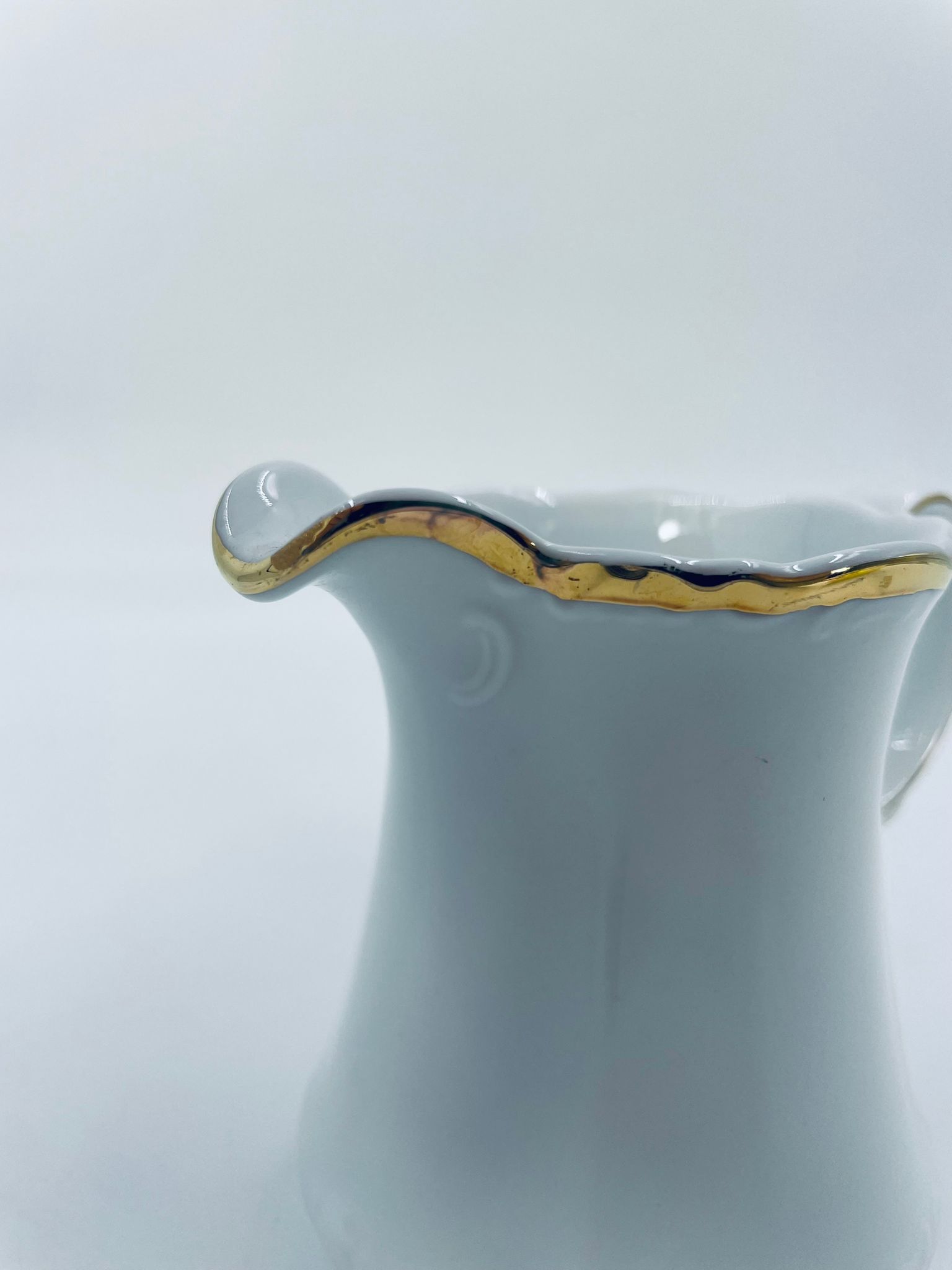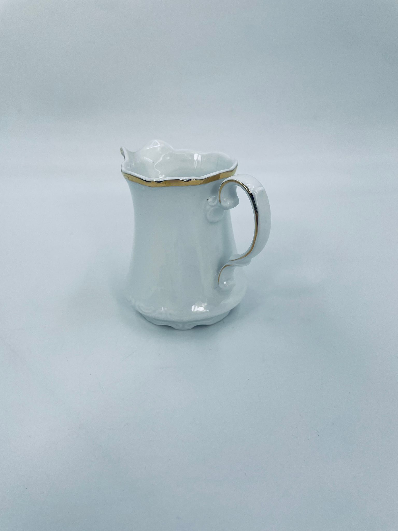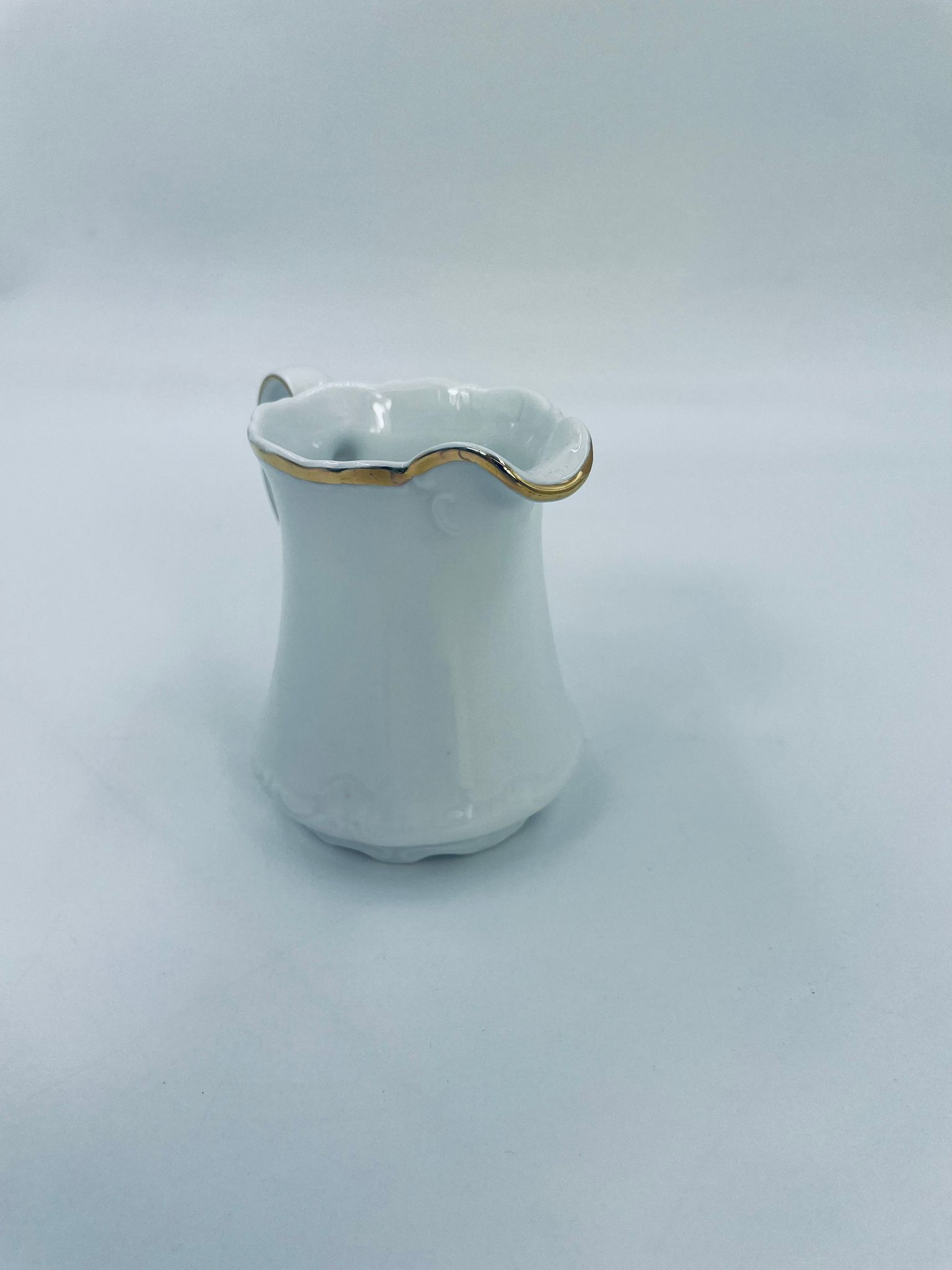 Dzbanuszek na mleko wytwórni Mitterteich, wykonany z wysokiej jakości białej porcelany. Mlecznik klasyczny, zdobiony reliefami, z ozdobnym uchwytem oraz falowaną podstawą i górną krawędzią, wykończony złoceniem na rantach. Posiada małe przetarcie na złoceniu.