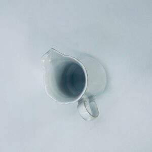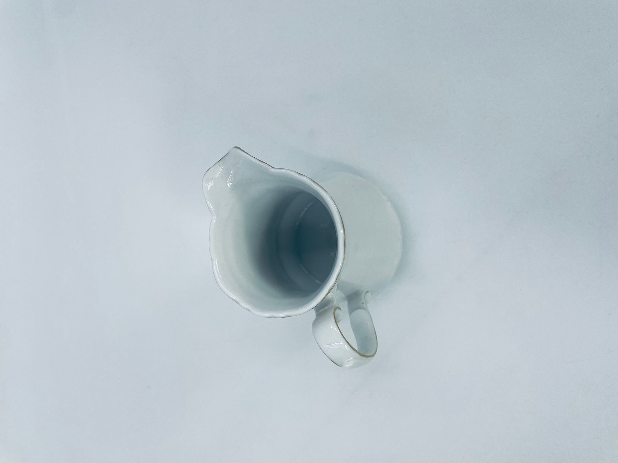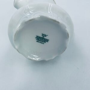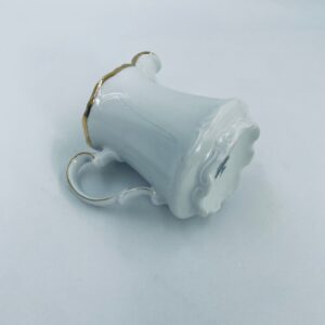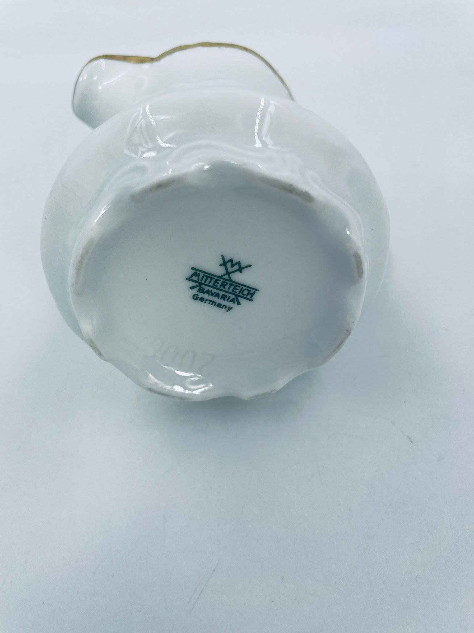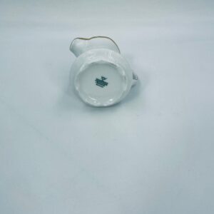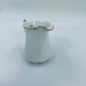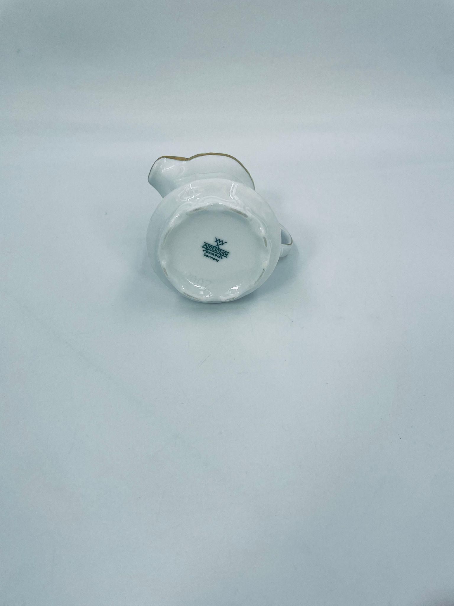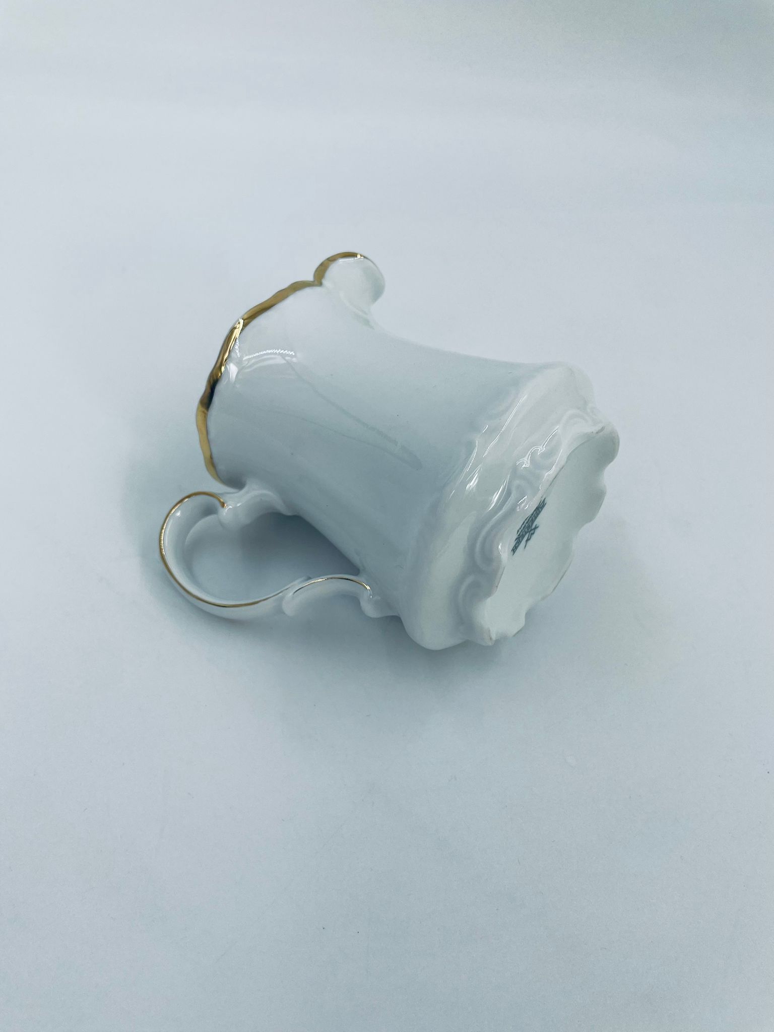 Dzbanuszek na mleko wytwórni Mitterteich, wykonany z wysokiej jakości białej porcelany. Mlecznik klasyczny, zdobiony reliefami, z ozdobnym uchwytem oraz falowaną podstawą i górną krawędzią, wykończony złoceniem na rantach. Posiada małe przetarcie na złoceniu.