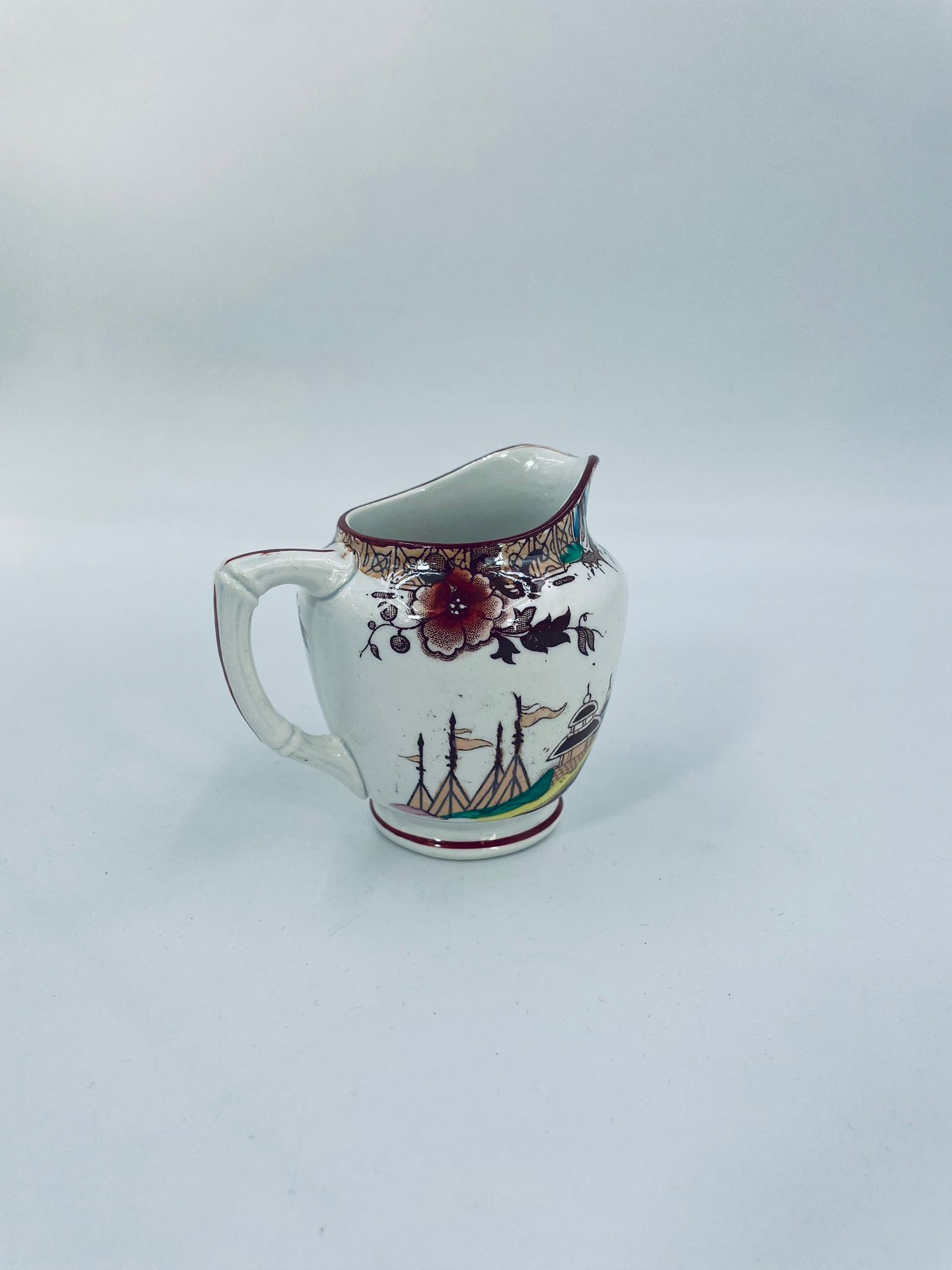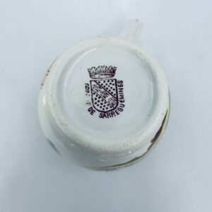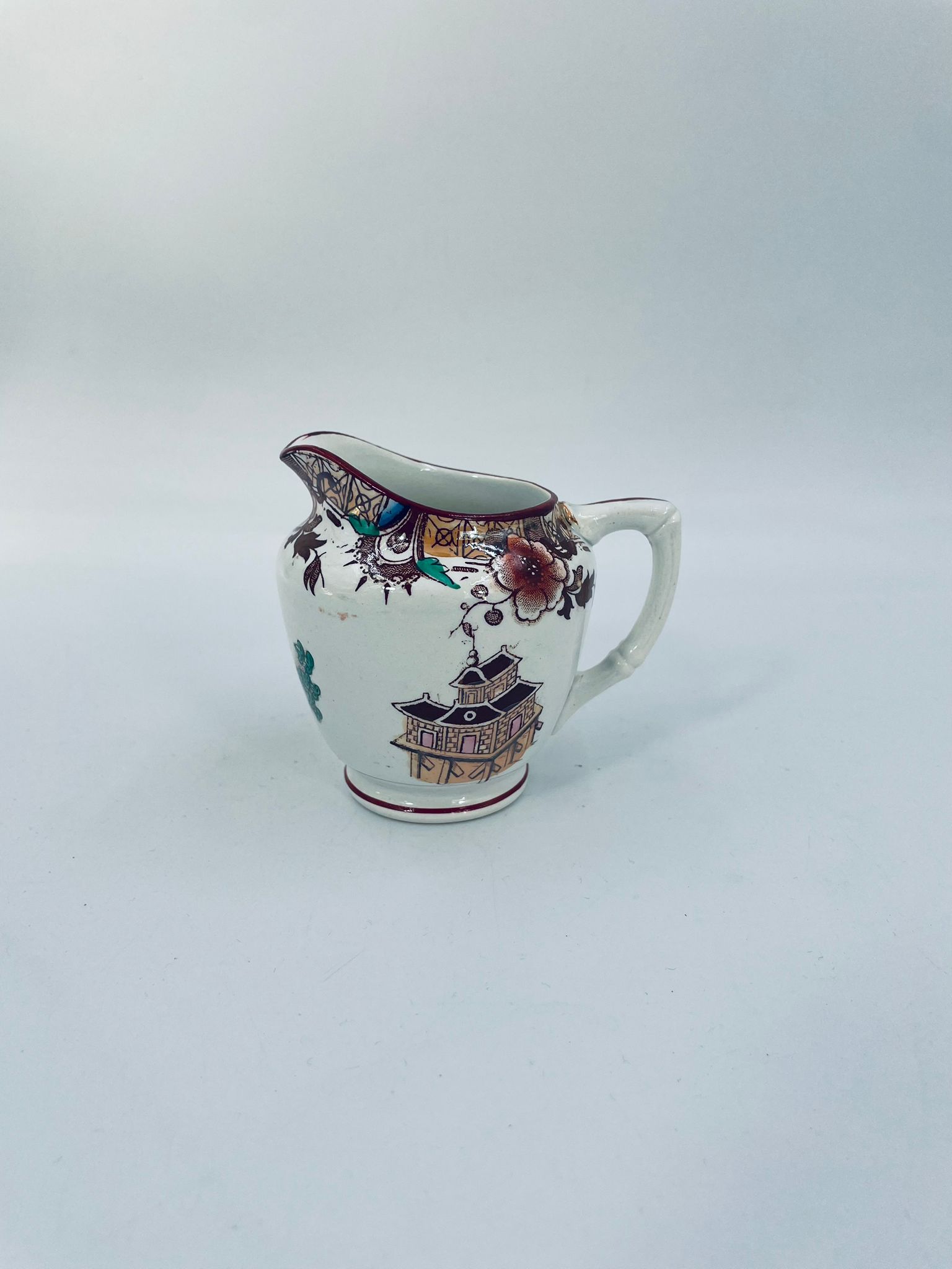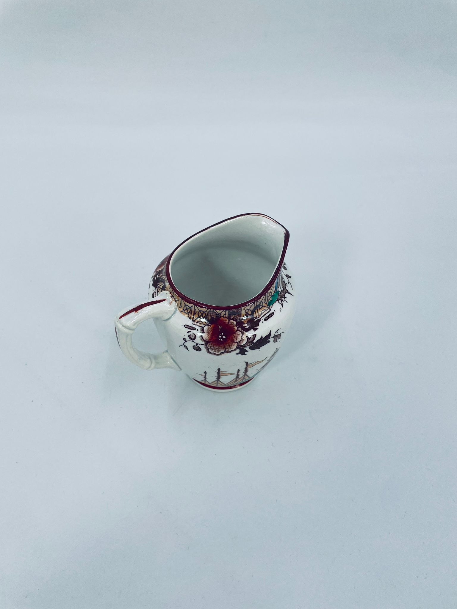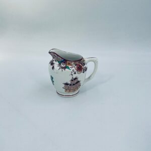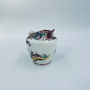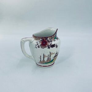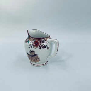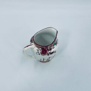 Dzbanuszek na mleko antyczny, francuskiej wytwórni Opaque de Sarreguemines która została założona w 1790r, wykonana z fajansu. Mlecznik charakteryzuje się recznie malowanym, bogatym, wielokolorowym wzorem, który obejmuje zarówno motywy orientalne , jak i kwiatowe, wykończony kolorem bordowym na krawędzi.