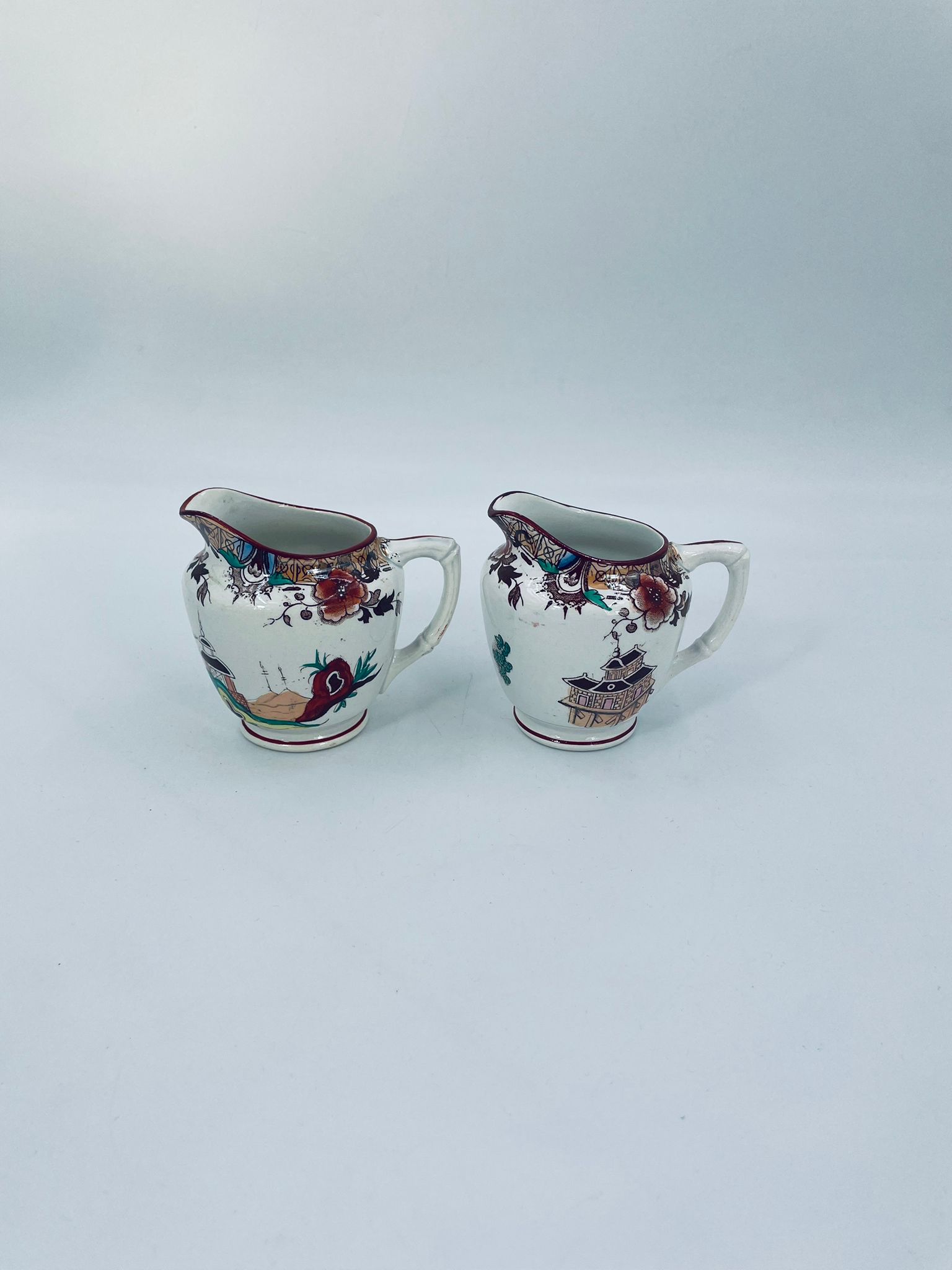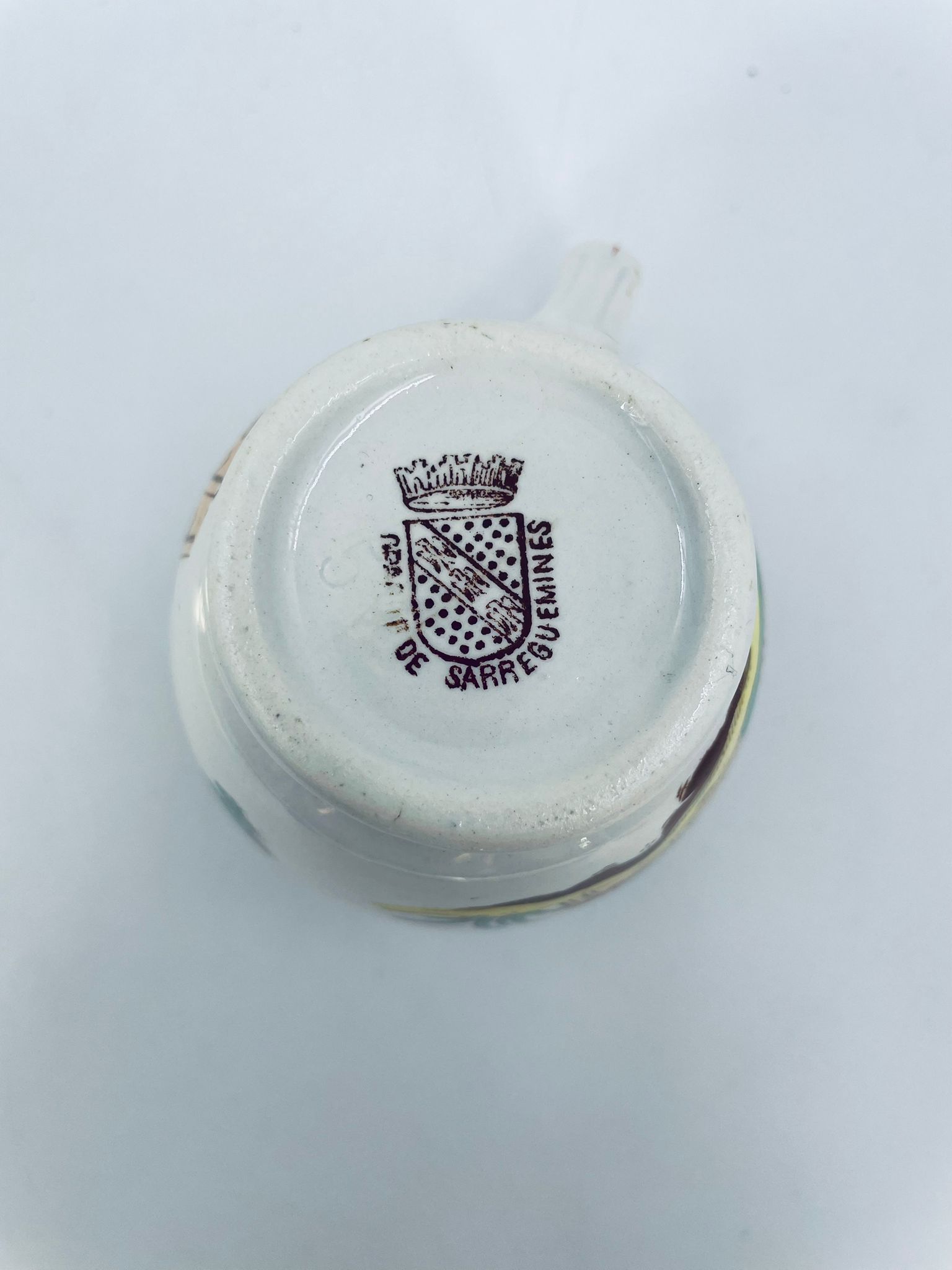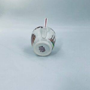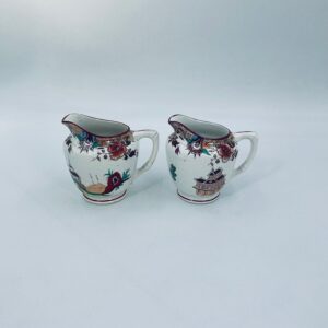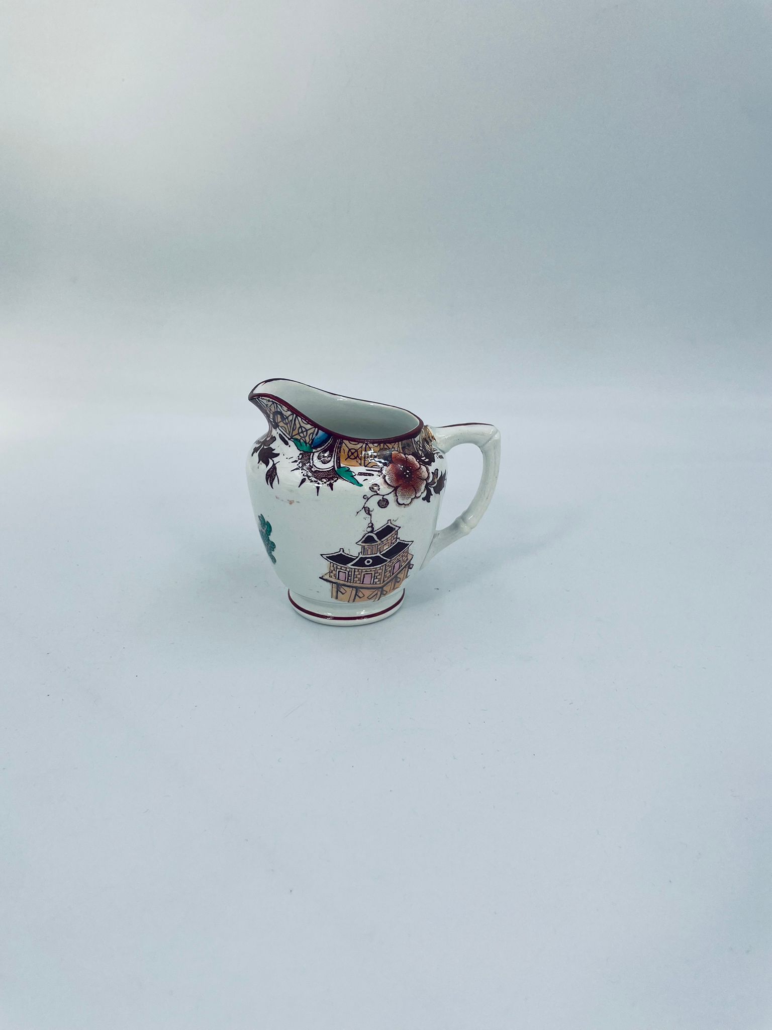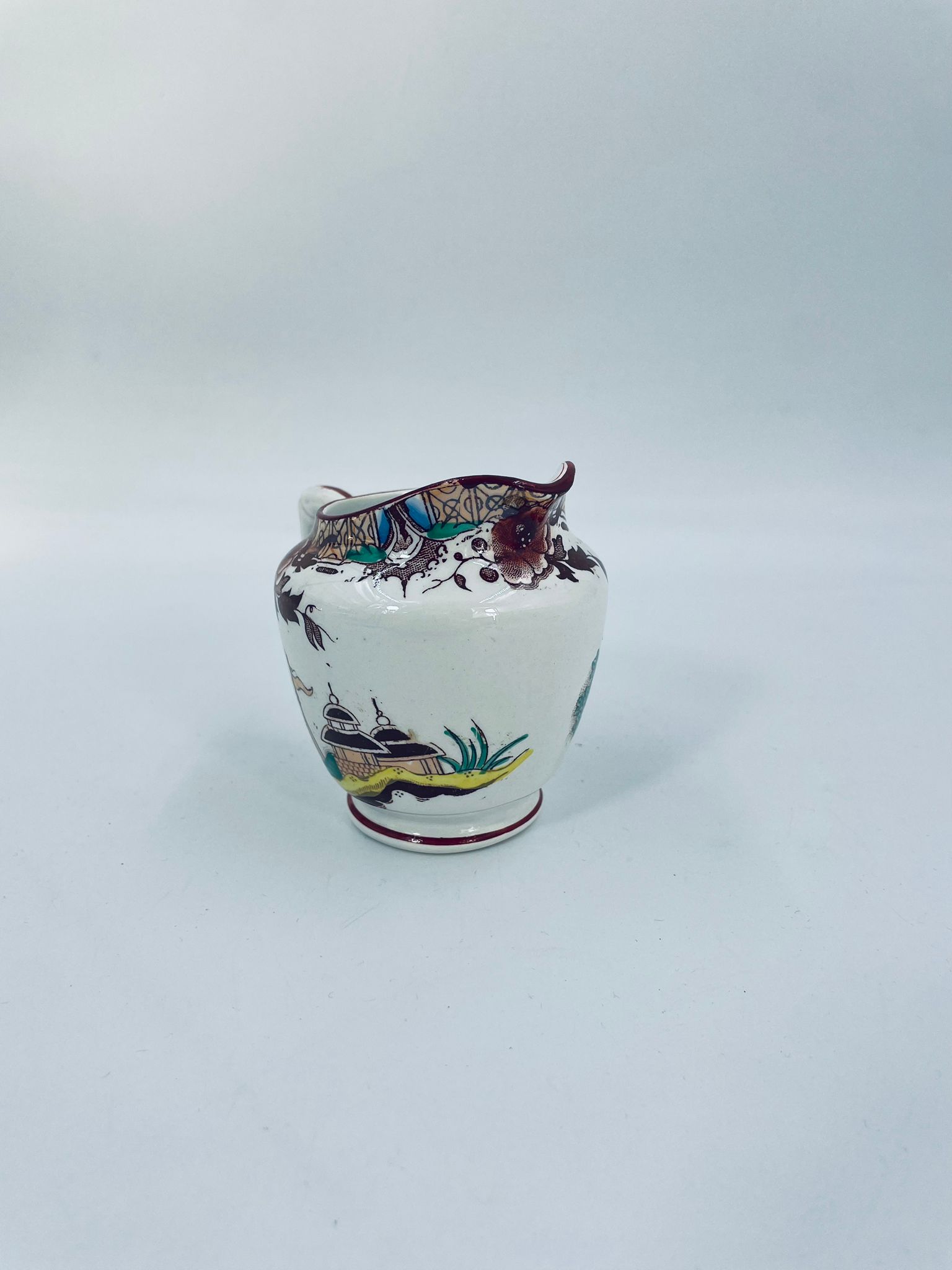 Dzbanuszek na mleko antyczny, francuskiej wytwórni Opaque de Sarreguemines która została założona w 1790r, wykonana z fajansu. Mlecznik charakteryzuje się recznie malowanym, bogatym, wielokolorowym wzorem, który obejmuje zarówno motywy orientalne , jak i kwiatowe, wykończony kolorem bordowym na krawędzi.
