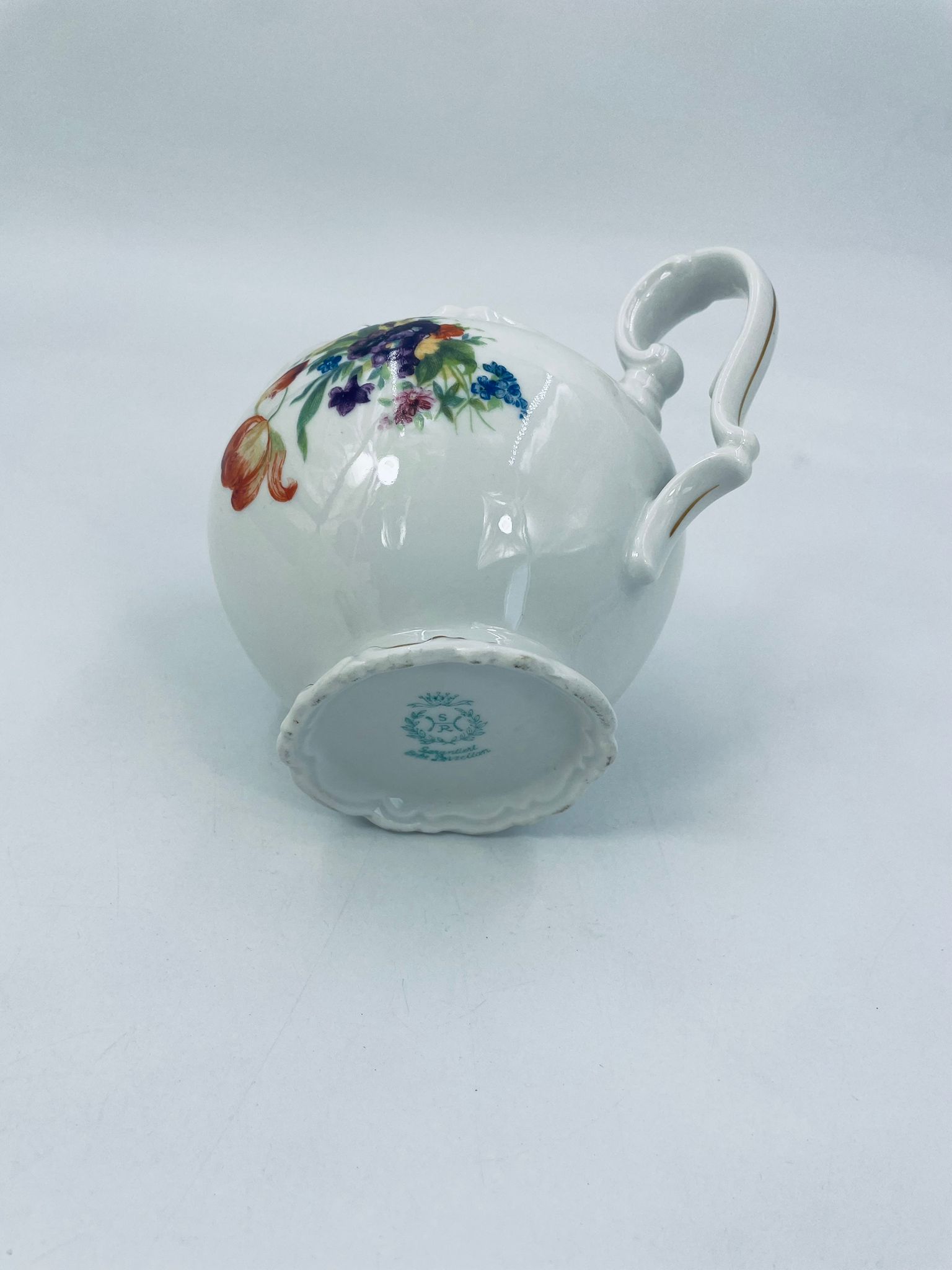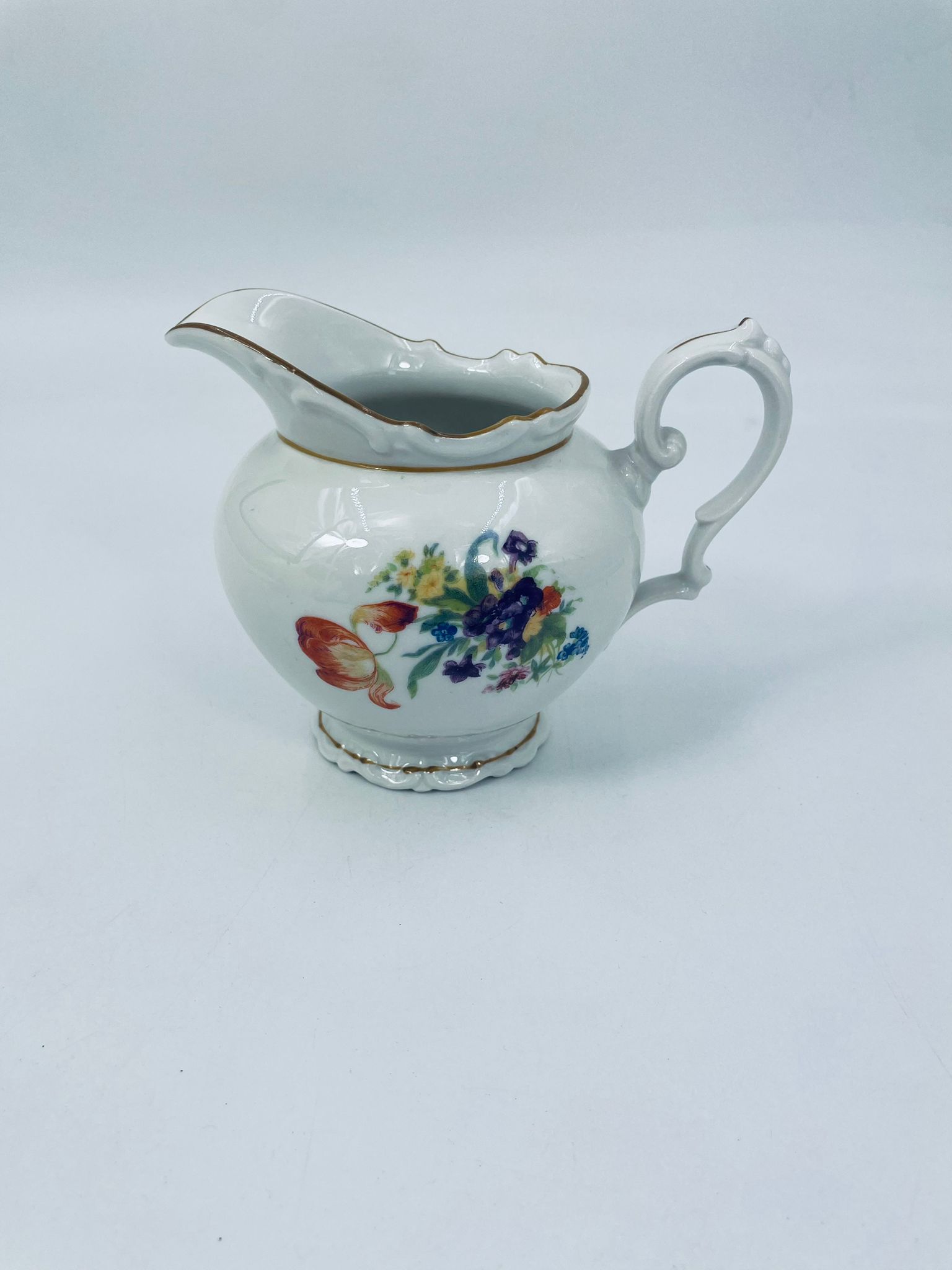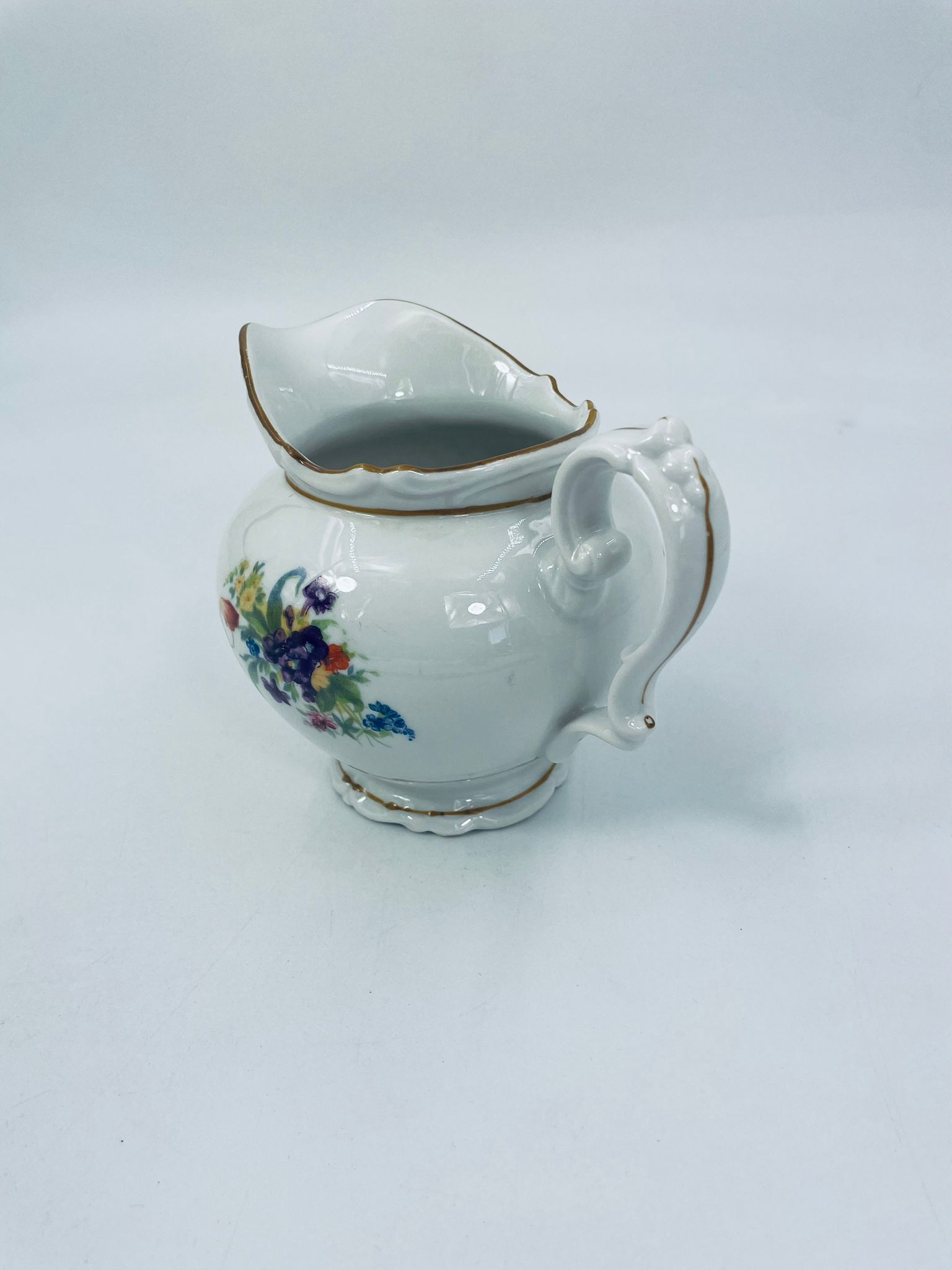Dzbanek na mleko kolekcjonerski SR Echt Porzellan, porcelana w białym kolorze charakteryzuje sie delikatnymi zdobieniami kwiatowymi i złoconymi detalami, wykończona złoceniami na rantach.