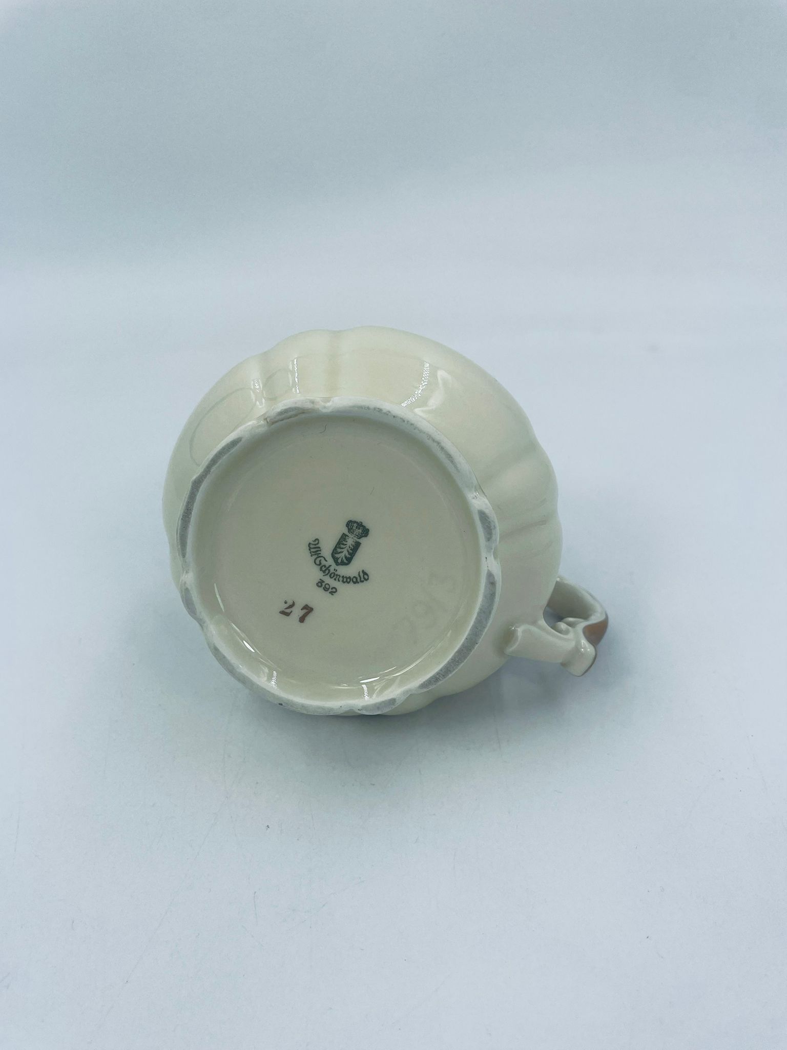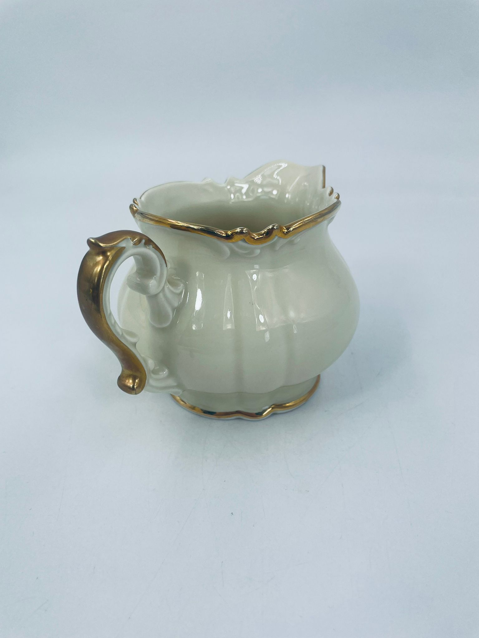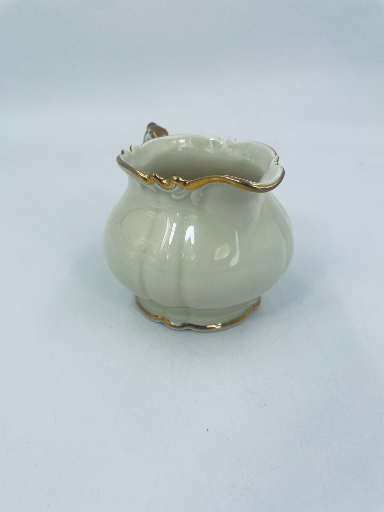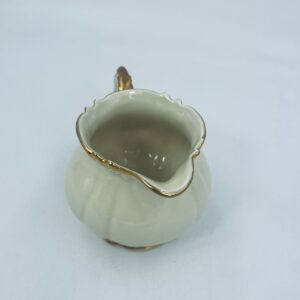 Dzbanuszek na mleko wytwórni Alt Schönwald, wykonany z wysokiej jakości porcelany w kolorze ecru. Mlecznik Posiada eleganckie zdobienia i faliste wykończenia na krawędziach, pozłacane.
