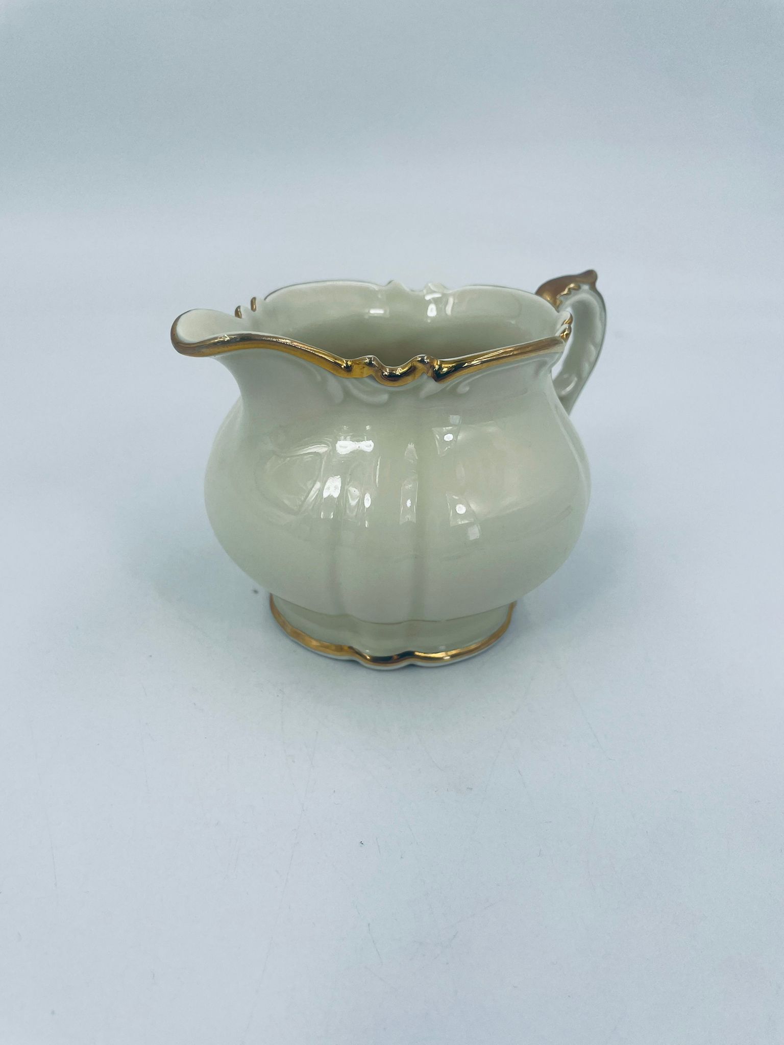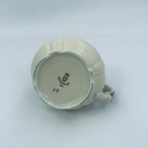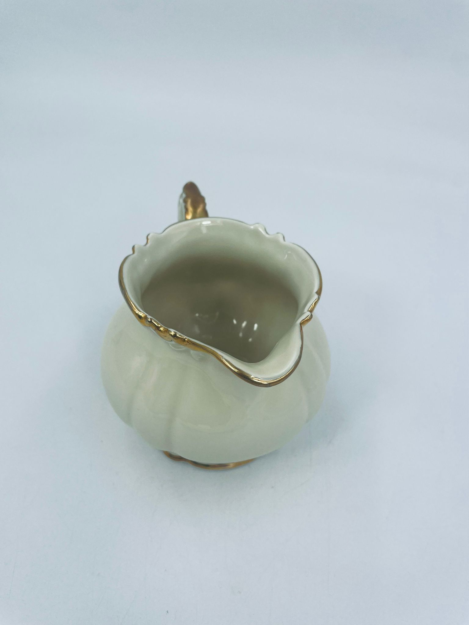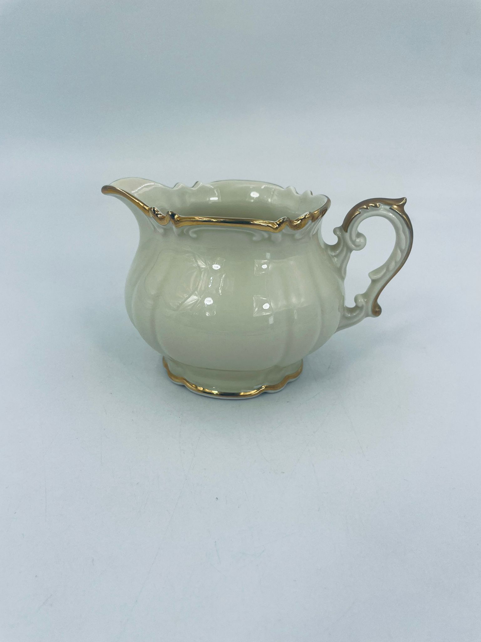 Dzbanuszek na mleko wytwórni Alt Schönwald, wykonany z wysokiej jakości porcelany w kolorze ecru. Mlecznik Posiada eleganckie zdobienia i faliste wykończenia na krawędziach, pozłacane.