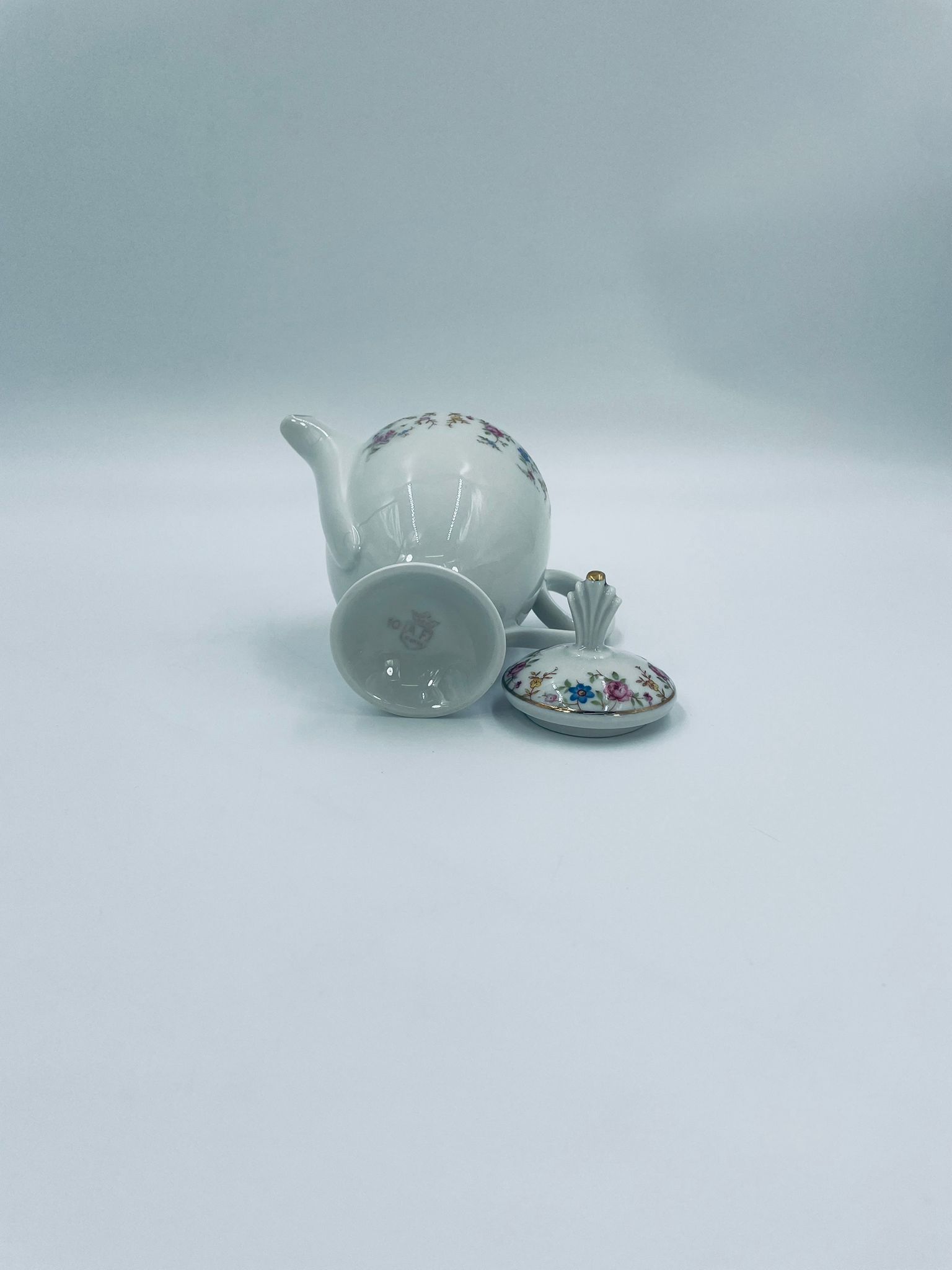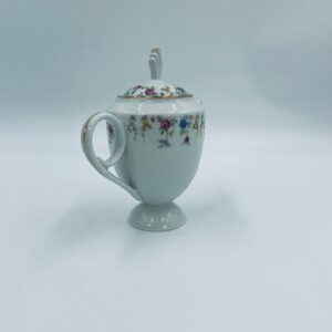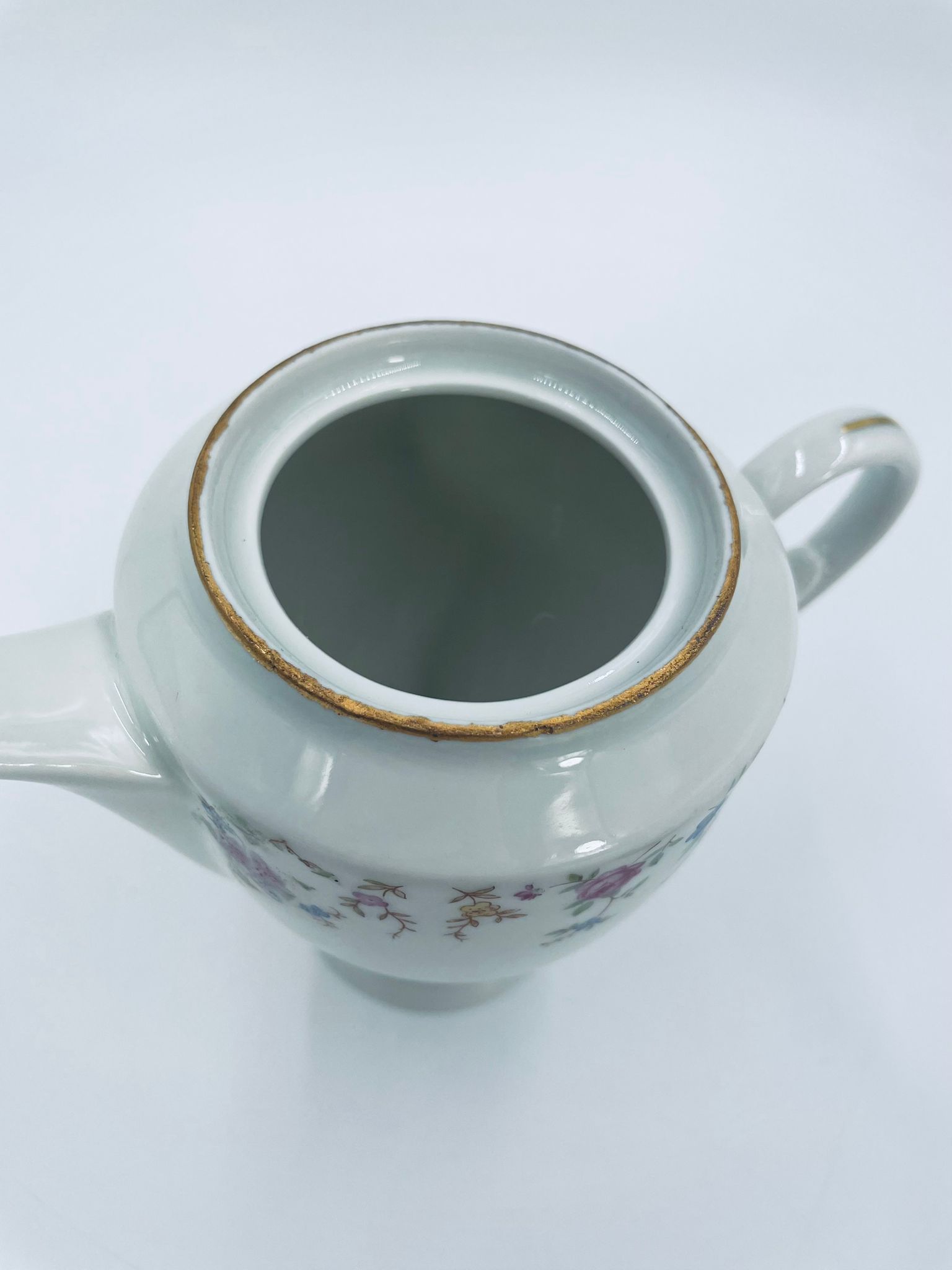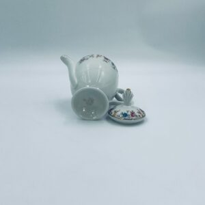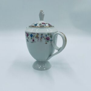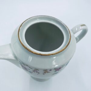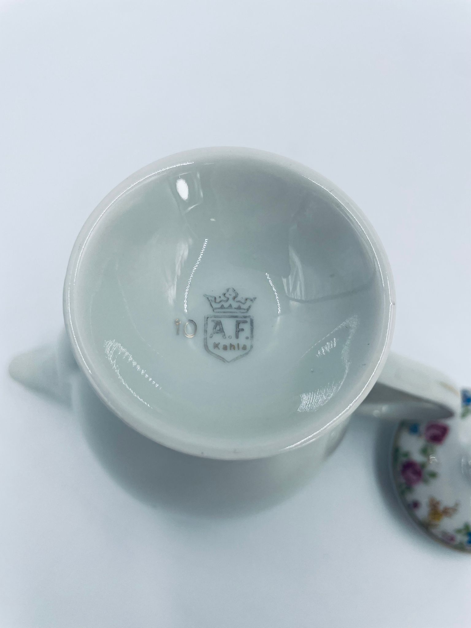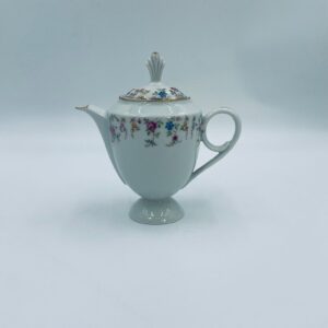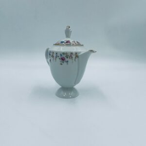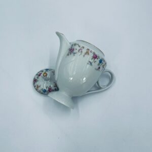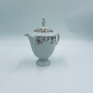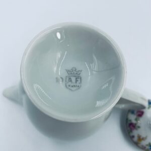 Dzbanek wytwórni A.F Kahla z lat 1931-1945 , wykonany z wysokiej jakości białej porcelany. Dzbanek charakteryzuje się się delikatnym zdobieniem kolorowych kwiatuszków, wykończony złoceniem na rantach. Posiada przetarcie złocenia.