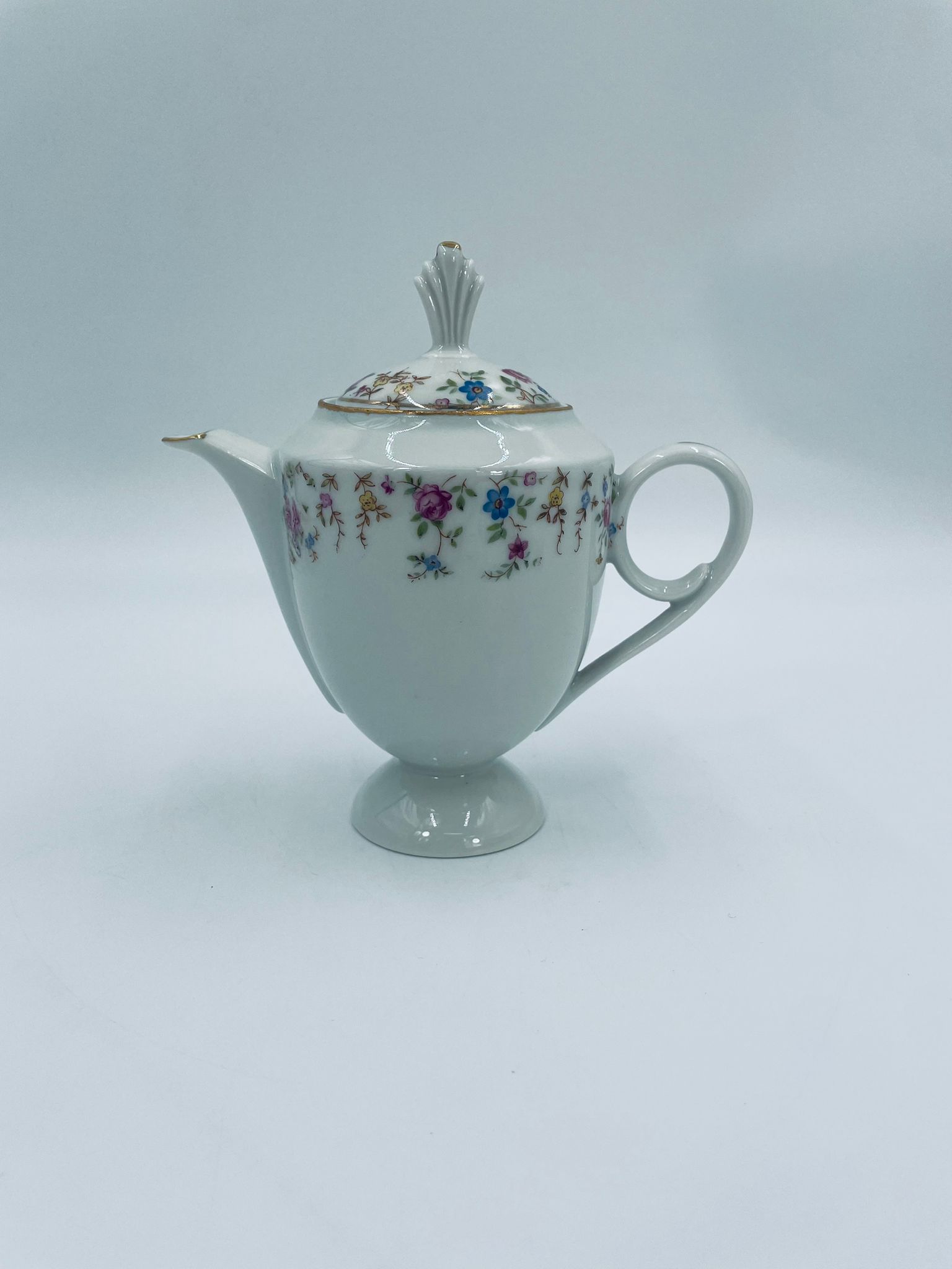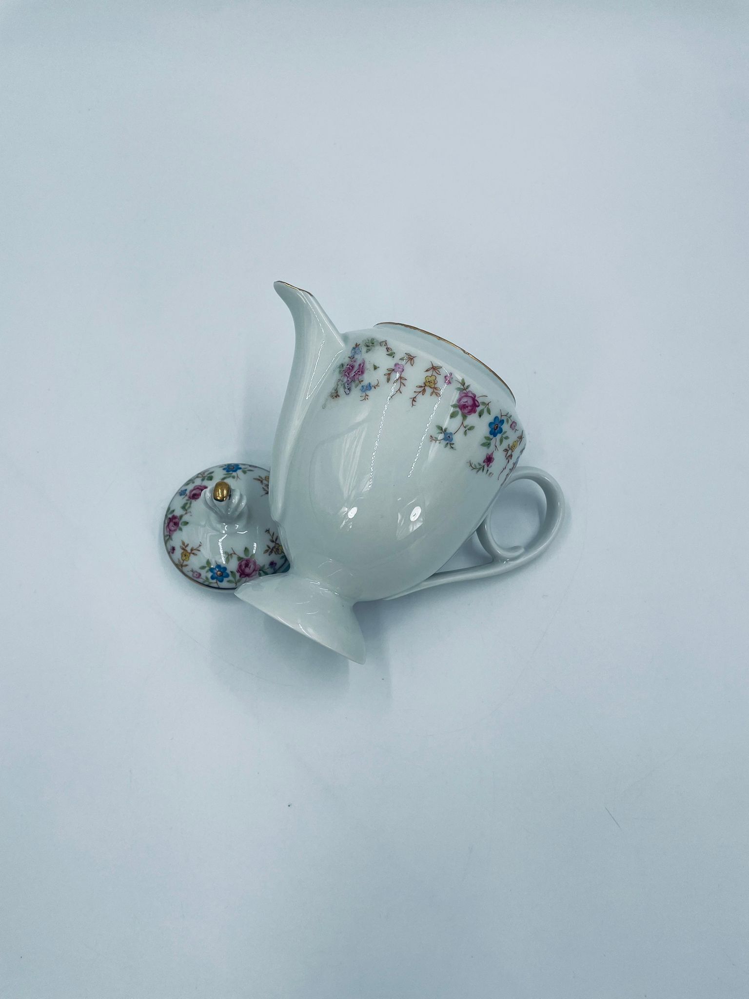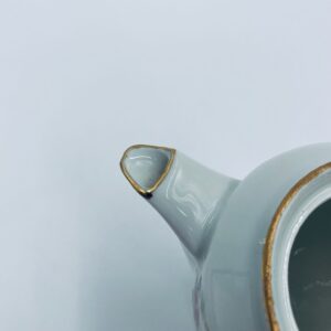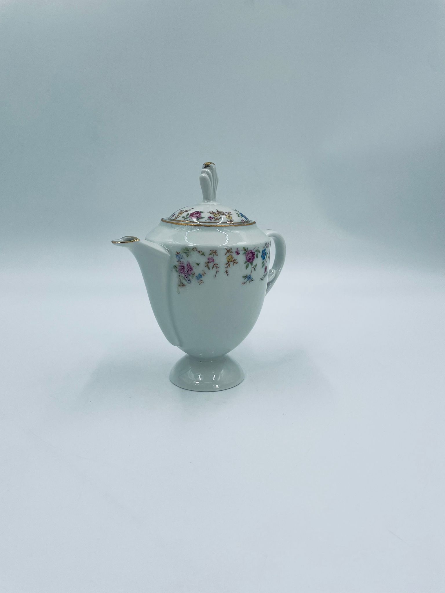 Dzbanek wytwórni A.F Kahla z lat 1931-1945 , wykonany z wysokiej jakości białej porcelany. Dzbanek charakteryzuje się się delikatnym zdobieniem kolorowych kwiatuszków, wykończony złoceniem na rantach. Posiada przetarcie złocenia.