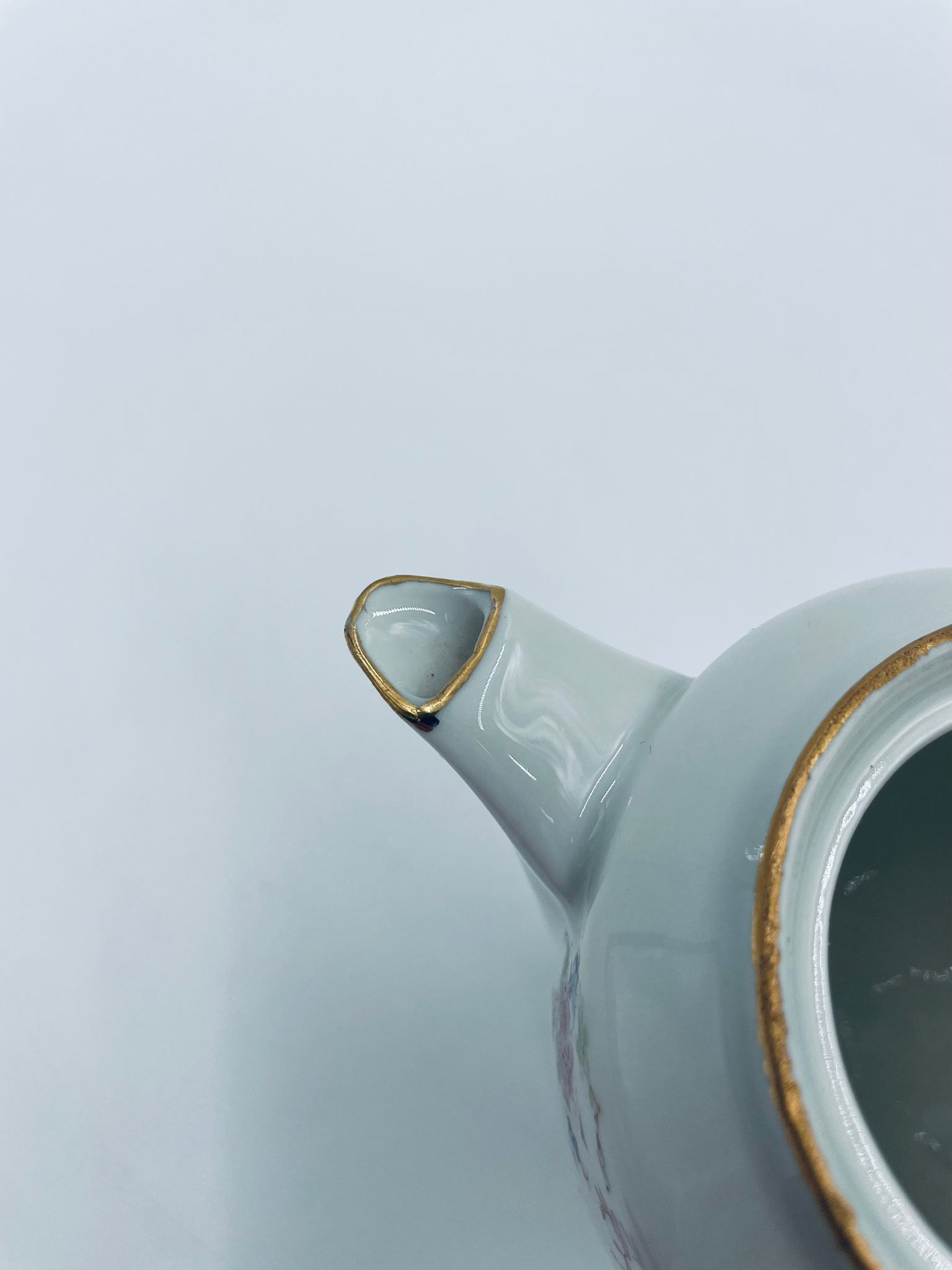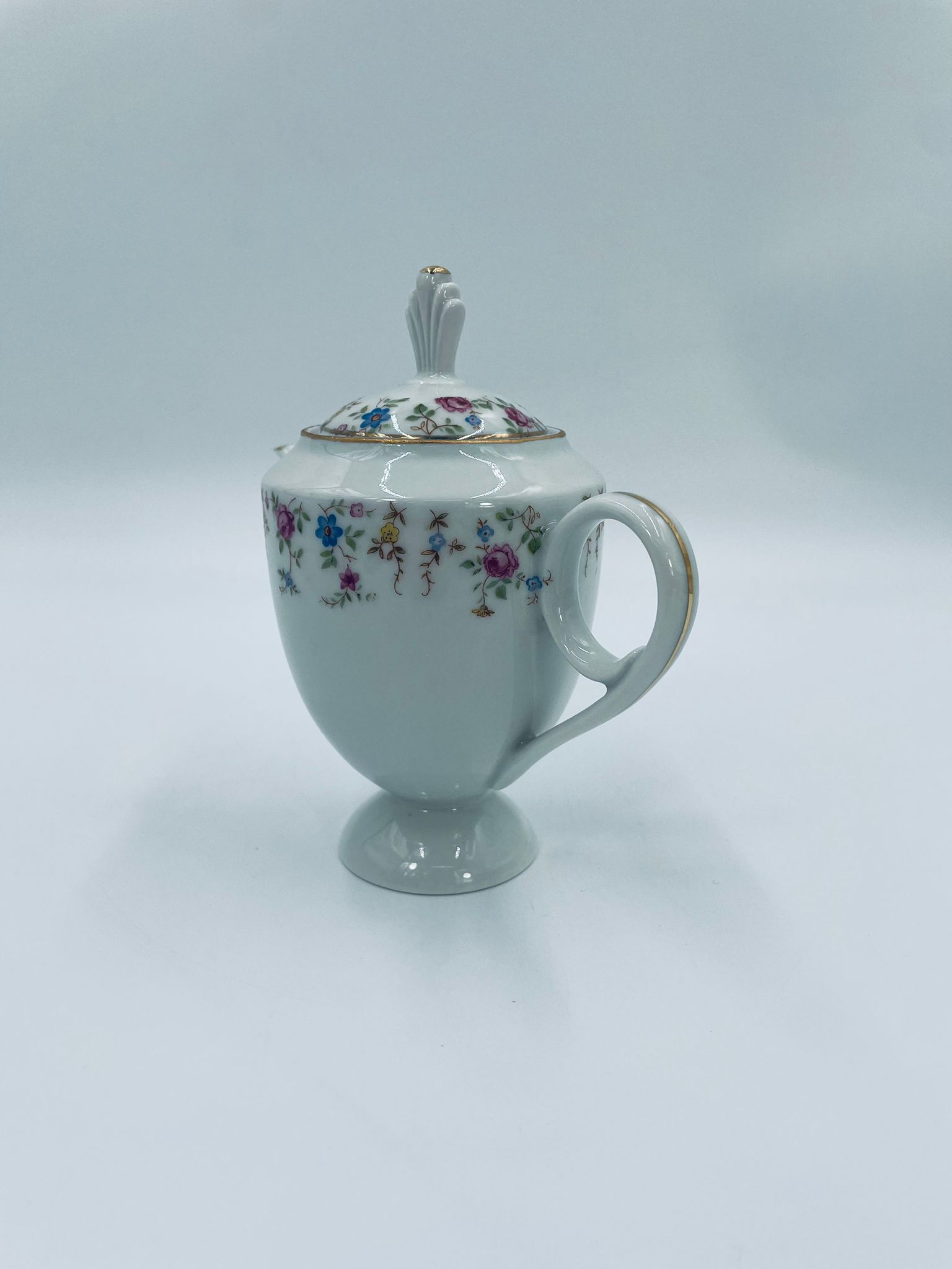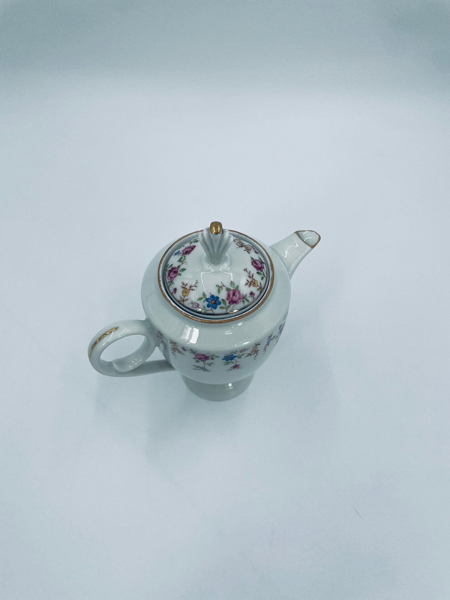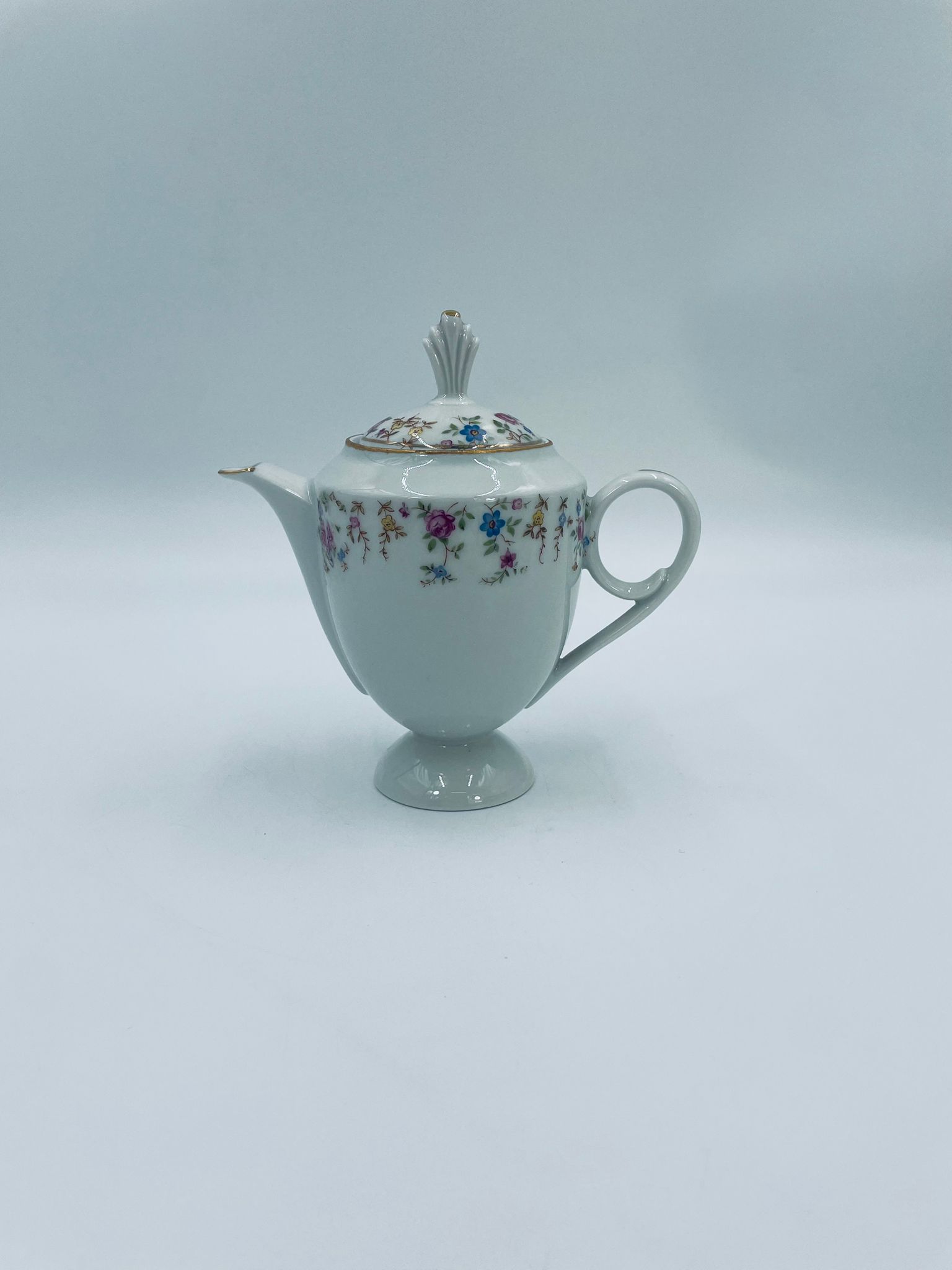 Dzbanek wytwórni A.F Kahla z lat 1931-1945 , wykonany z wysokiej jakości białej porcelany. Dzbanek charakteryzuje się się delikatnym zdobieniem kolorowych kwiatuszków, wykończony złoceniem na rantach. Posiada przetarcie złocenia.