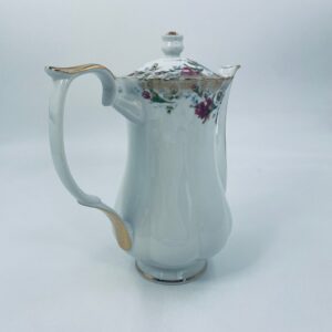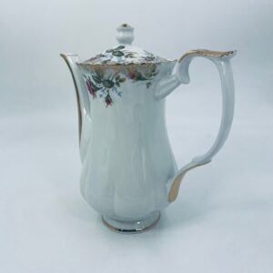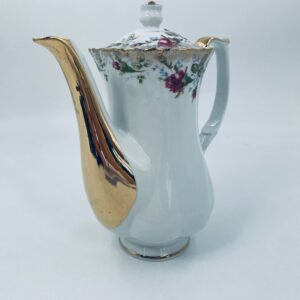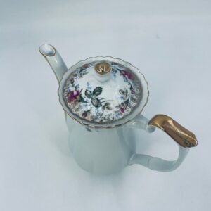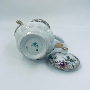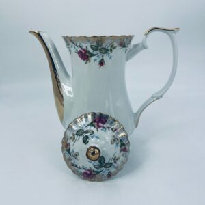 Dzbanek do herbaty Polskiej fabryki porcelany Chodzież, fasonu Iwona złota róża. Imbryk wysokiej jakości białej porcelany z wyróżniającym się stylowym zdobieniem pięknych bordowych róż z zielonymi gałązkami. Imbryczek bogato zdobiony i wykończony złoceniem.