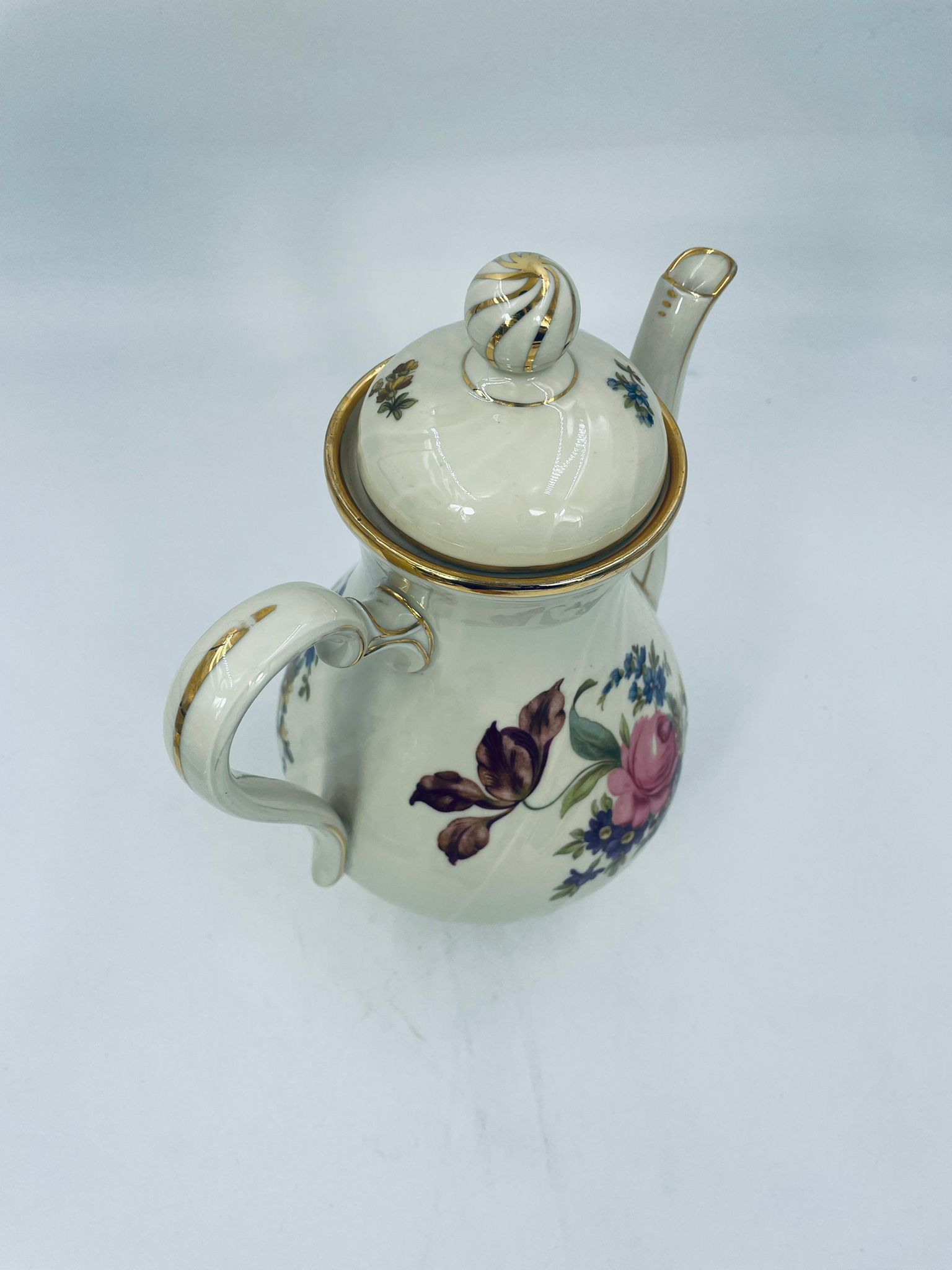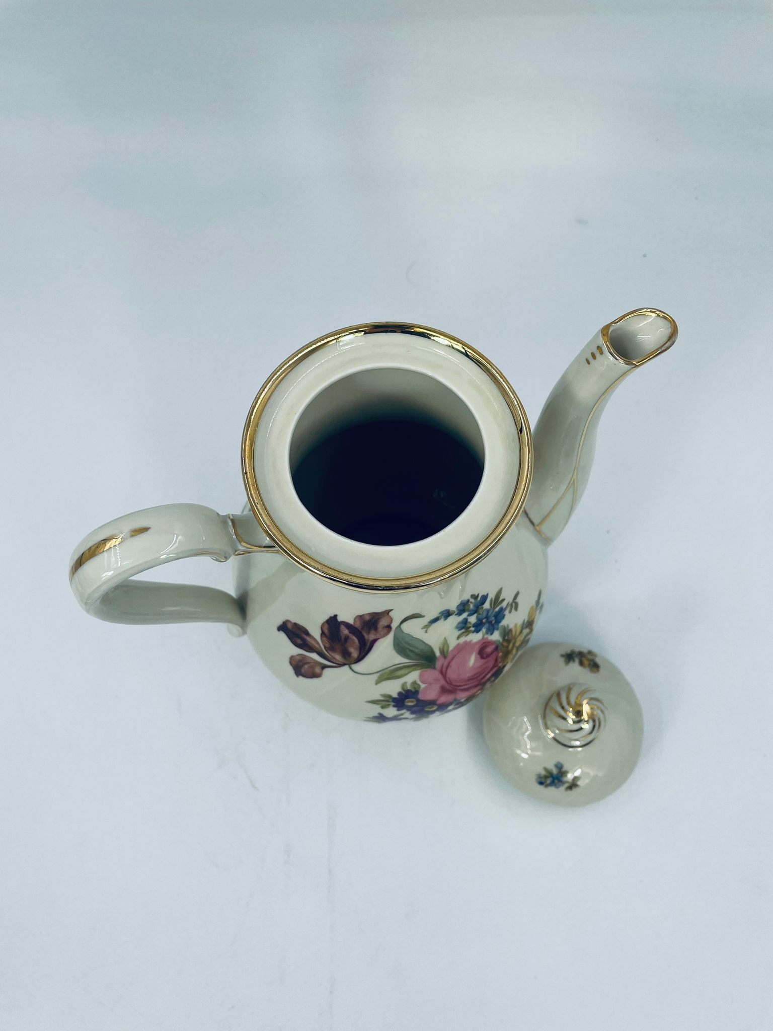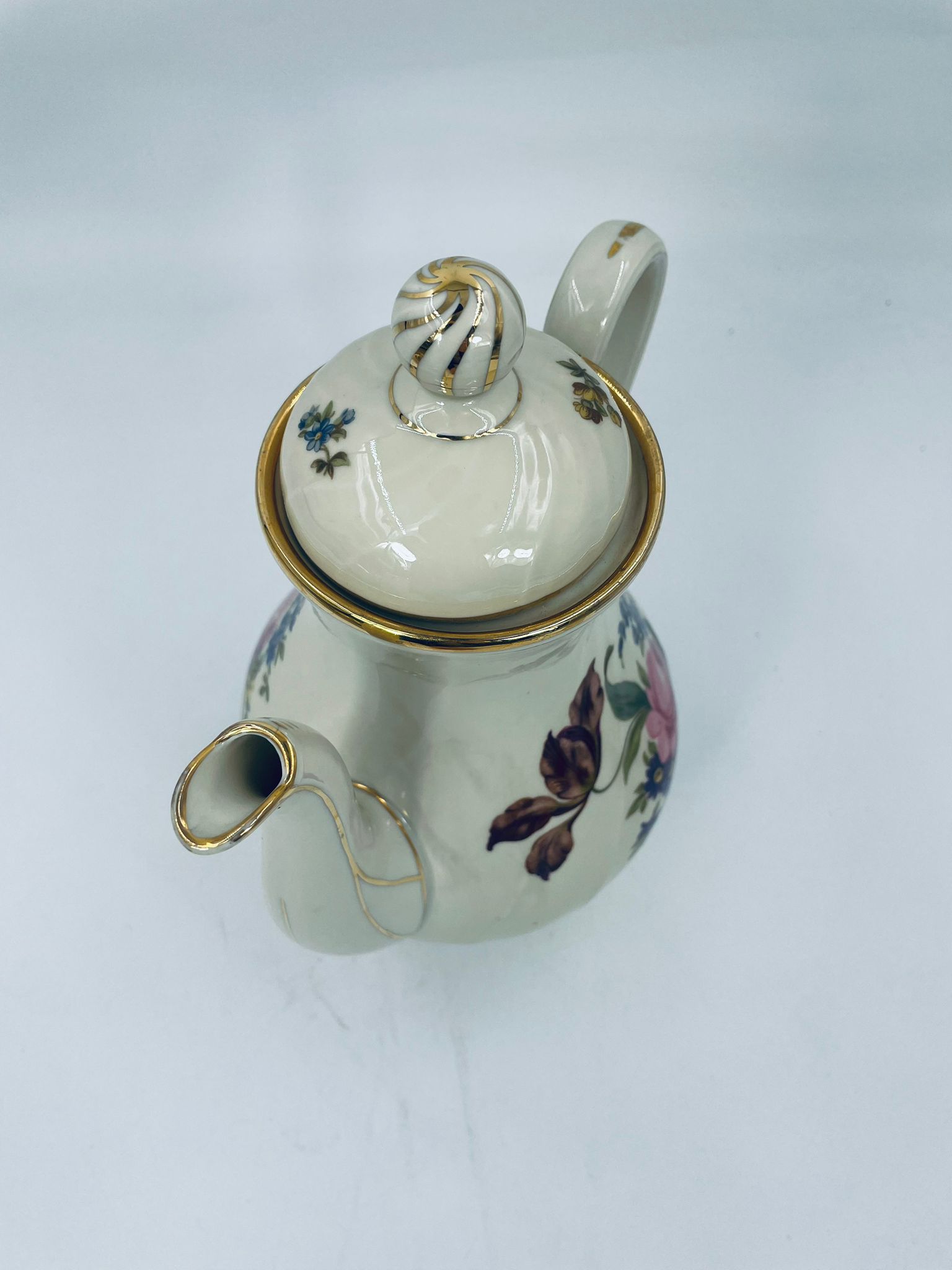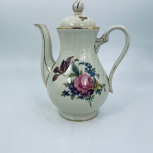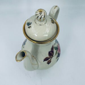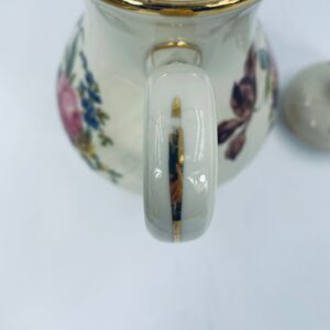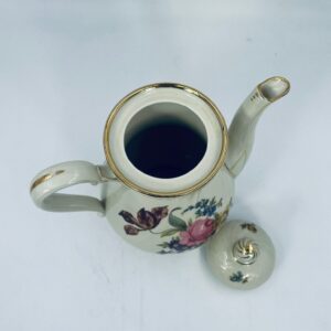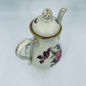 Porcelanowy dzbanek do herbaty manufaktury Kobenhavns Porcellains Malerii KPM. Piękny wzór kwiatów, kolor porcelany ecru, wykończone złoceniami na rantach.