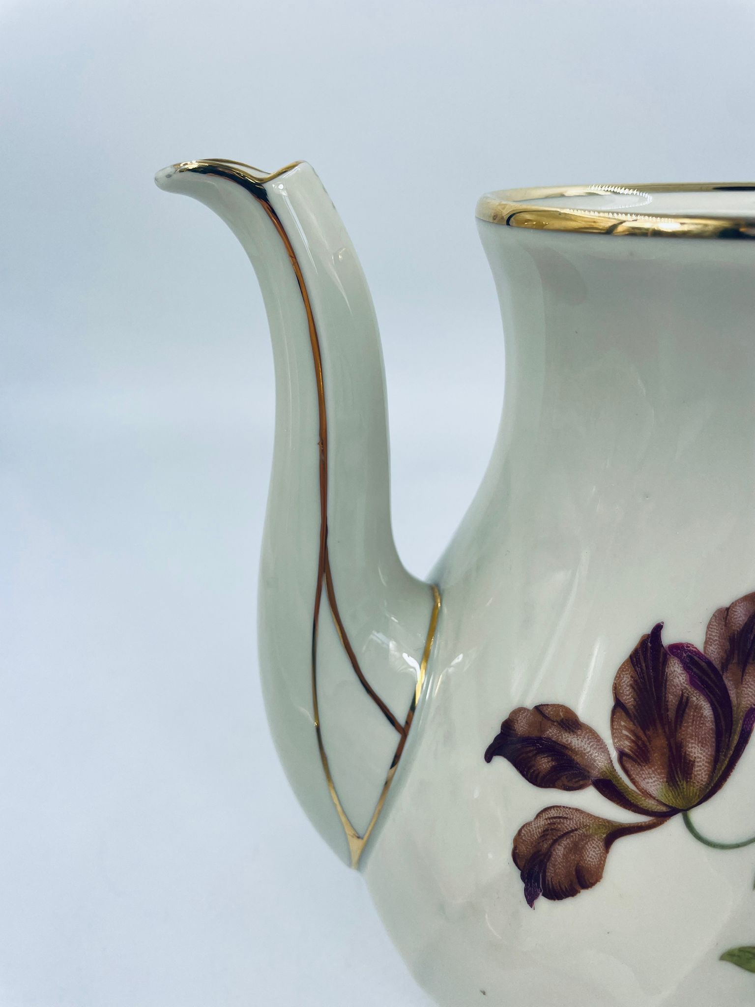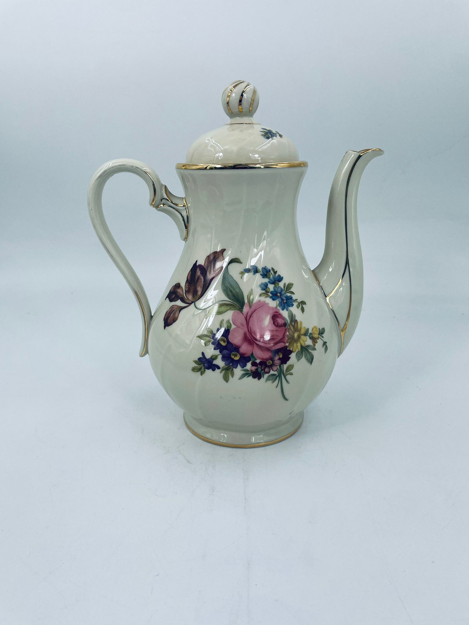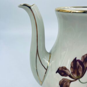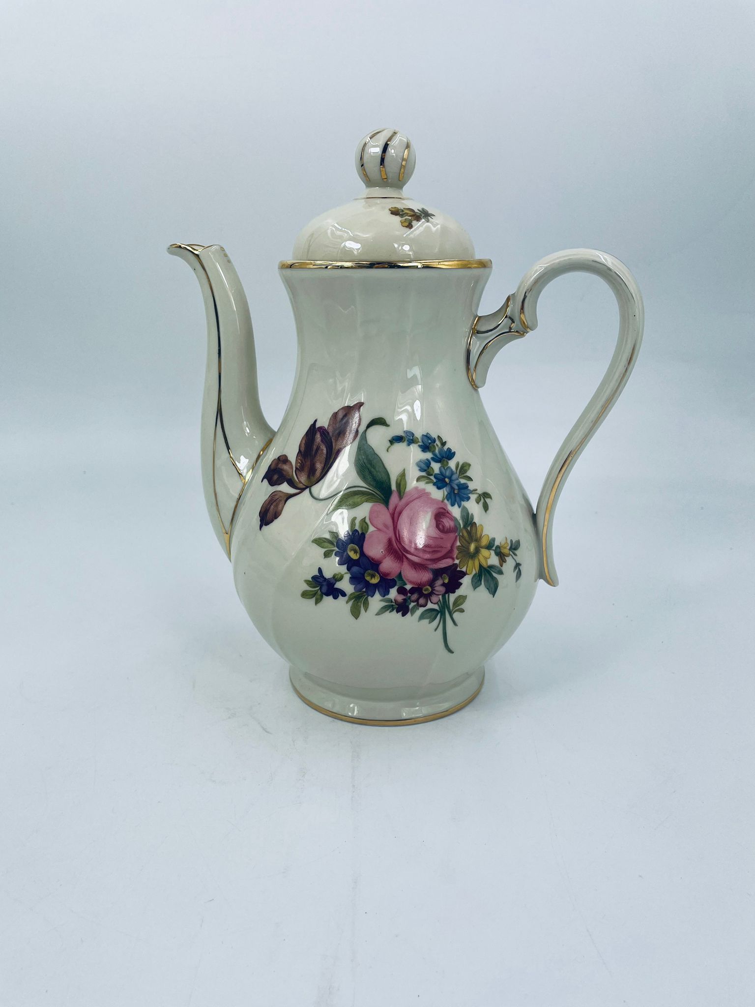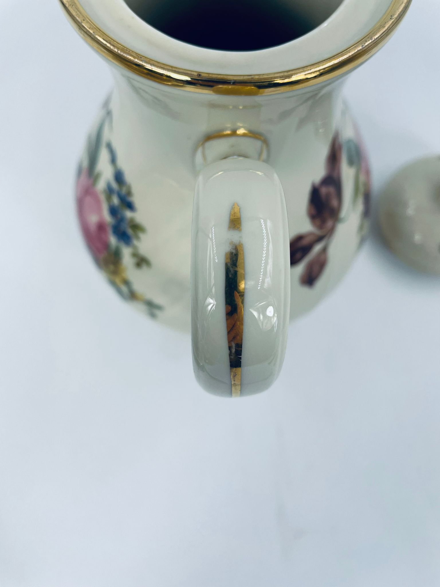 Porcelanowy dzbanek do herbaty manufaktury Kobenhavns Porcellains Malerii KPM. Piękny wzór kwiatów, kolor porcelany ecru, wykończone złoceniami na rantach.