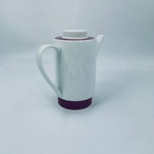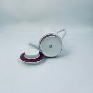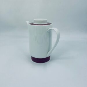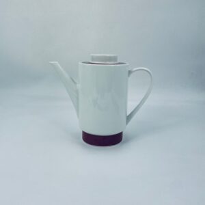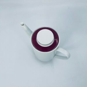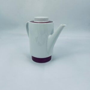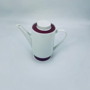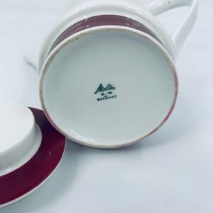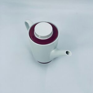 Dzbanek do herbaty/ kawy wytwórni Melitta z lat 70tych, wykonany z wysokiej jakości białej porcelany, zdobiony bordowym paskiem u podstawy i na pokrywie.