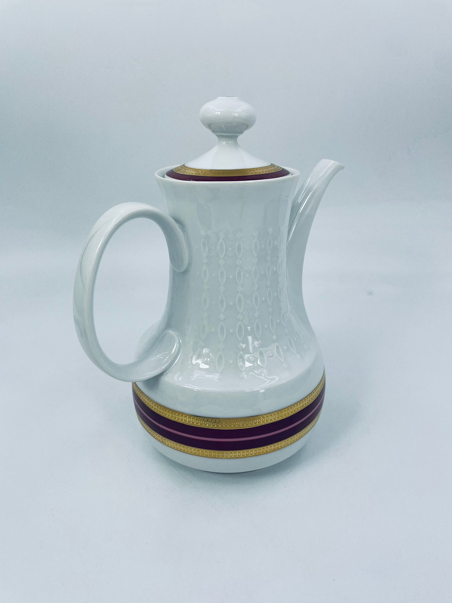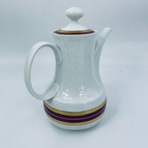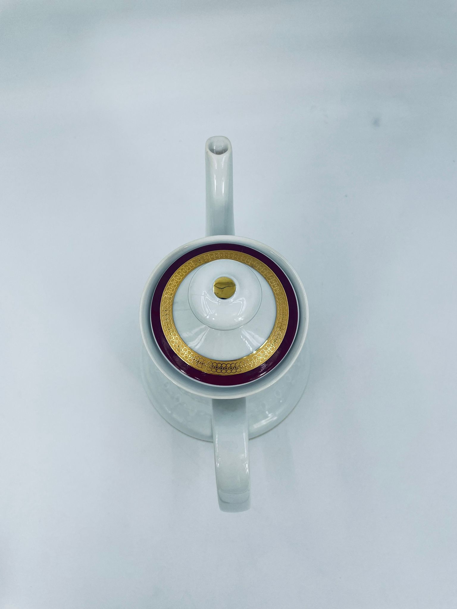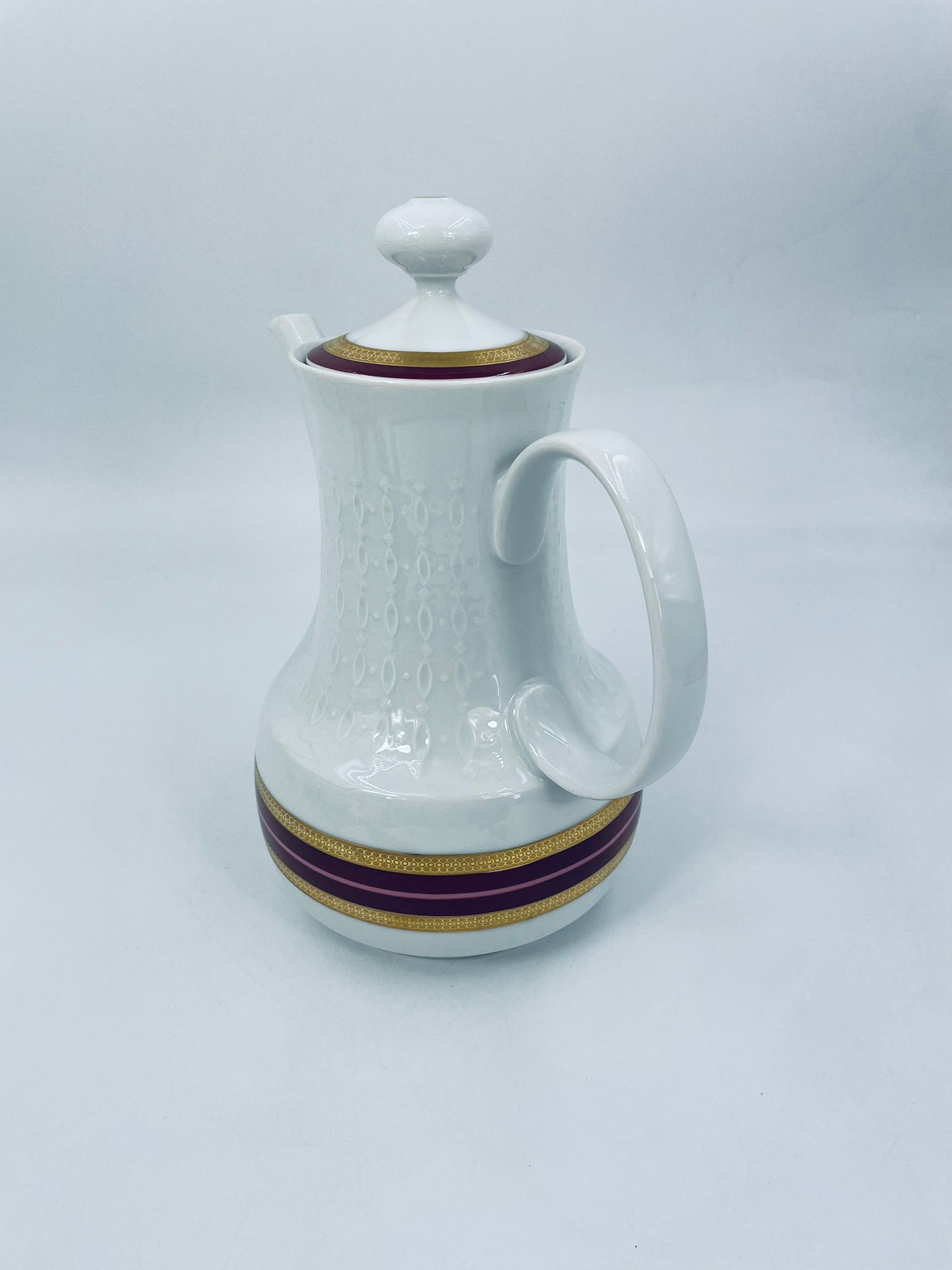 Porcelanowy dzbanek wytwórni Mitterteich Bavaria w kolorze białym, wykończony pięknym wzorem złoconym i kolorem bordowym.