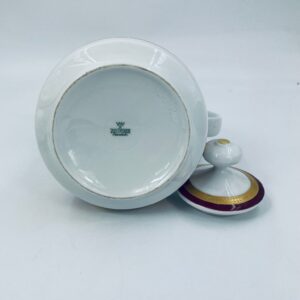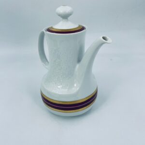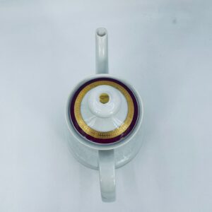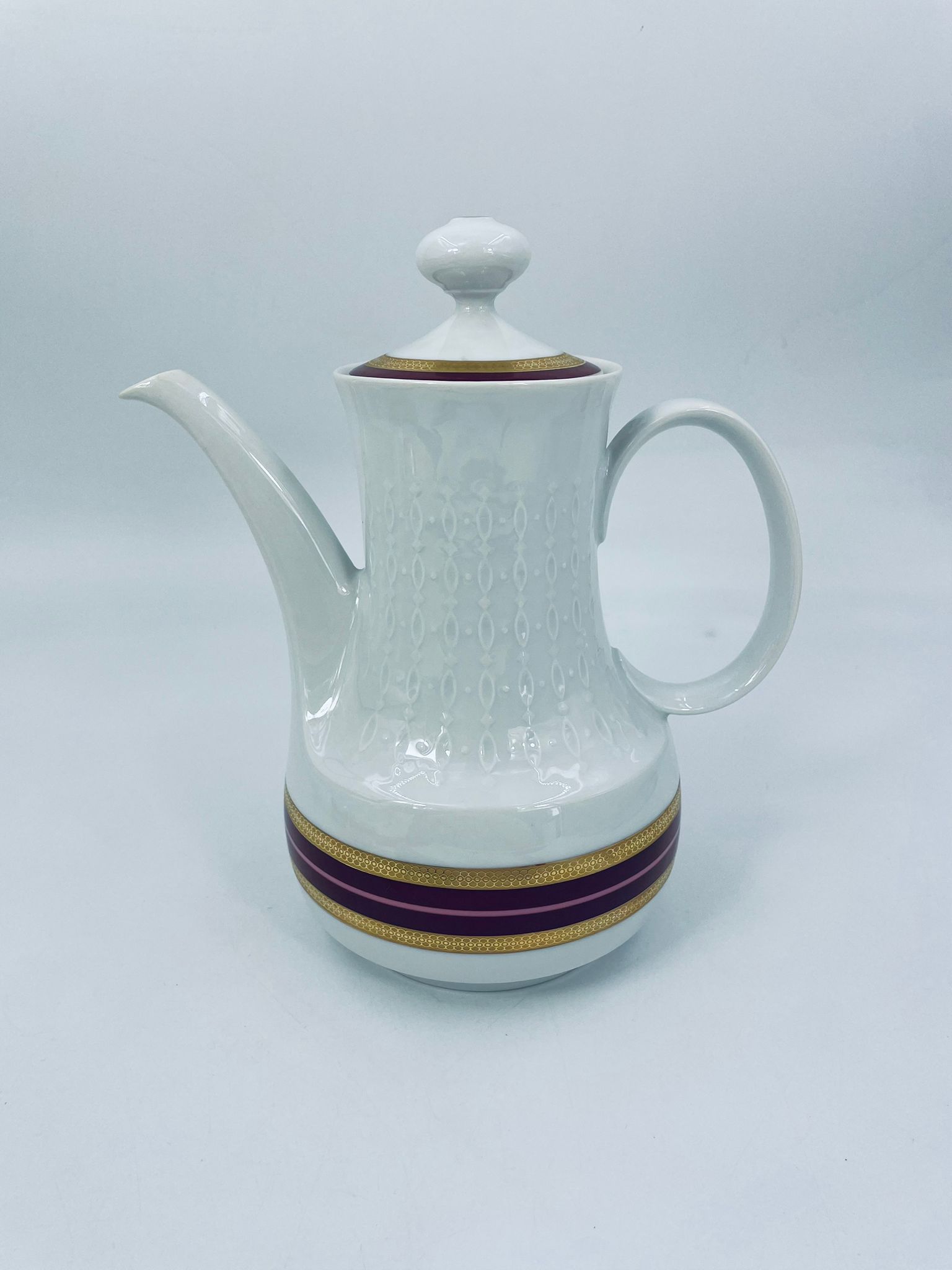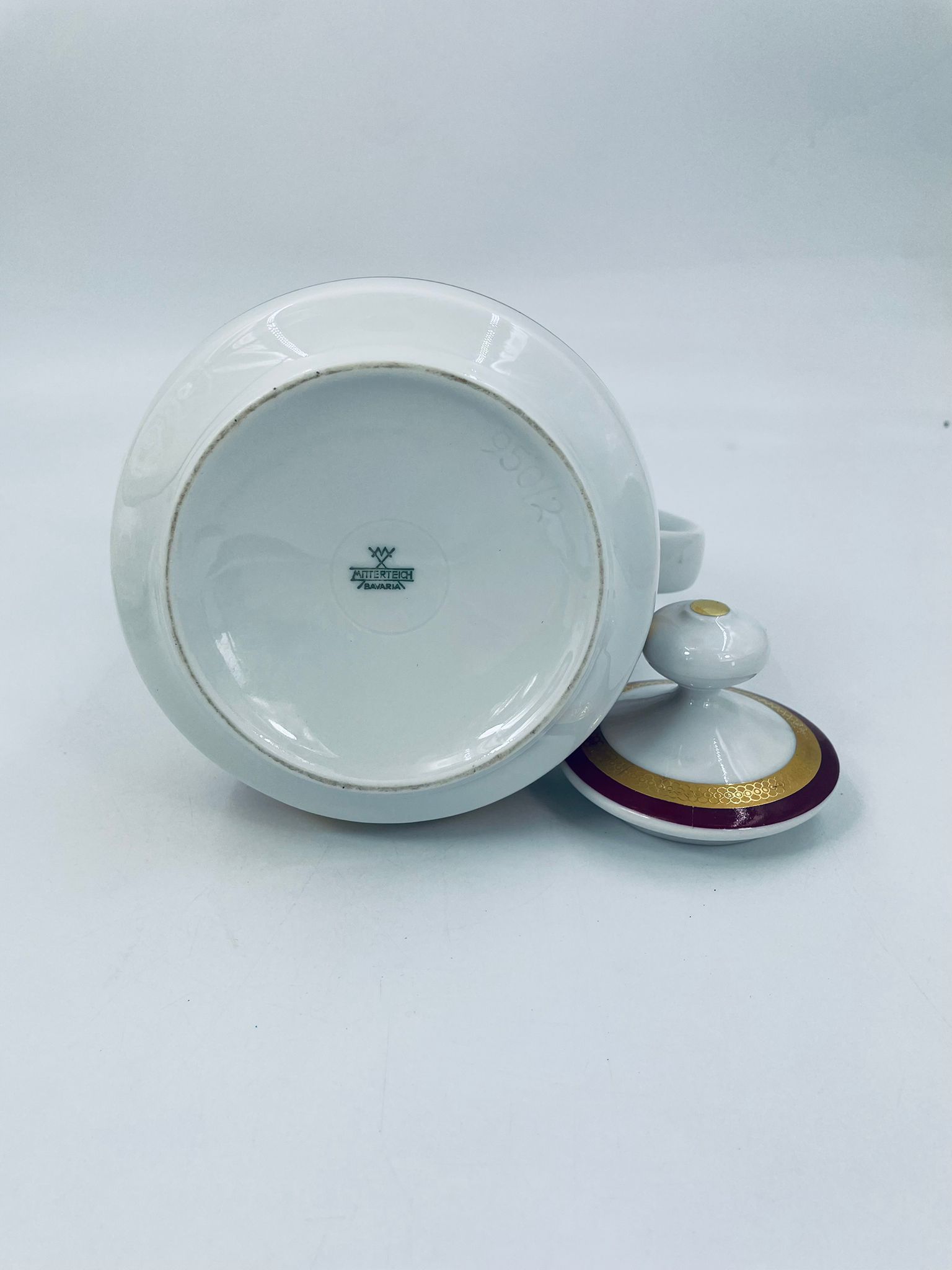 Porcelanowy dzbanek wytwórni Mitterteich Bavaria w kolorze białym, wykończony pięknym wzorem złoconym i kolorem bordowym.