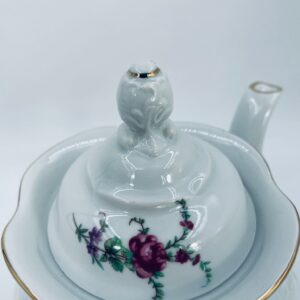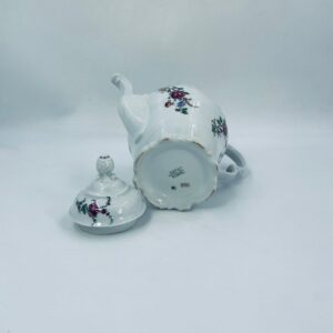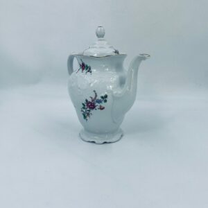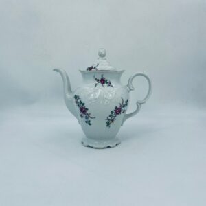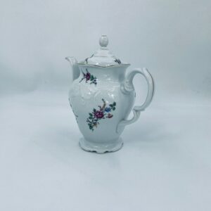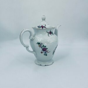 Dzbanek do herbaty Polskiej wytwórni Wawel, wykonany z wysokiej jakości białej porcelany. Dzbanek klasyczny o tradycyjnym kształcie , charakteryzuje się pięknym motywem kwiatowym, ozdobnymi reliefami, ozdobnym uchwytem oraz pokrywa, wykończony złoceniem na rantach.