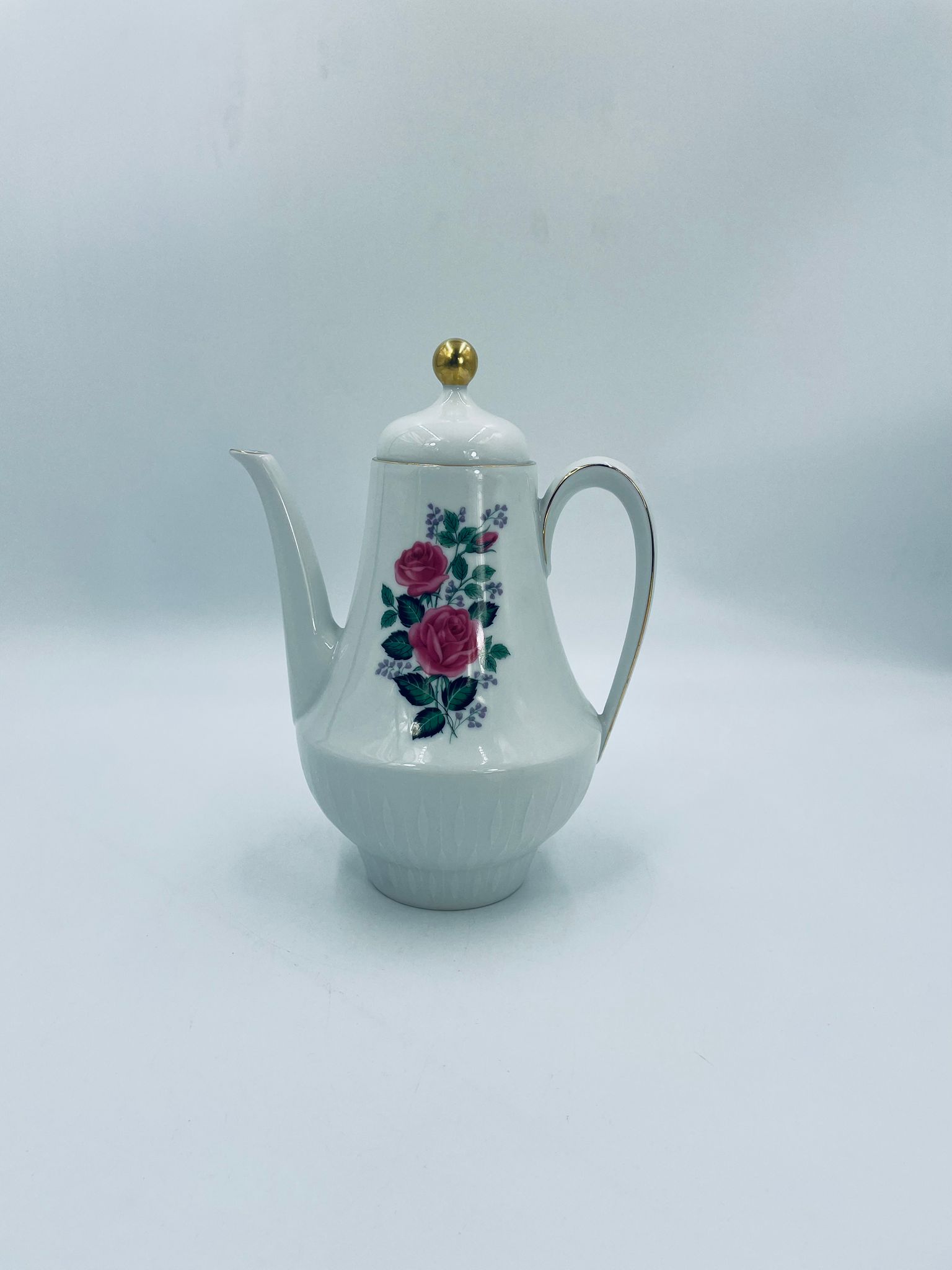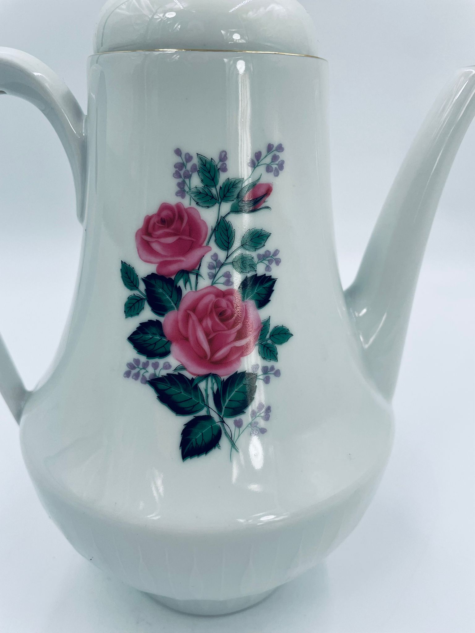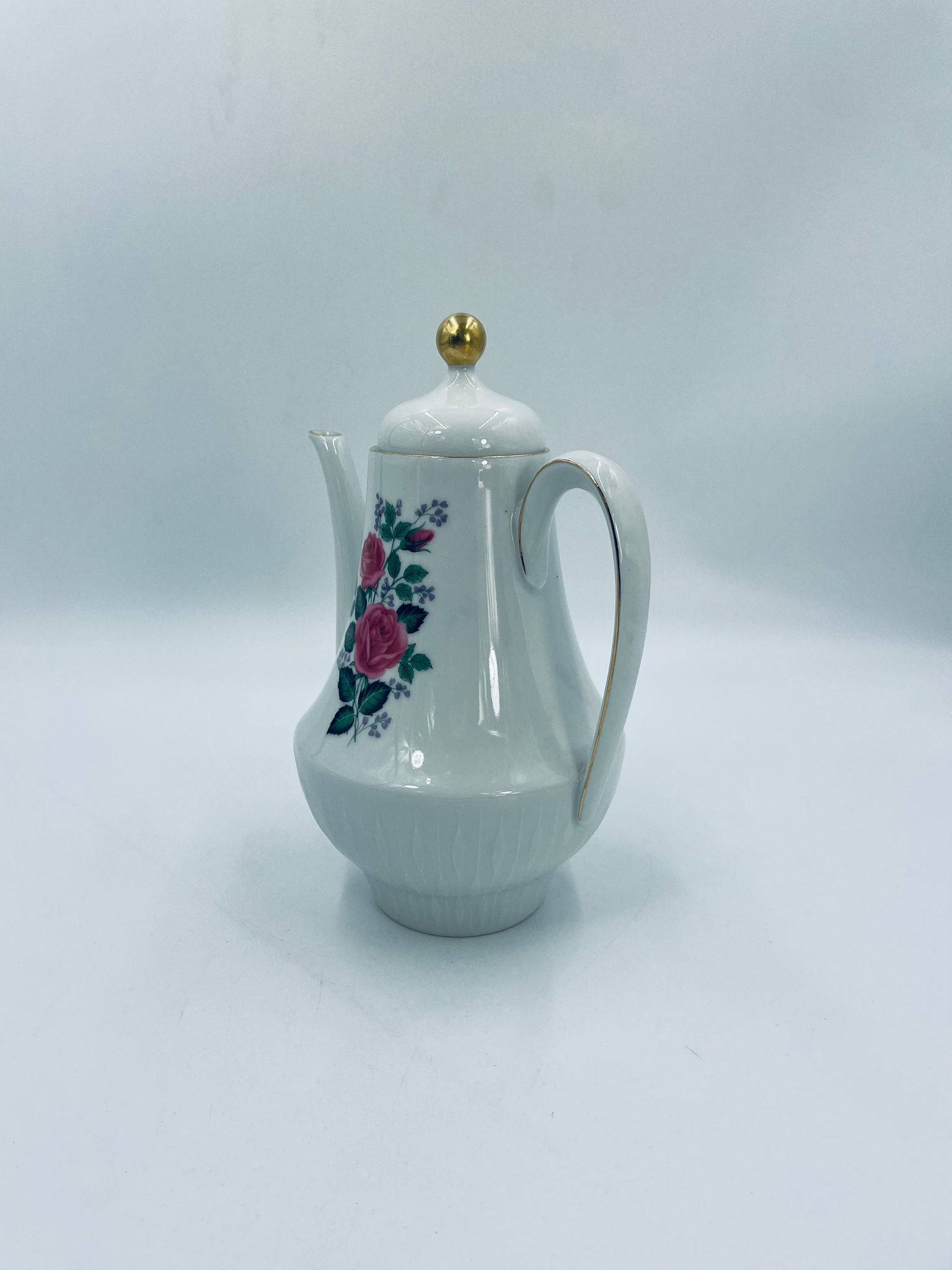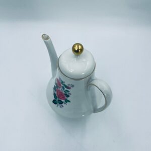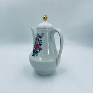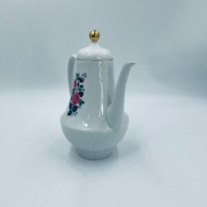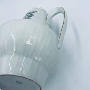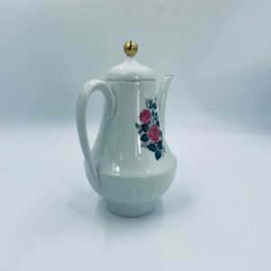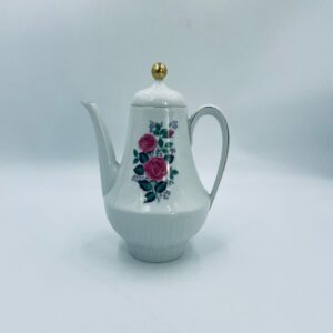 Dzbanek do herbaty wytwórni Scherzer Bavaria, wykonany z wysokiej jakosci białej porcelany. Dzbanek z wygiętą wylewką i uchwytem ze złotym paskiem oraz z pokrywa i złotym uchwytem. Ozdobiony jest dekoracją różowych róż, fioletowymi drobnymi kwiatkami i zielonymi listkami oraz dekoracyjną fakturą w dolnej części.