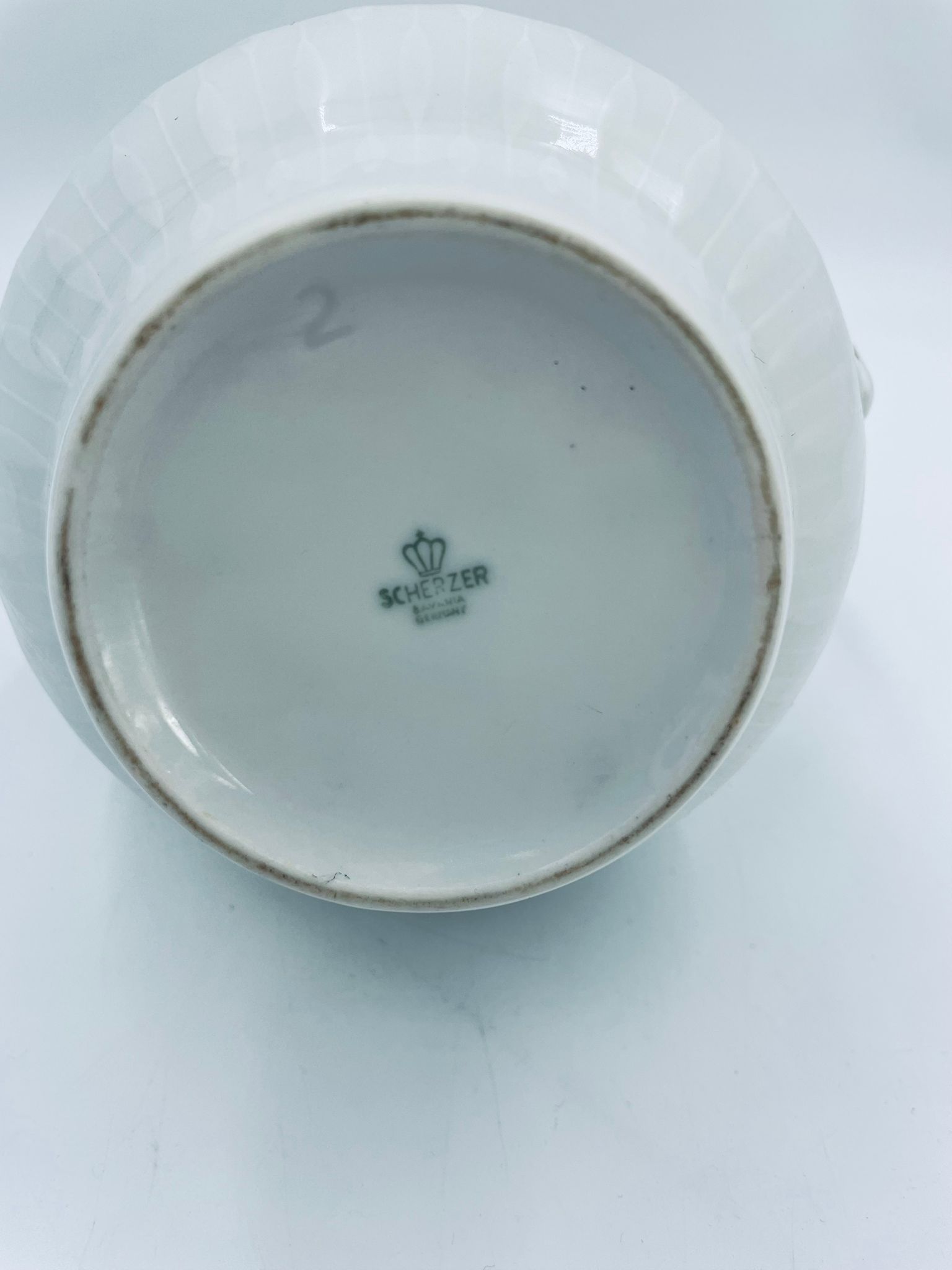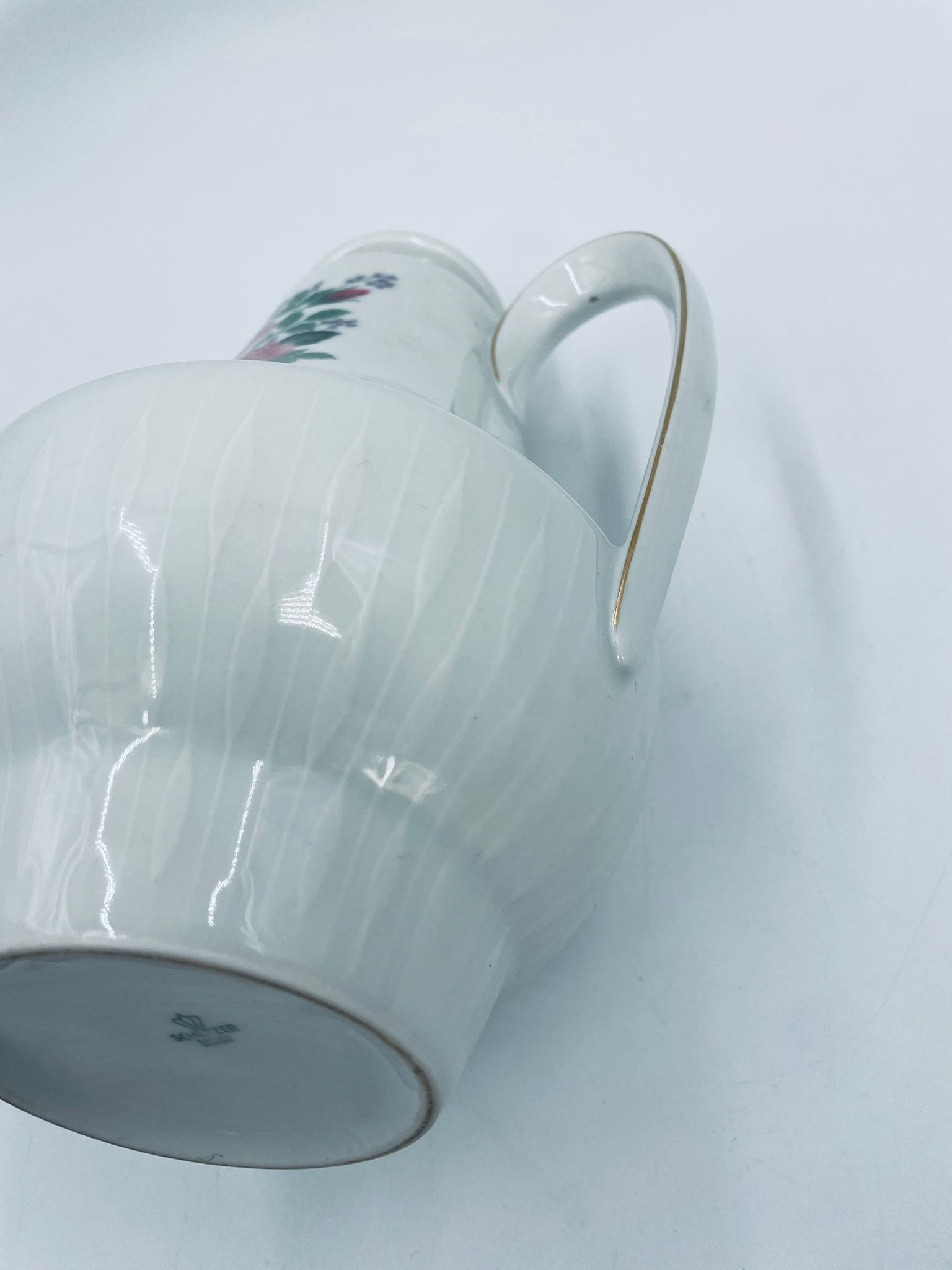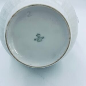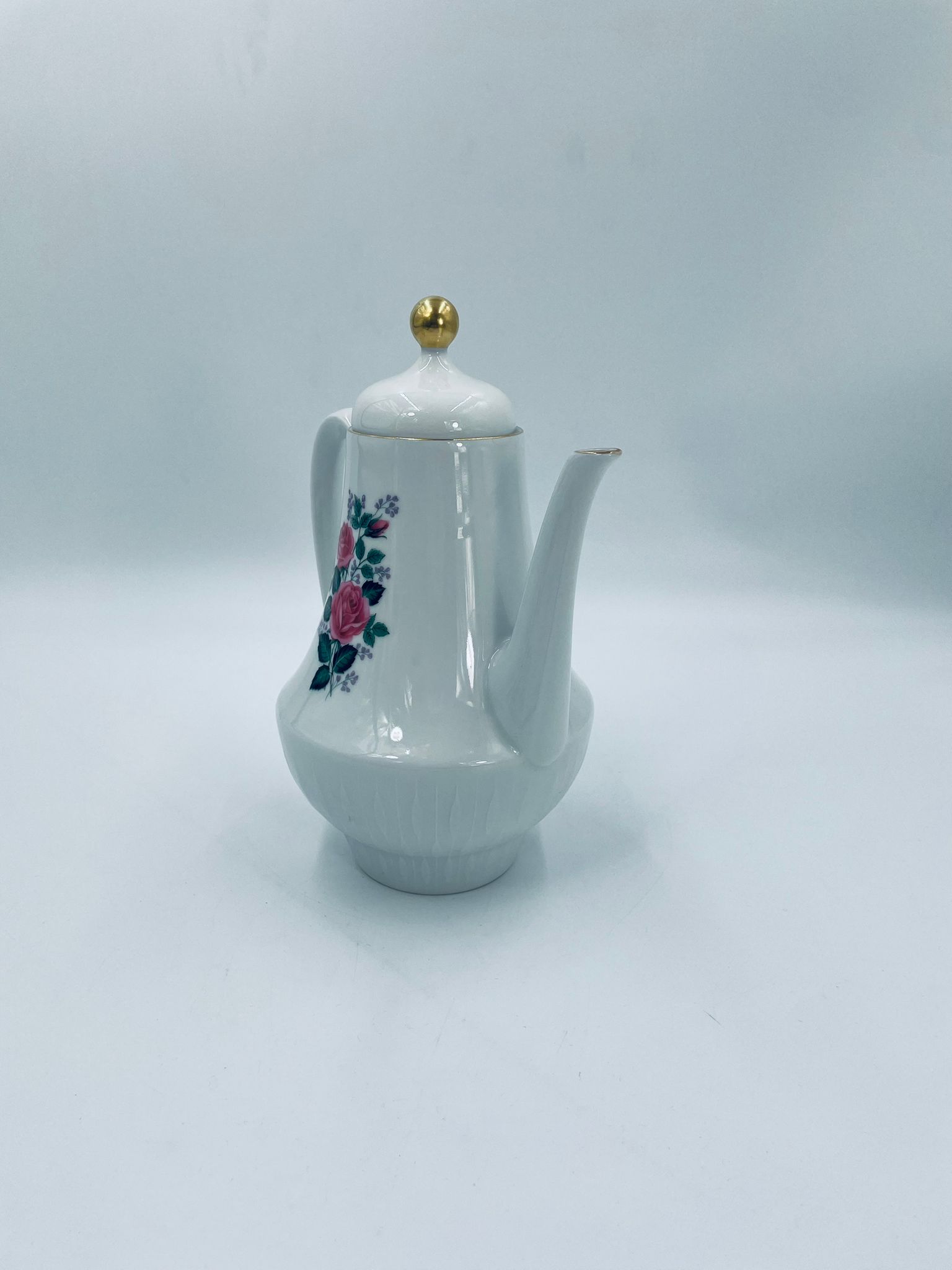 Dzbanek do herbaty wytwórni Scherzer Bavaria, wykonany z wysokiej jakosci białej porcelany. Dzbanek z wygiętą wylewką i uchwytem ze złotym paskiem oraz z pokrywa i złotym uchwytem. Ozdobiony jest dekoracją różowych róż, fioletowymi drobnymi kwiatkami i zielonymi listkami oraz dekoracyjną fakturą w dolnej części.